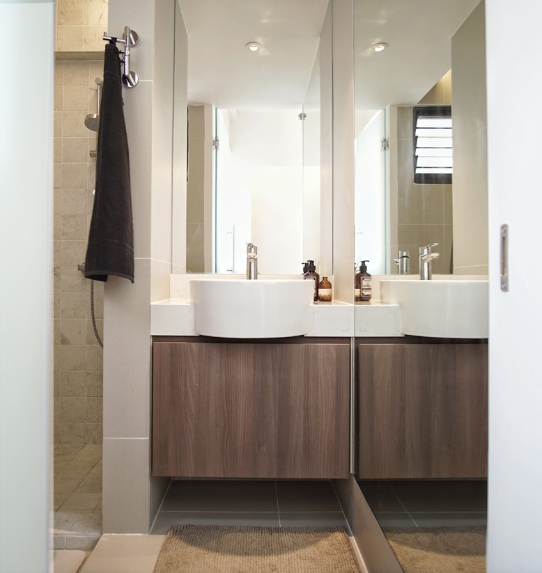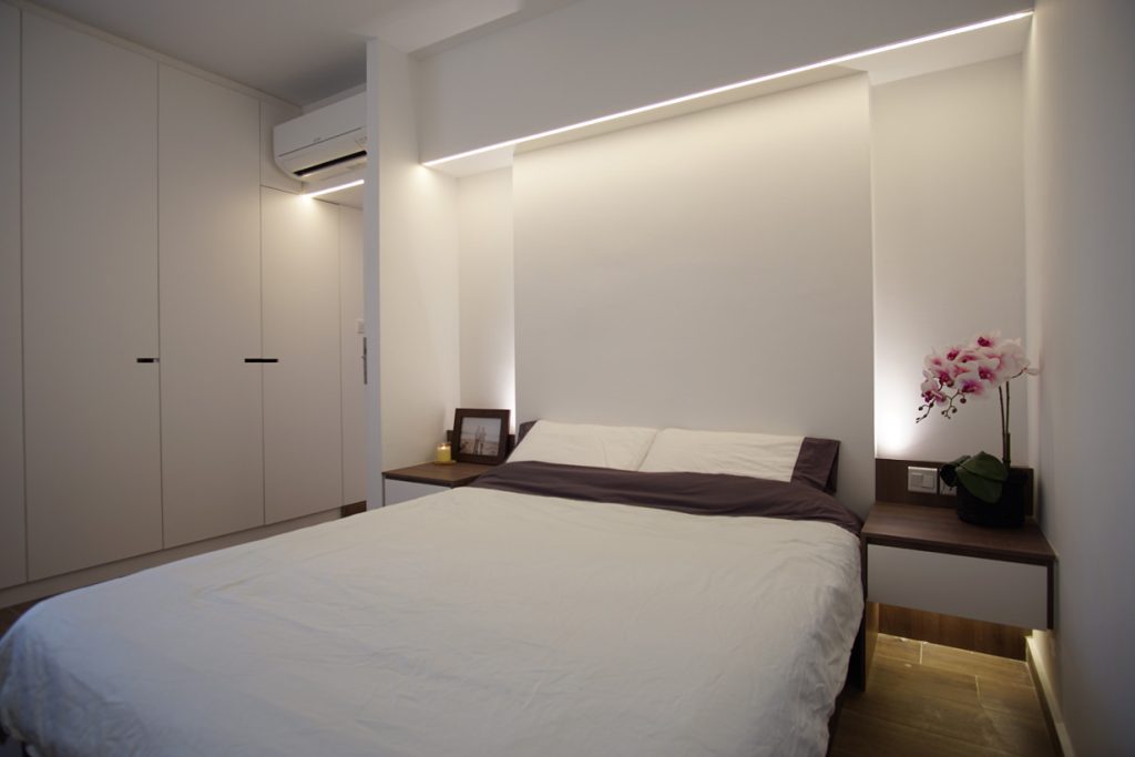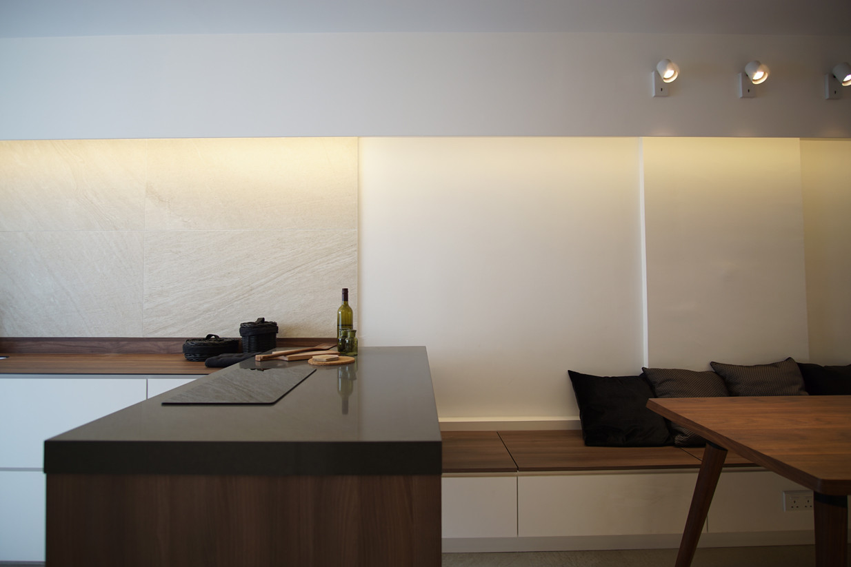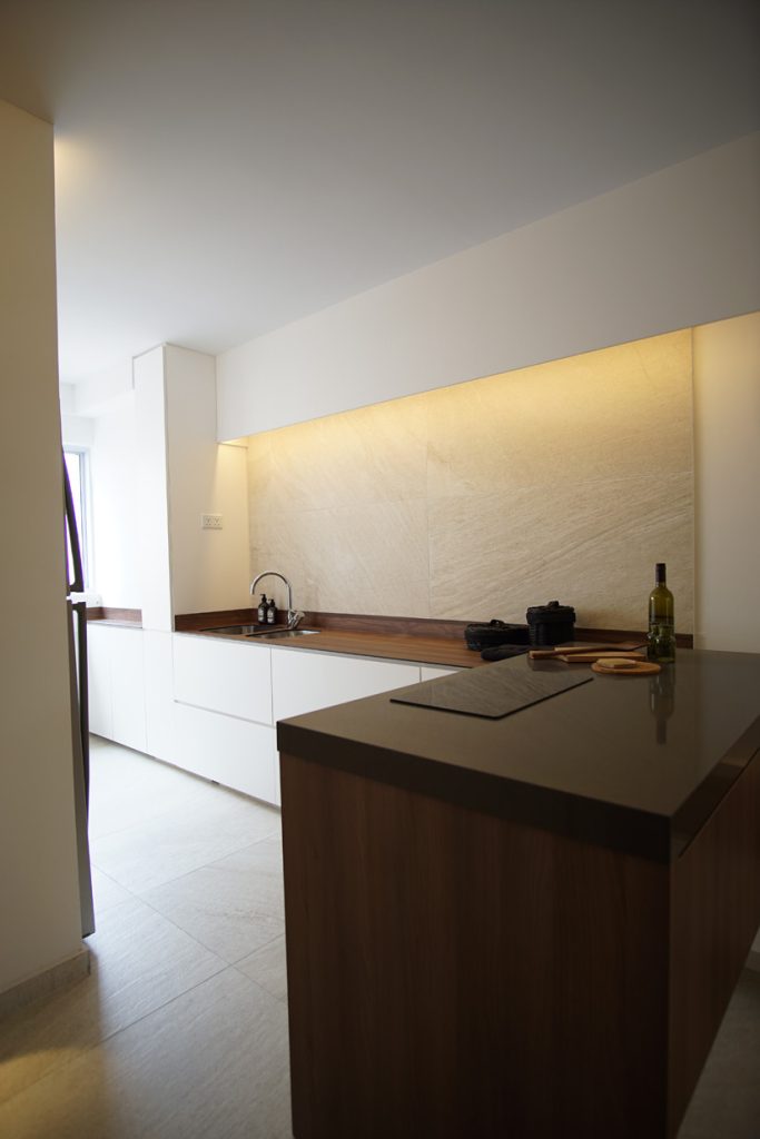 The space is linearized by the intention removal of all walls to create a space that flowed accordingly to functionality. All unnecessary distractions are removed and only clean lines are allowed on ceilings, walls and carpentry. The introduction of parallel lines in the form of specially crafted folding and sliding doors in the living area is a surprising contrast to the space and unexpectedly balances and relaxes. It doubles up as a feature wall for the dry pantry as well as fulfills geomancy requirements, shielding the main door in an elegant way.
