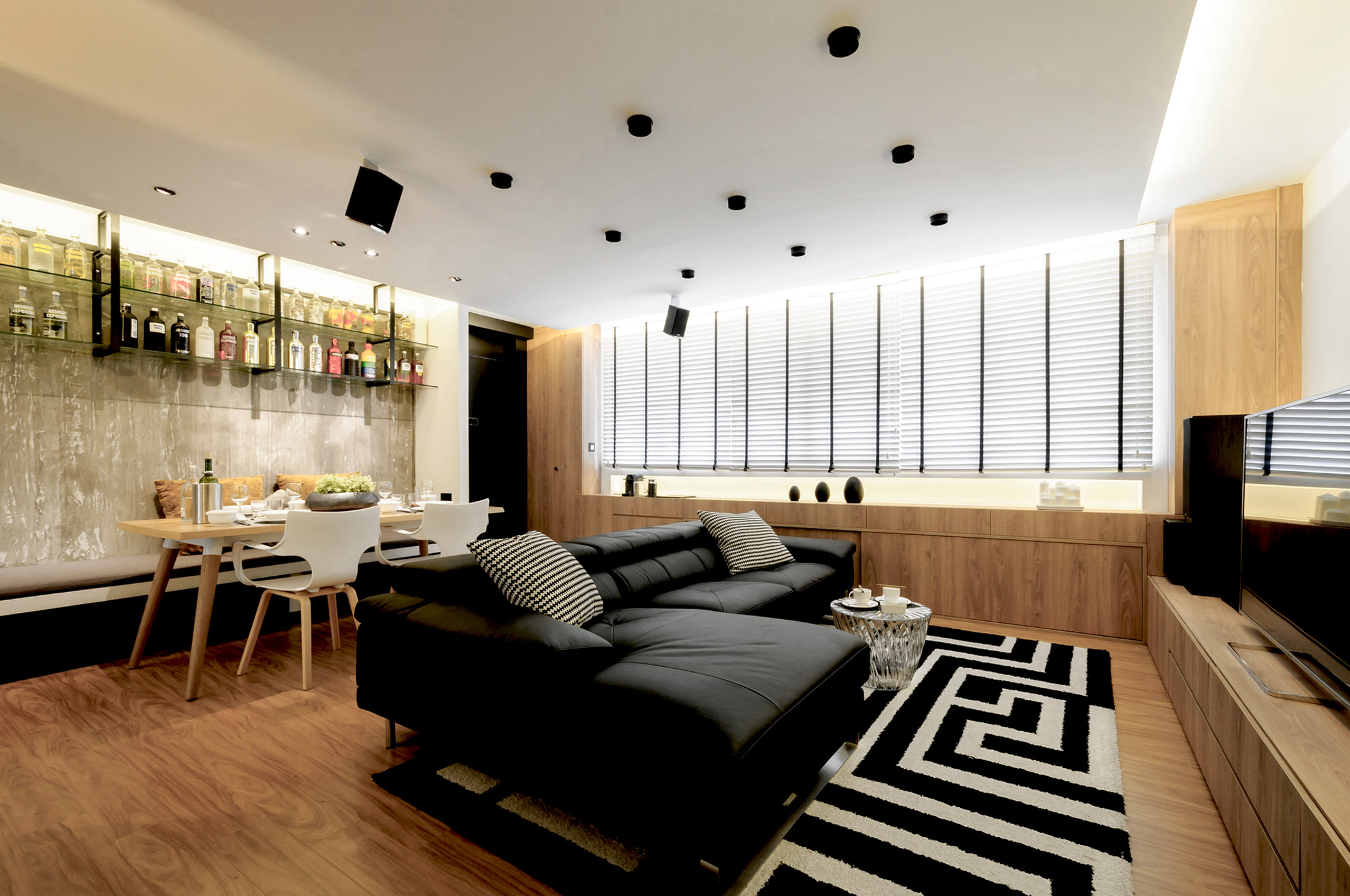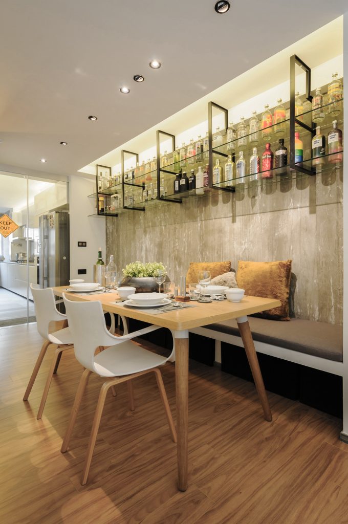The dining area transforms into a conference room when required. As a reflection of my client’s personality, A real concrete wall was chosen as a bold backdrop with a customized overhanging Vodka Collection display.