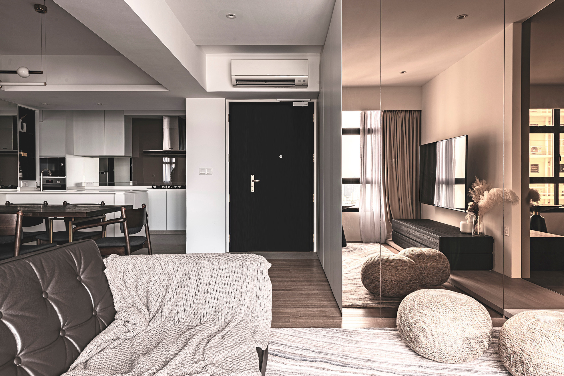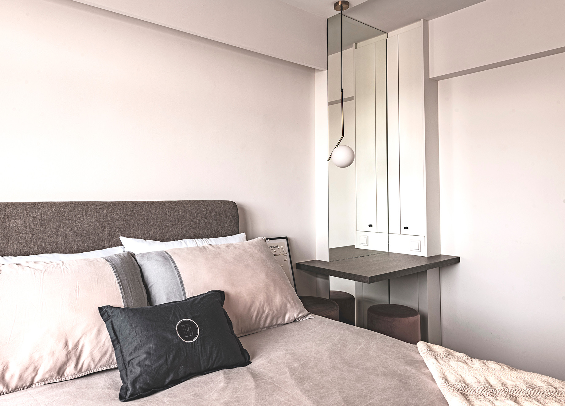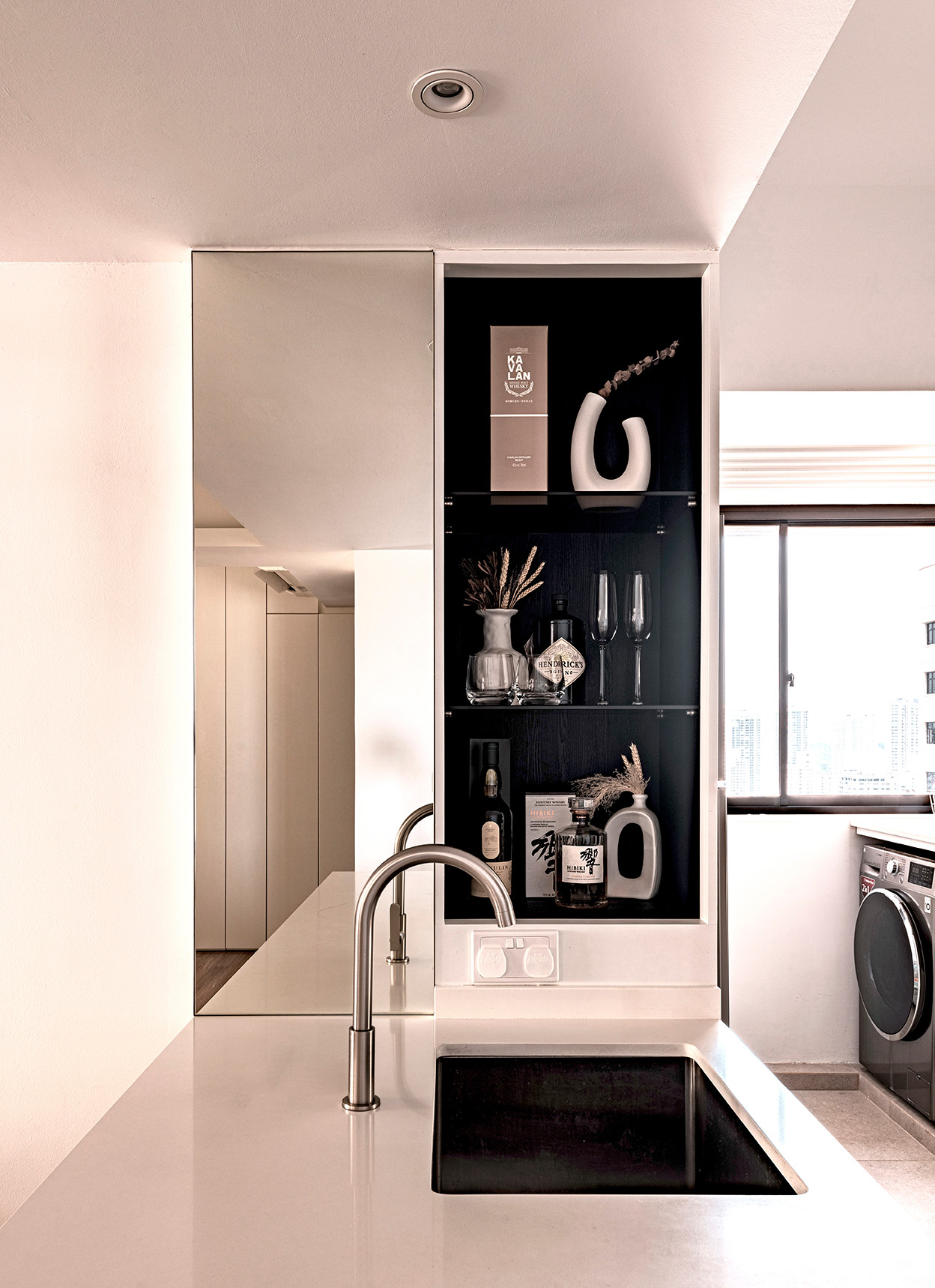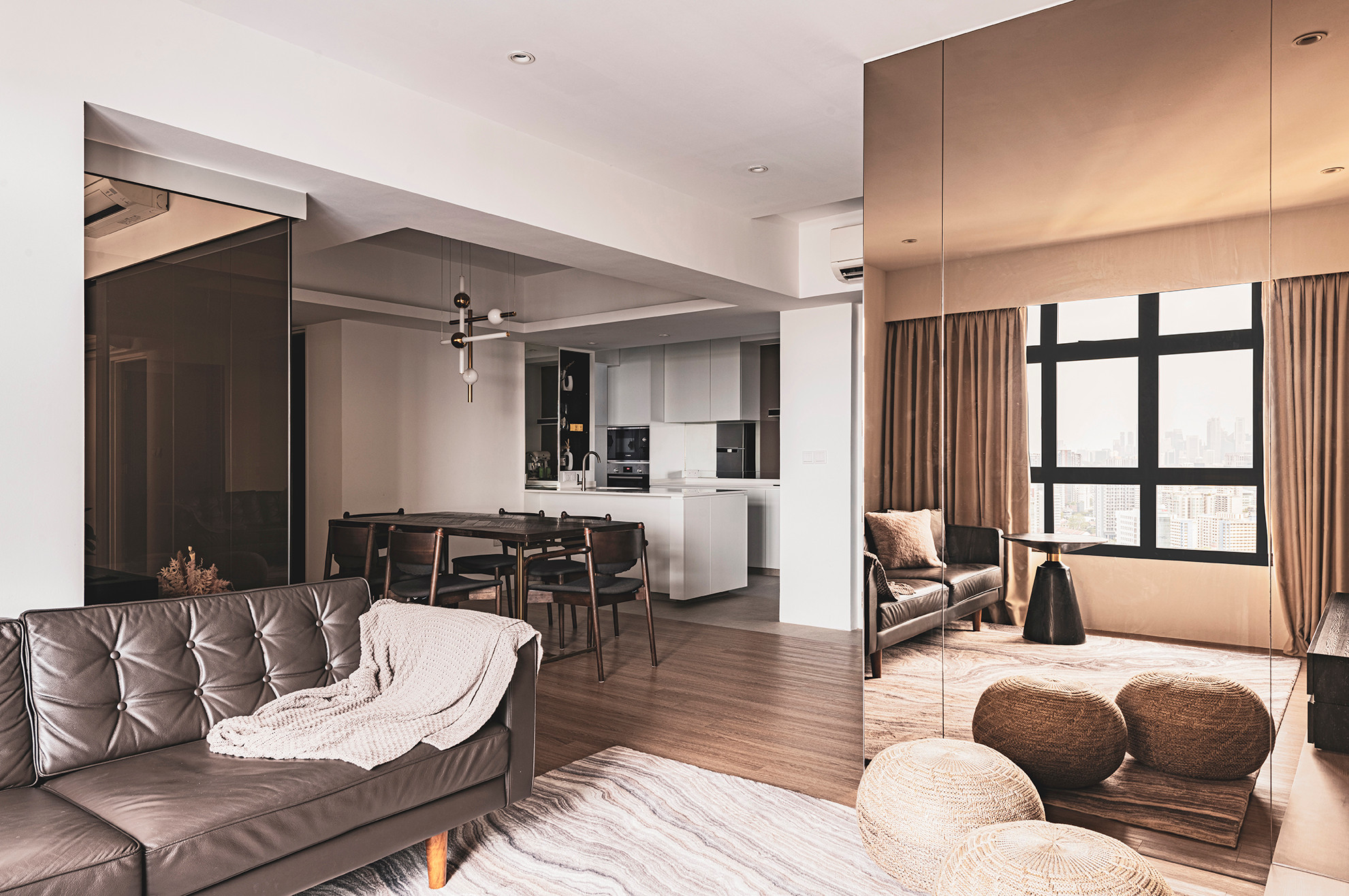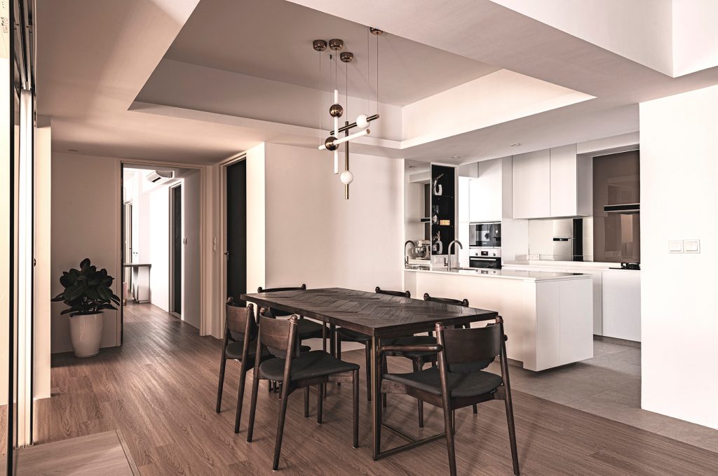 The owners wanted a bigger living space as they often host gatherings and hence we merged the kitchen, dining and living areas together to form an integrated space & also reduced the size of the study and child’s room to open up the dining area a bit more.