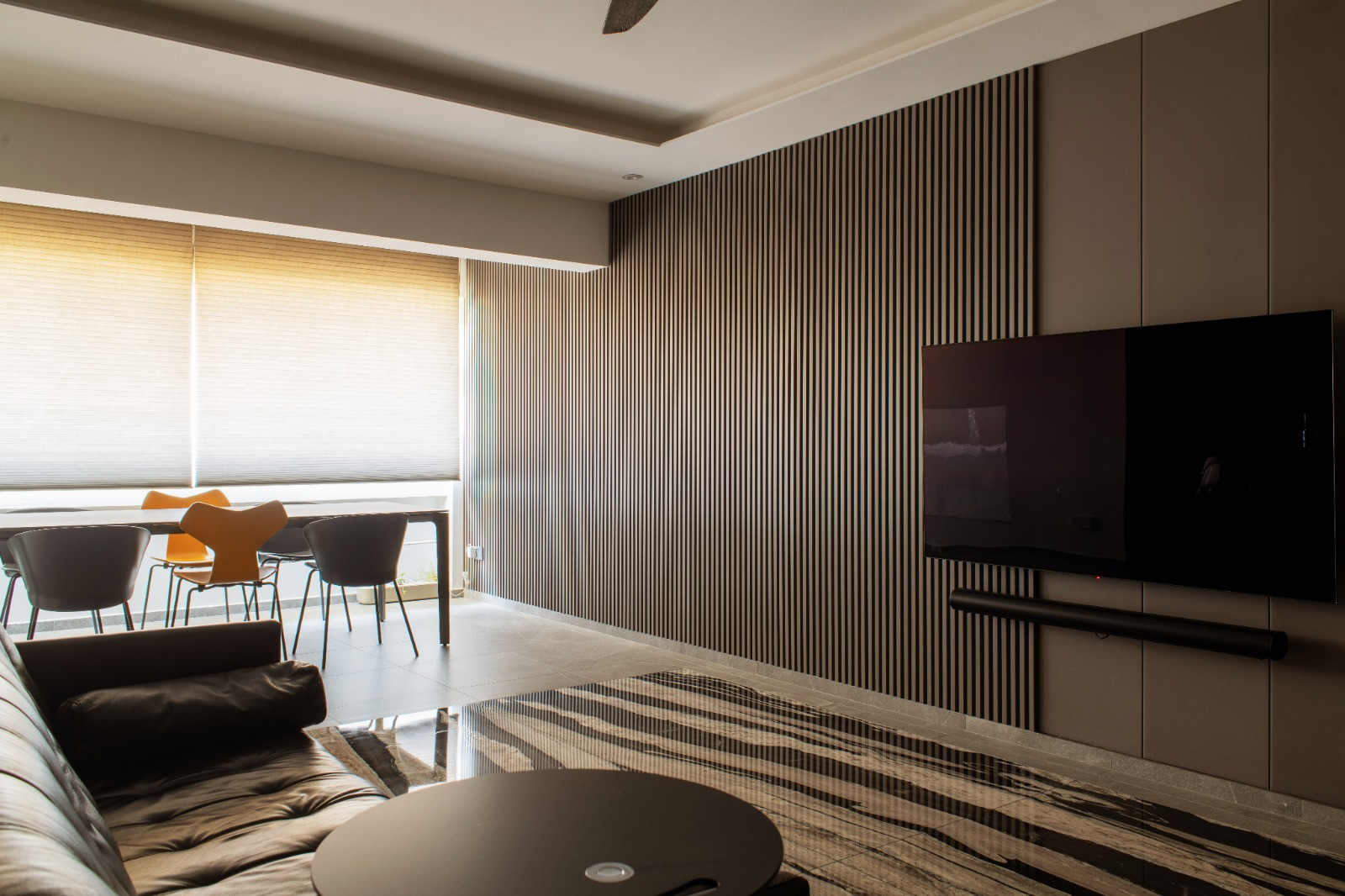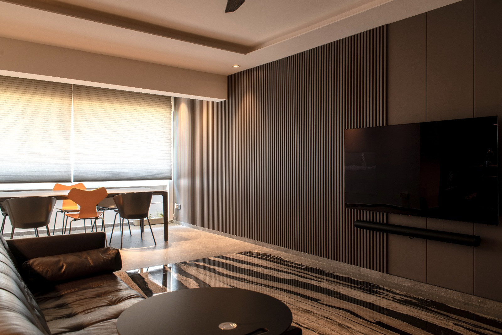 The design brief was to make the living area clutter free and party ready as they often have guests over but at the same time they do love to shop and have accumulated a lot of things and require ample storages to house them properly.