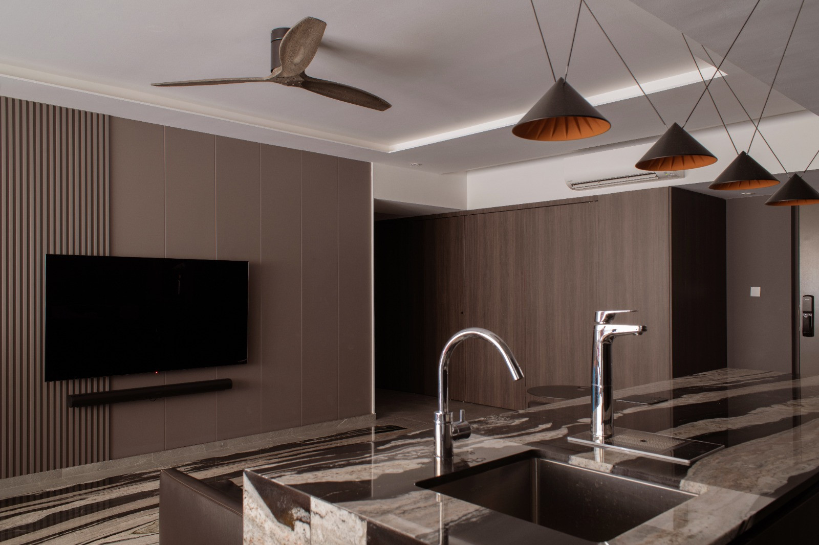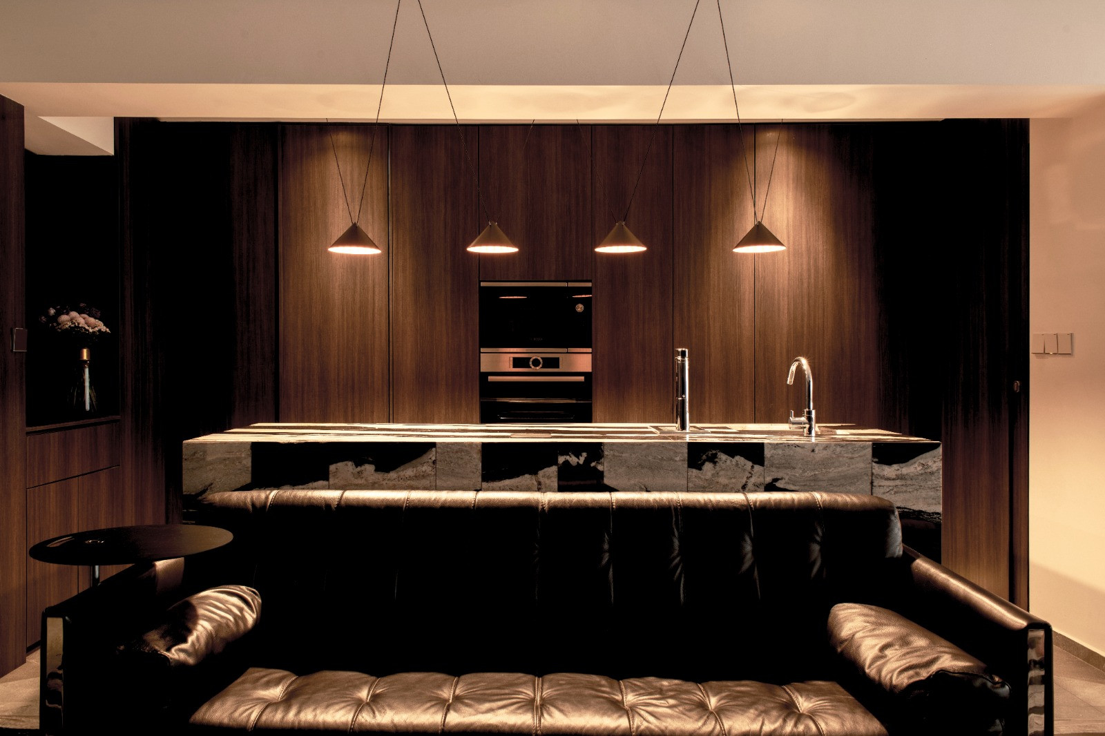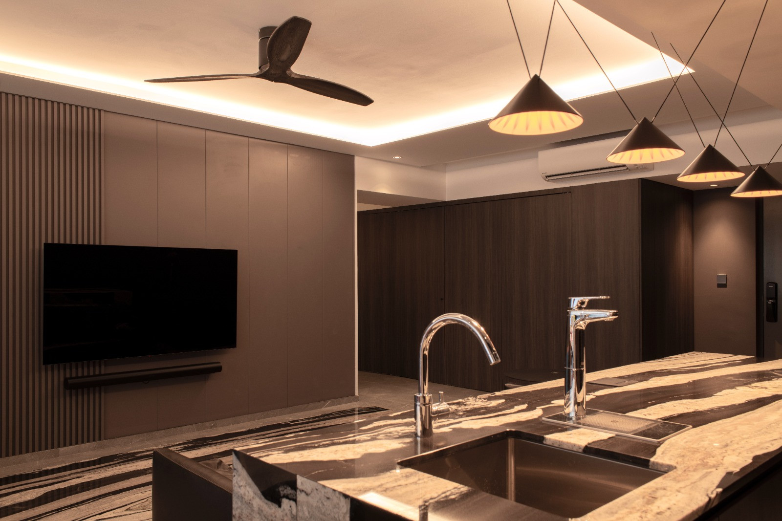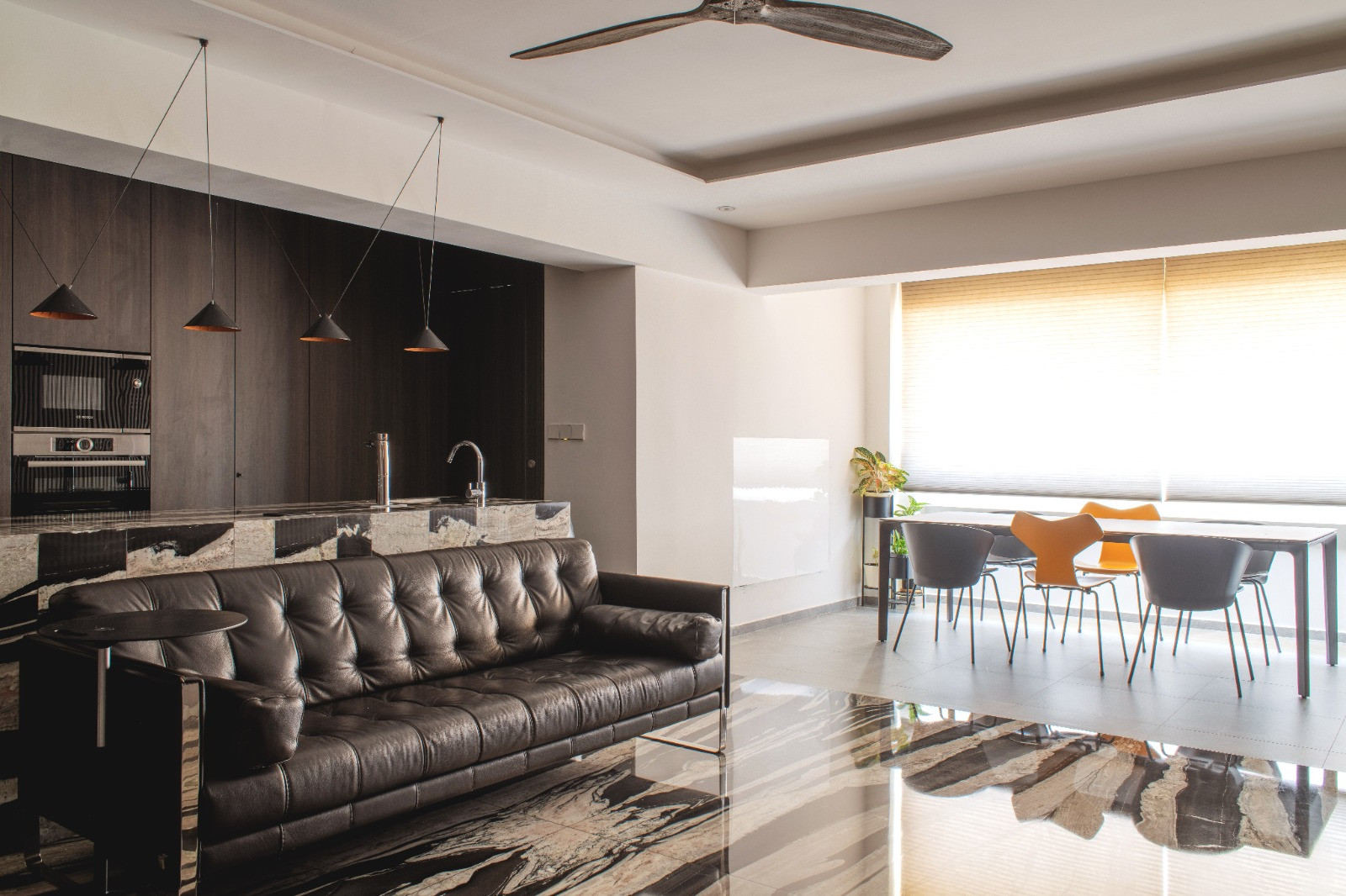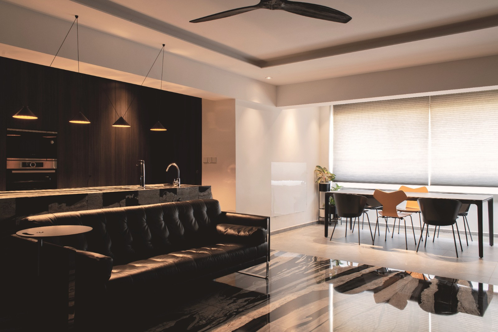 Entering the house, you will be greeted with a spacious living area that is integrated with a dry kitchen with an island. The island is completely constructed with dark natural stone and the nature stone was also incorporated into the flooring in front of the island to mimic a carpet but sans the hassle for cleaning. It defines the living area and is a centerpiece of the house design.