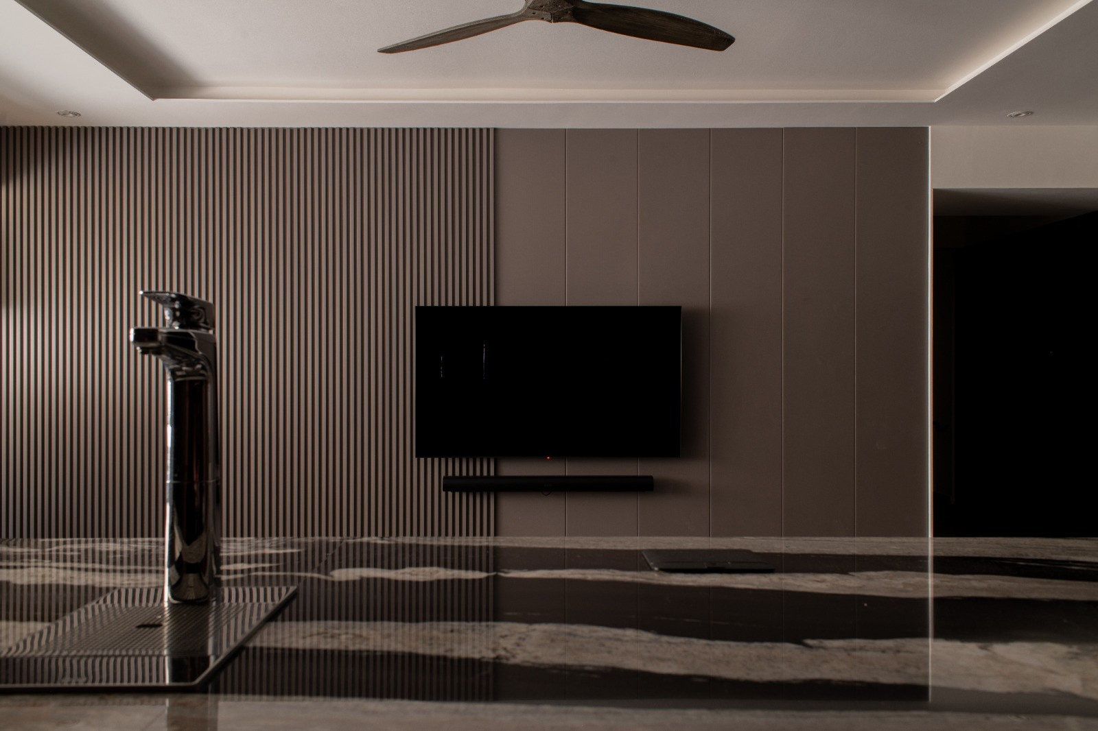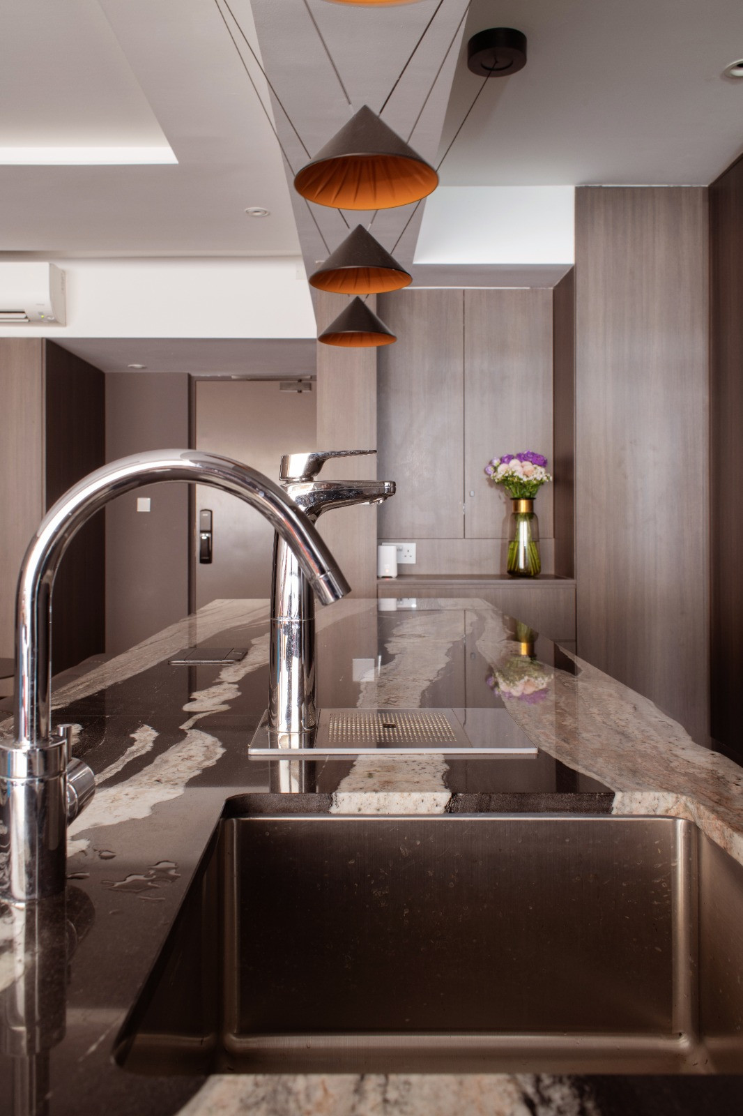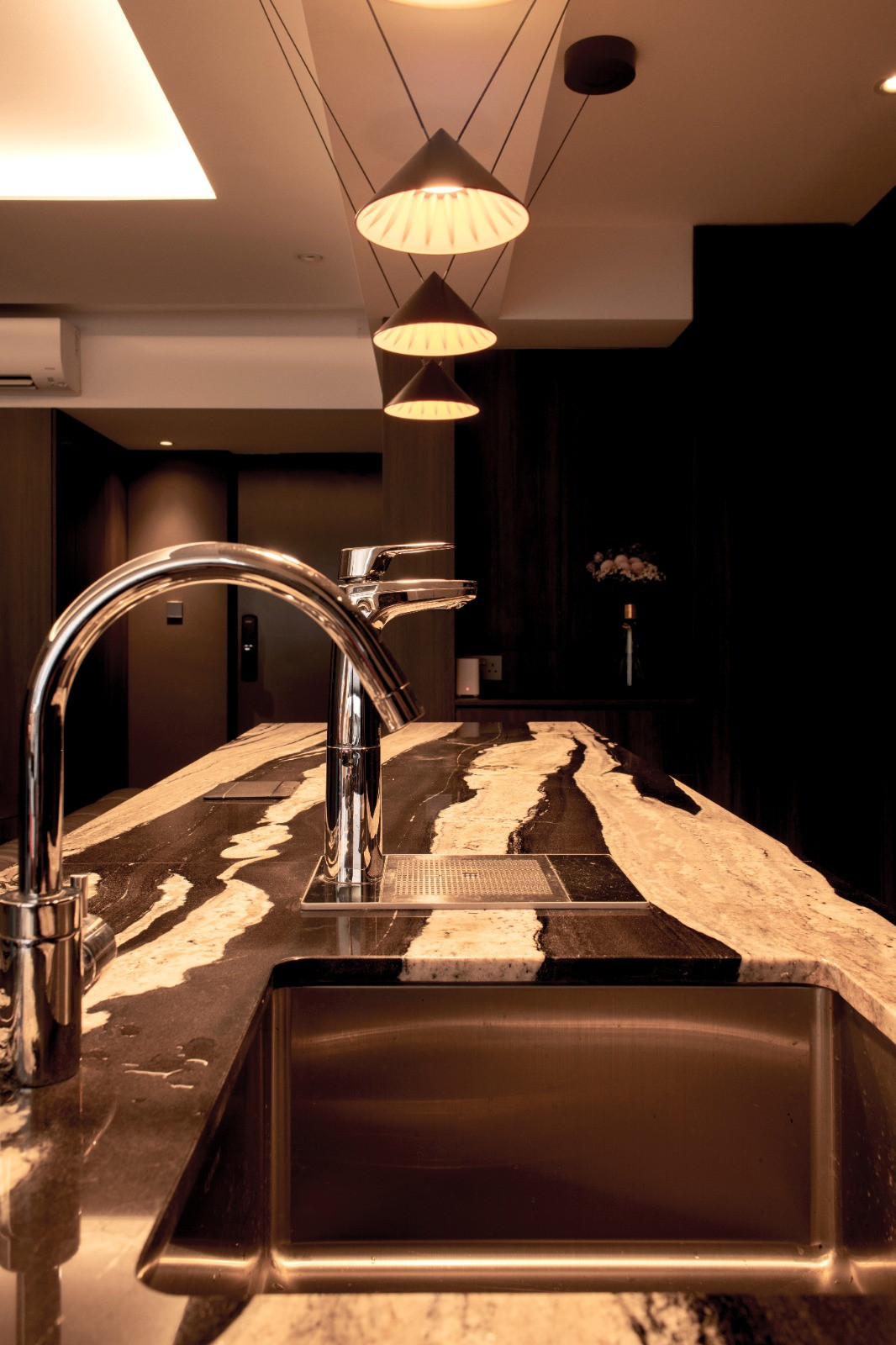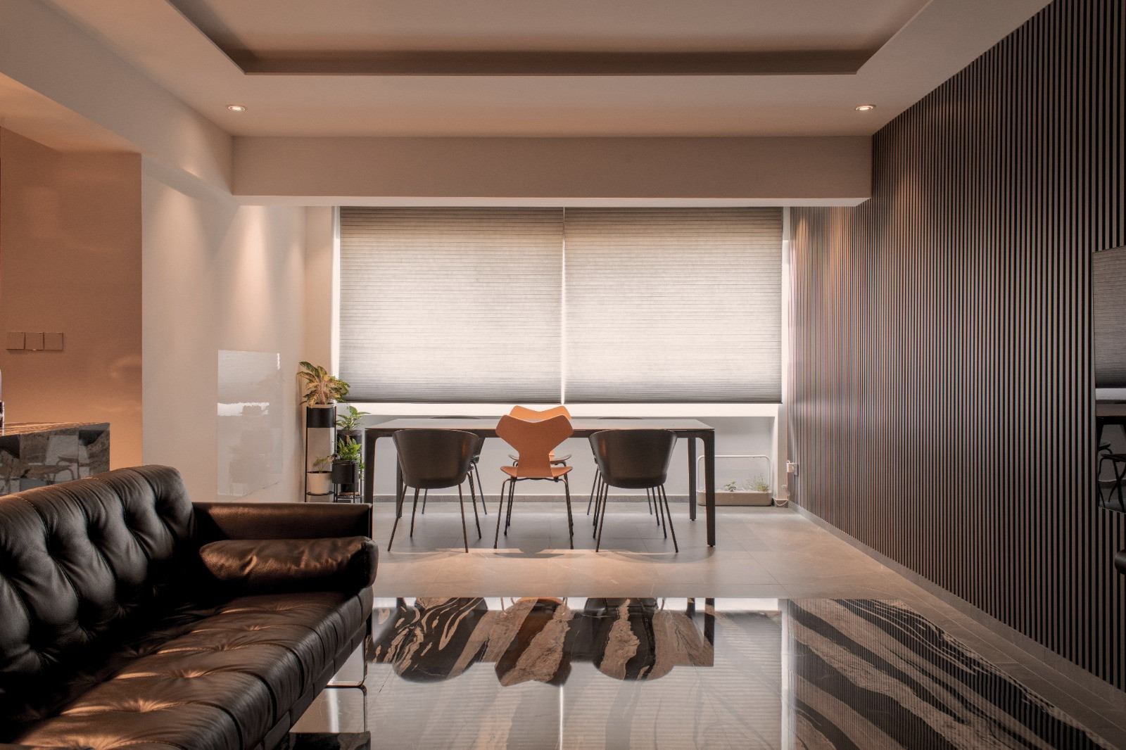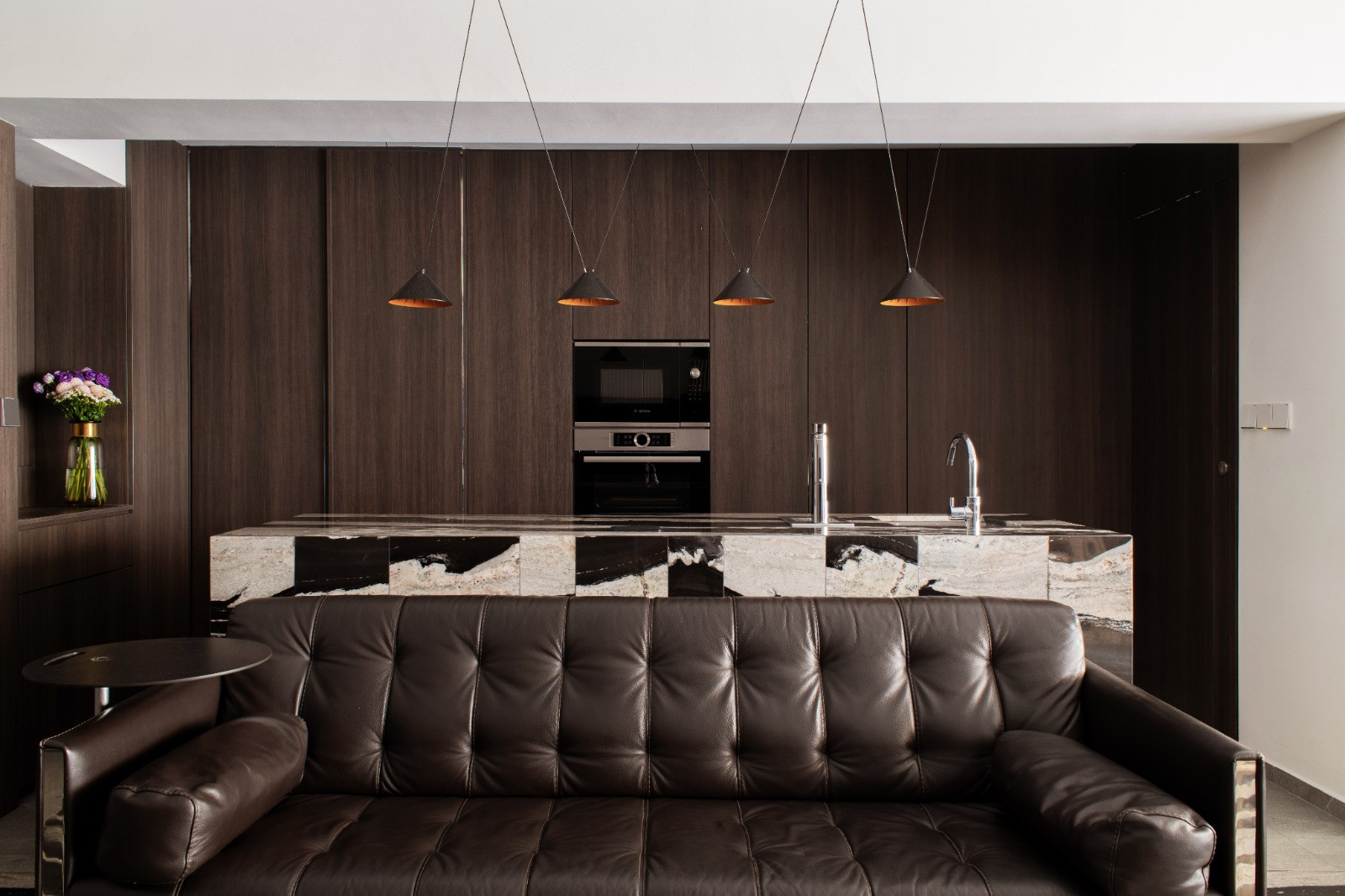 Entering the house, you will be greeted with a spacious living area that is integrated with a dry kitchen with an island. The island is completely constructed with dark natural stone and the nature stone was also incorporated into the flooring in front of the island to mimic a carpet but sans the hassle for cleaning. It defines the living area and is a centerpiece of the house design.