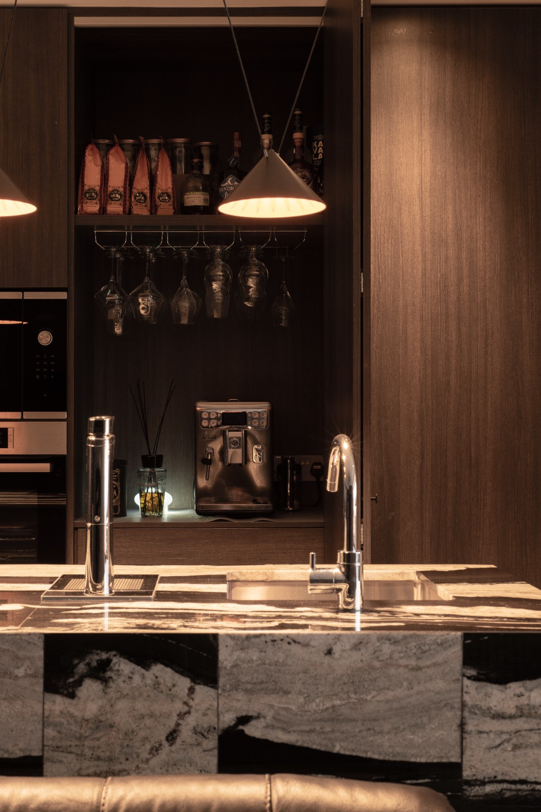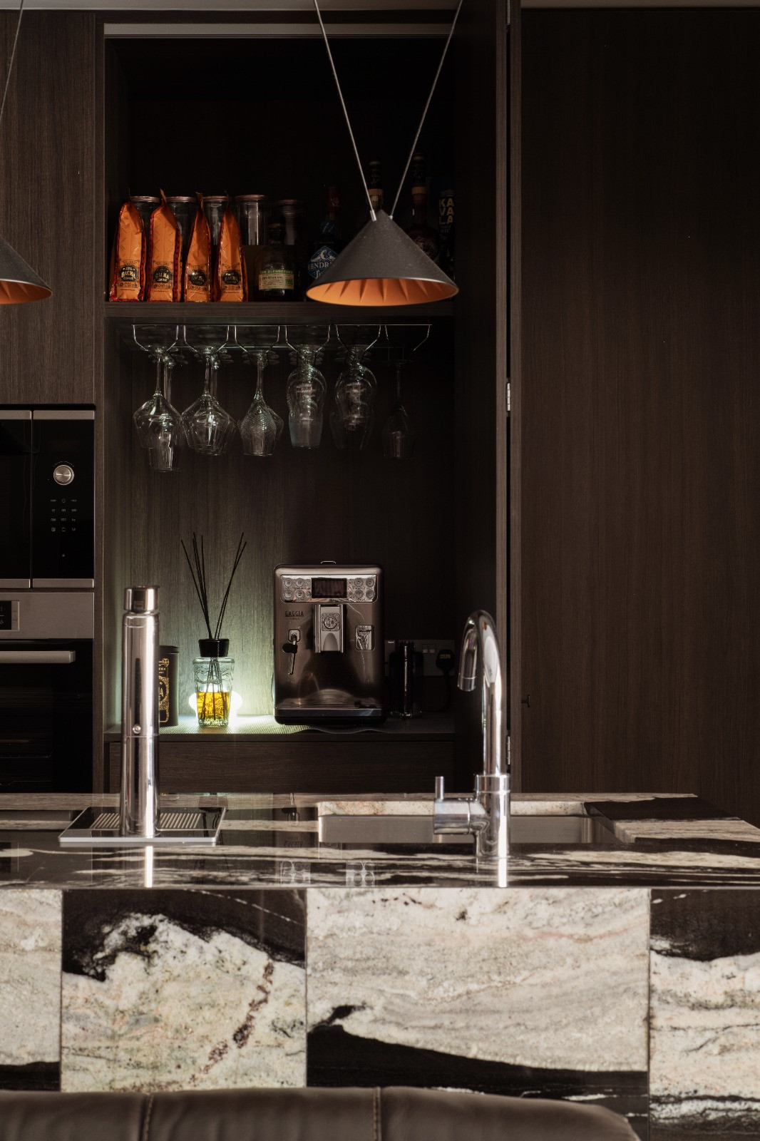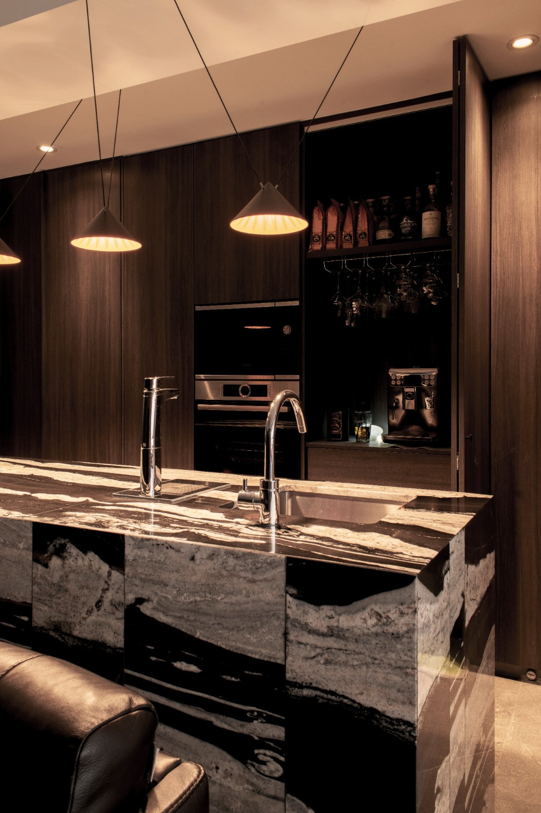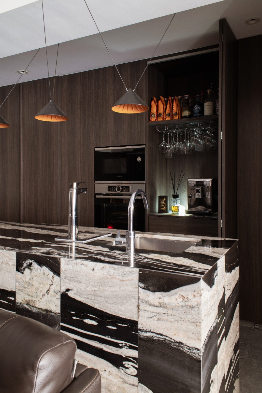 Behind the island you can find all the necessary appliances like wine fridges, coffee machines, ovens all integrated into the design. The wet kitchen can be closed off when necessary especially when they have guests over.