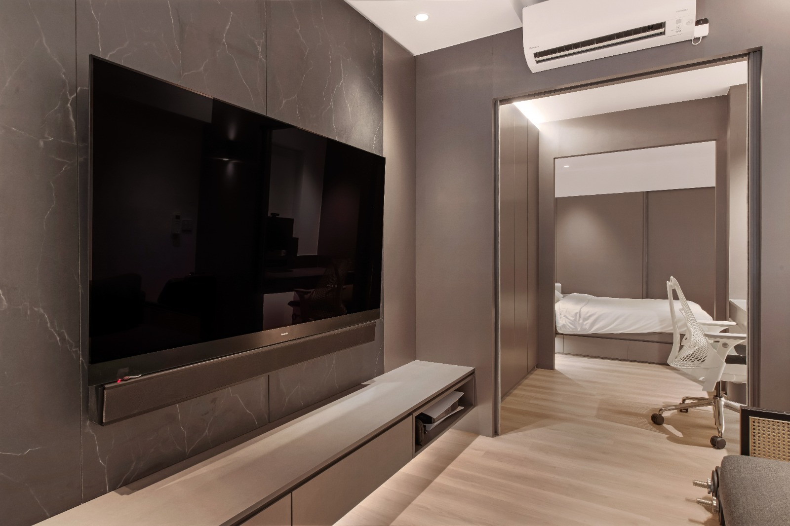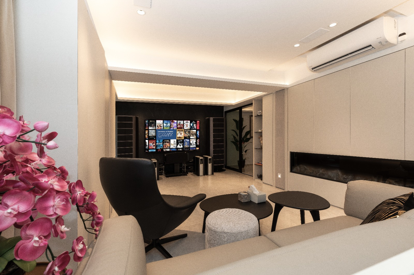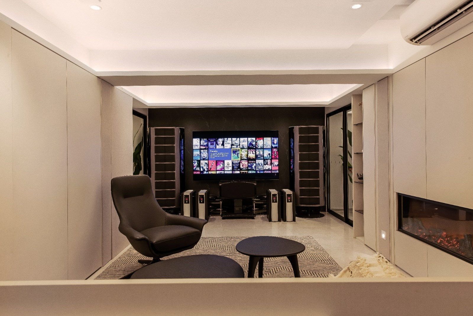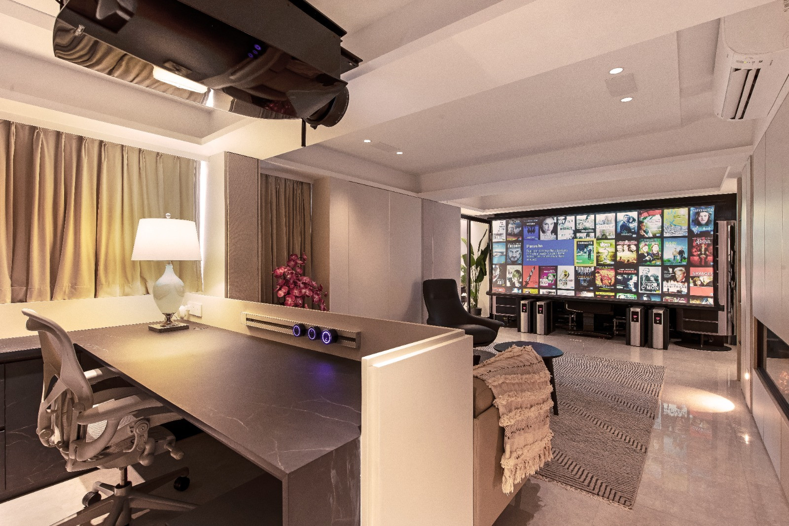 The master apartment entrance has a small foyer which leads into the living room that is decked out with an impressive state of the art theatre entertainment system that would be the equivalent of a full gold class experience! The owner is very passionate about the equipment which serves as both a hobby as well as an entertainment tool.