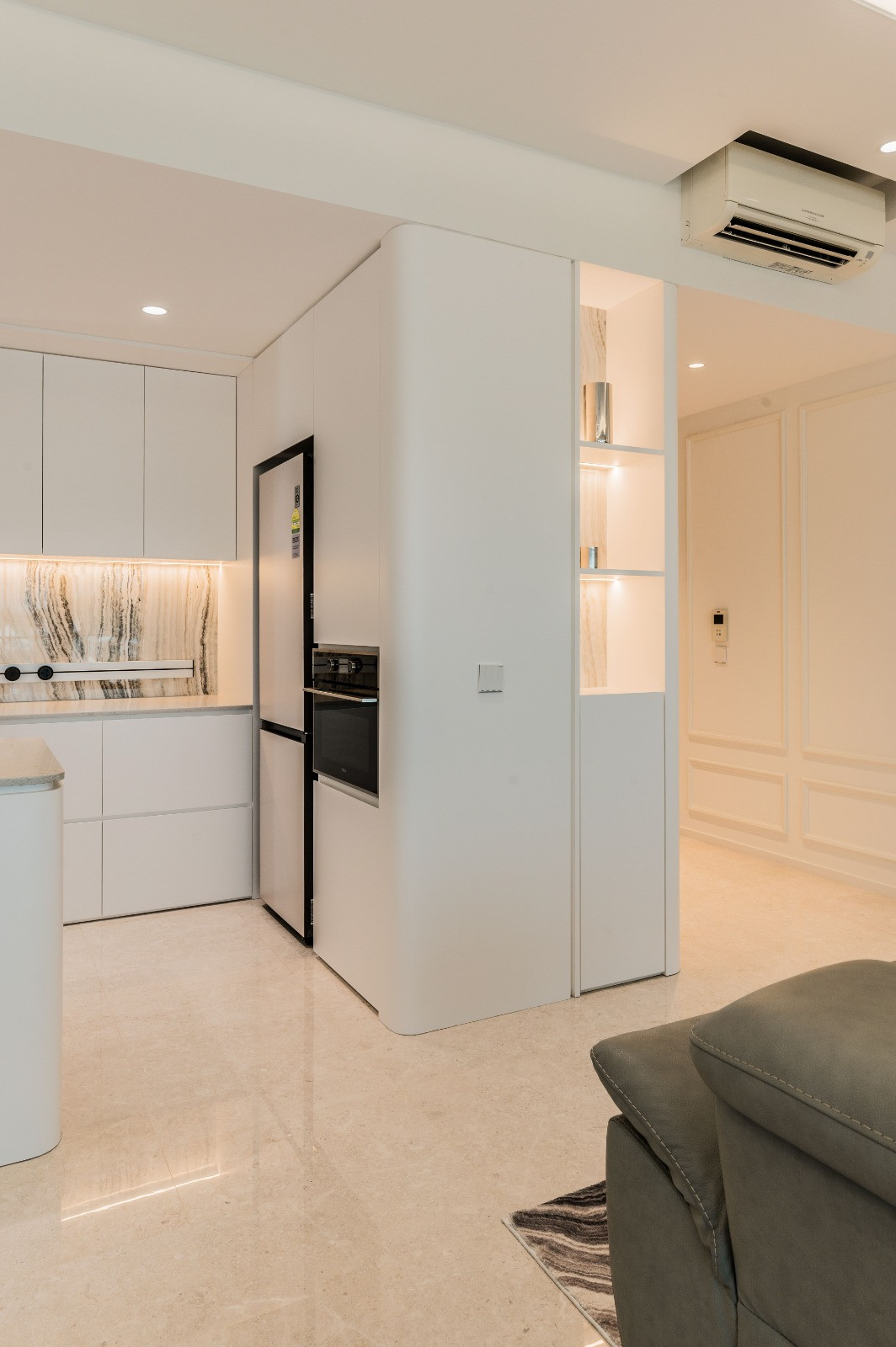 Classic beading on selected wall surfaces introduces a timeless detail, providing depth and texture against the neutral palette. This understated feature bridges tradition with modernity, enriching the interiors with character and refinement. The carefully curated finishes and materials, from soft neutral tones to delicate metallic touches, enhance the sense of spaciousness and sophistication throughout the home.