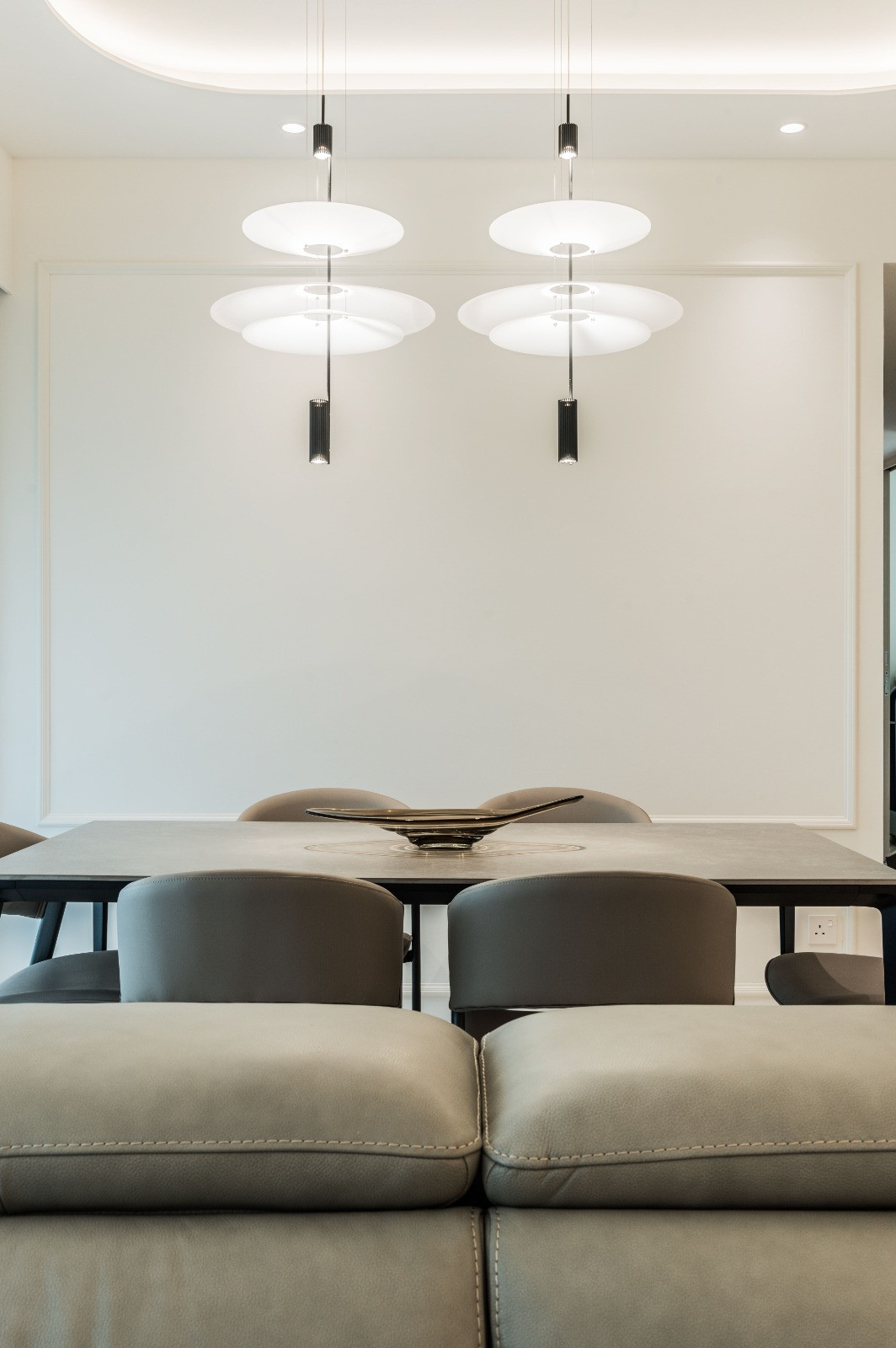 Lighting is thoughtfully layered, combining recessed fixtures with statement pieces to highlight architectural features and the classic beading. This approach creates dynamic moods throughout the day, emphasising both drama and serenity.