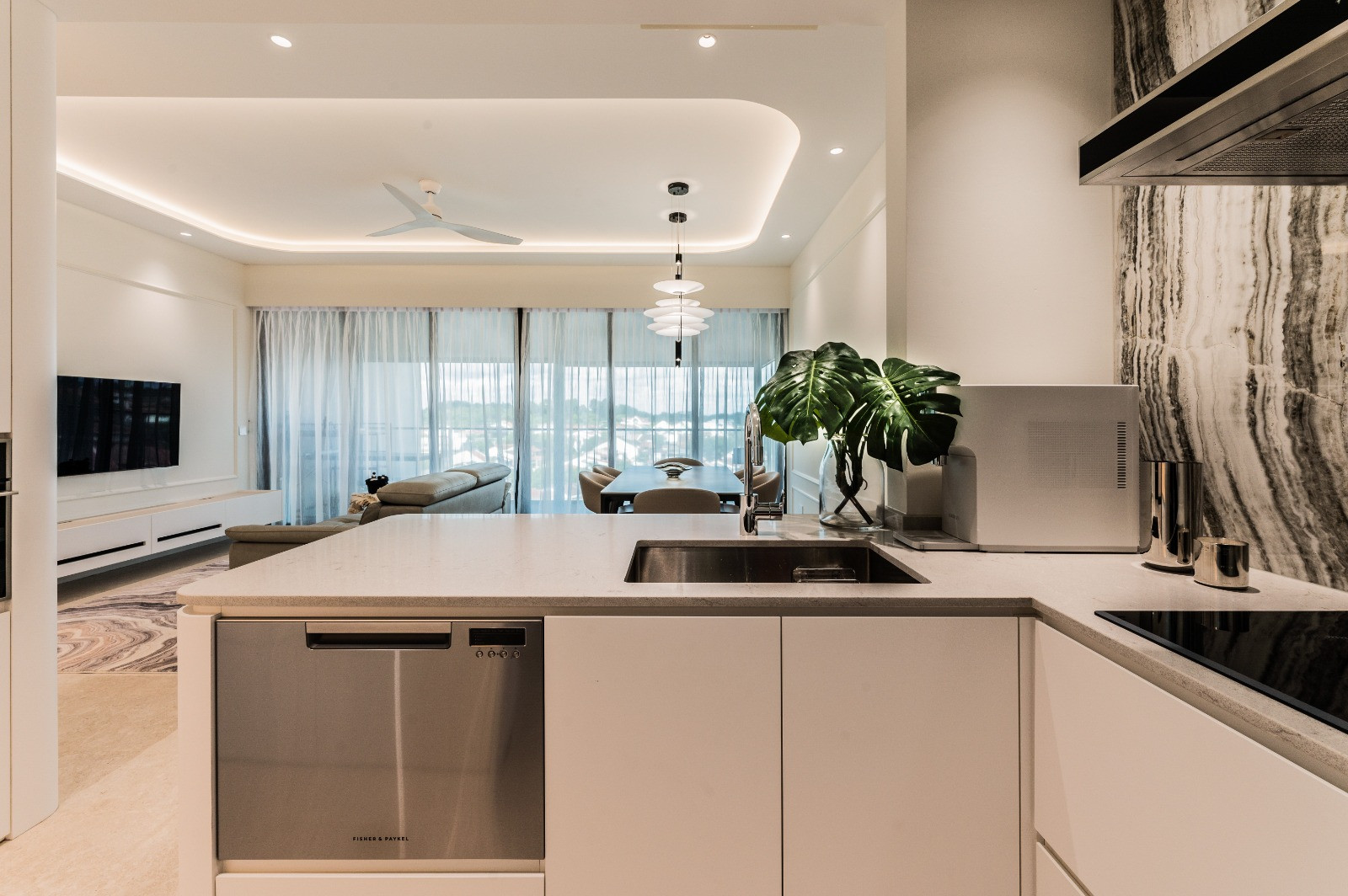 The open-plan kitchen forms the heart of the home, seamlessly connecting to the living and dining areas. This layout maximises space, enhances natural light, and encourages interaction, making everyday routines and entertaining effortless. Sleek cabinetry and polished surfaces ensure practicality without compromising style, while subtle metallic accents add a touch of quiet luxury.