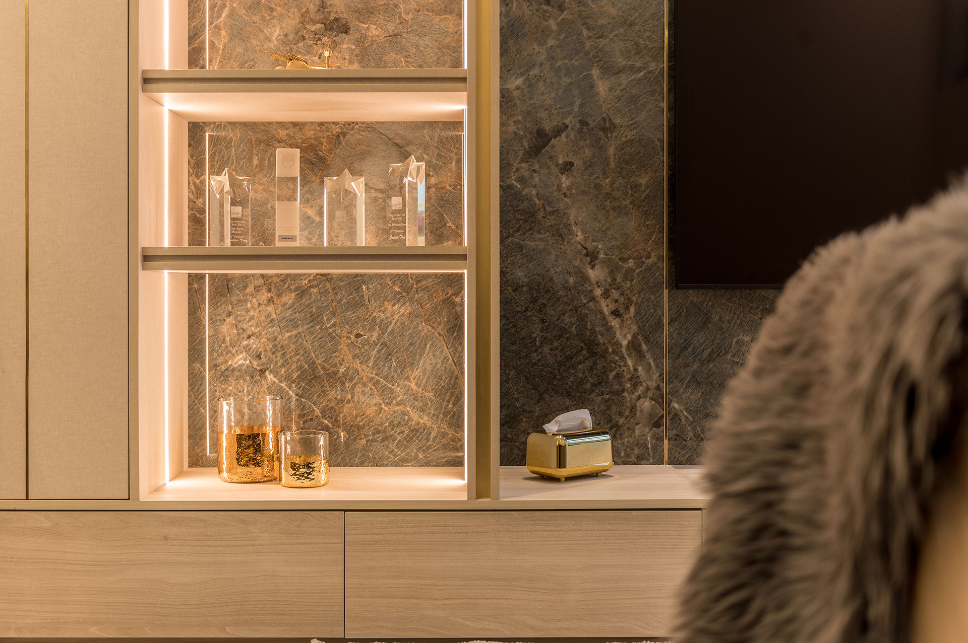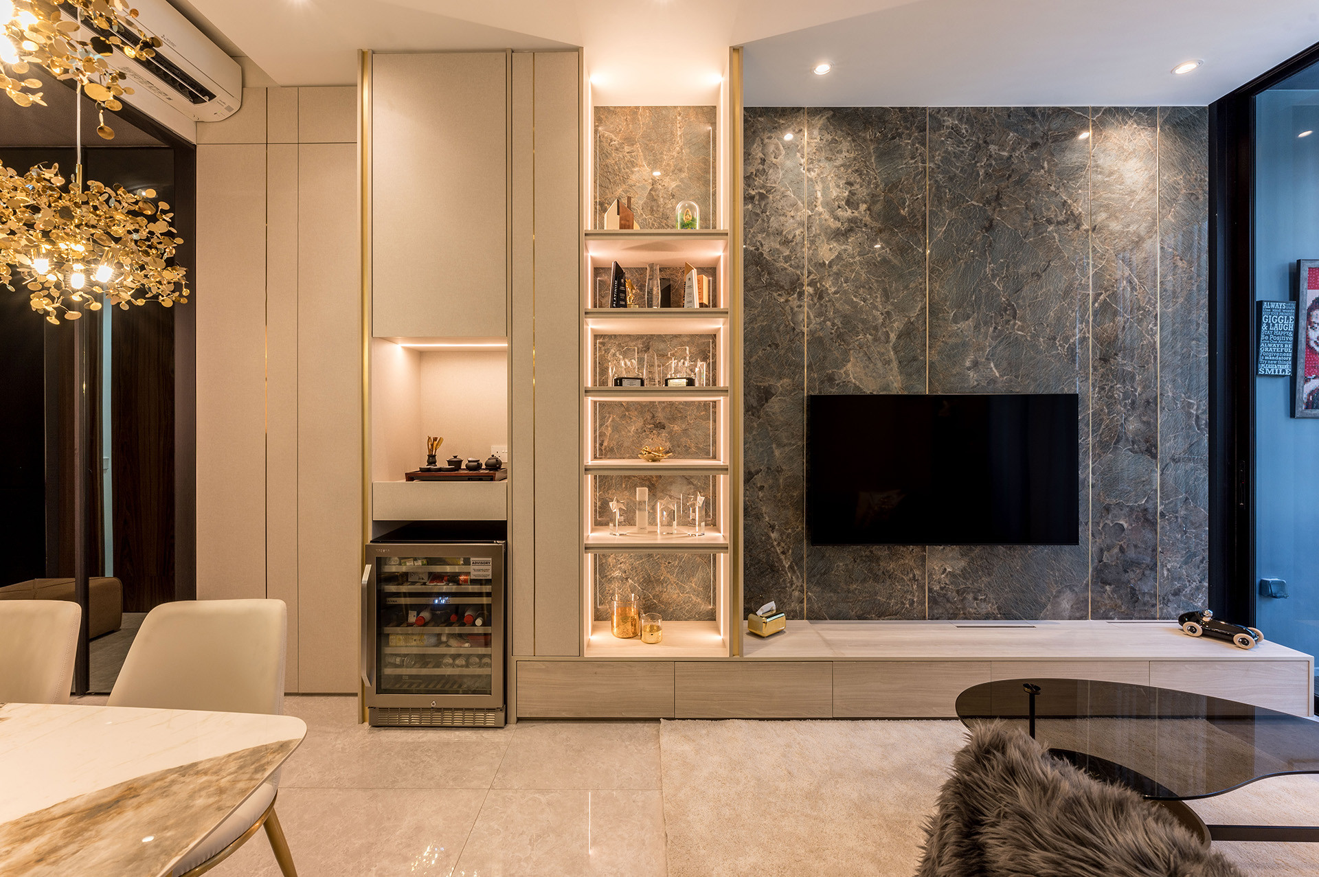 One of the most striking features of the home is the use of green jade tiles as a feature wall. Positioned thoughtfully in the living or dining area, the jade tiles bring a sense of depth, texture, and richness, serving as both a visual anchor and a conversation starter. The cool green tones balance the warm creams and golds, introducing a natural, almost jewel-like quality that reinforces the luxurious yet modern character of the residence. This feature wall embodies Erstudio’s philosophy of combining subtle drama with functional design, giving personality to the space without compromising flow or scale.