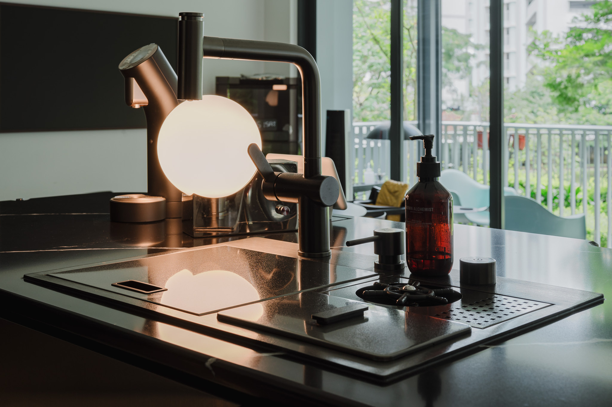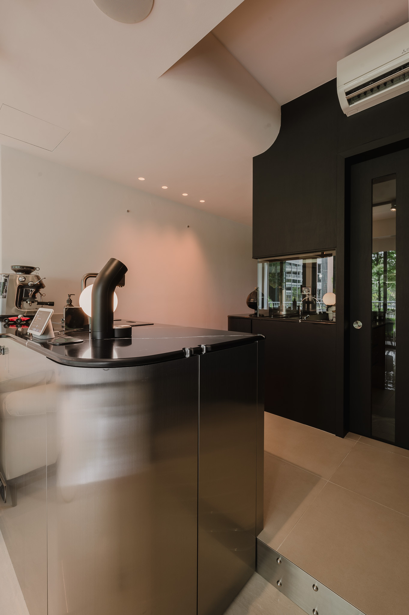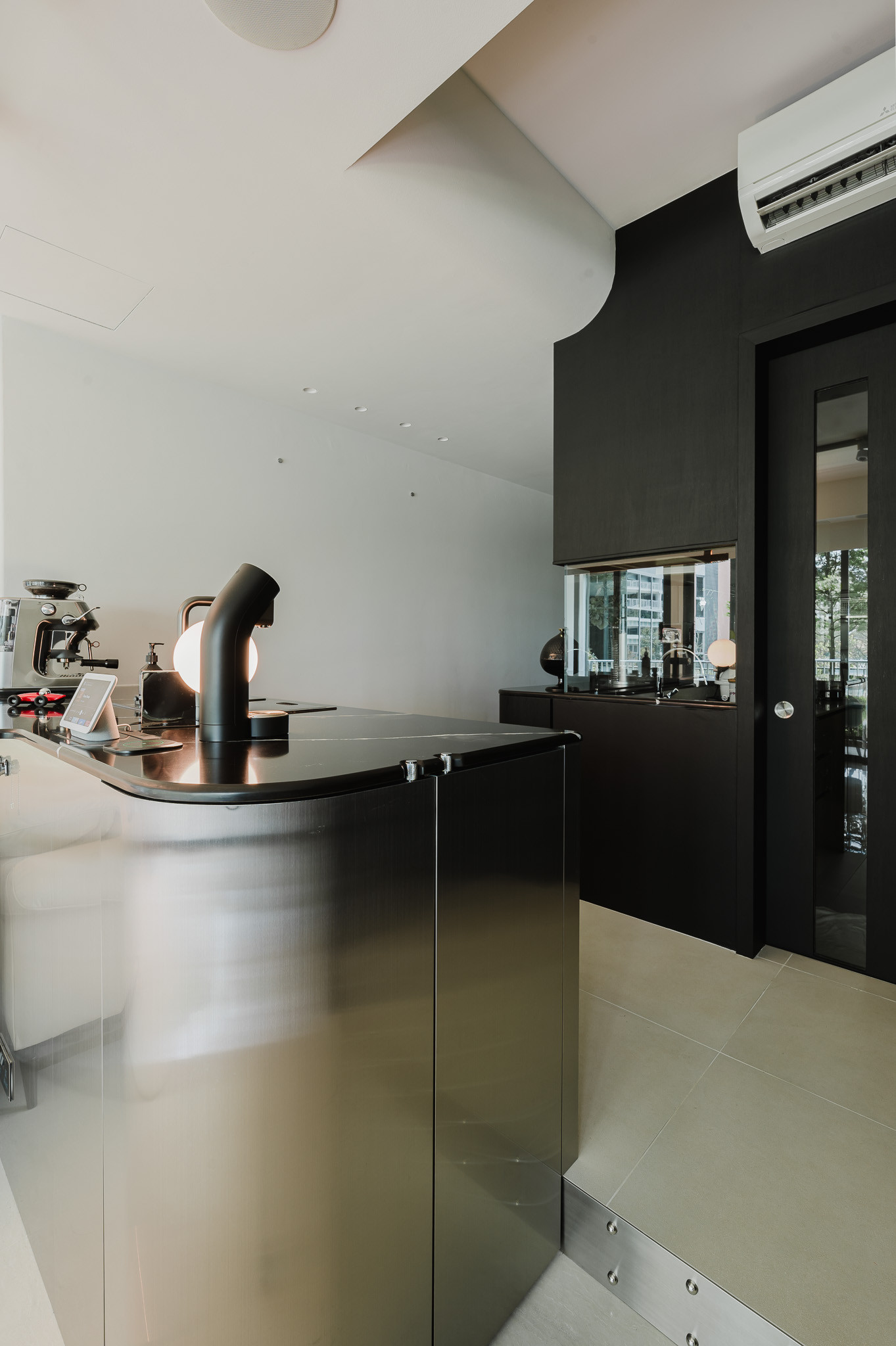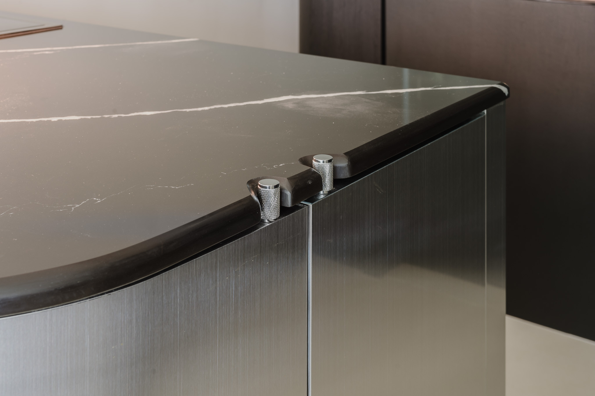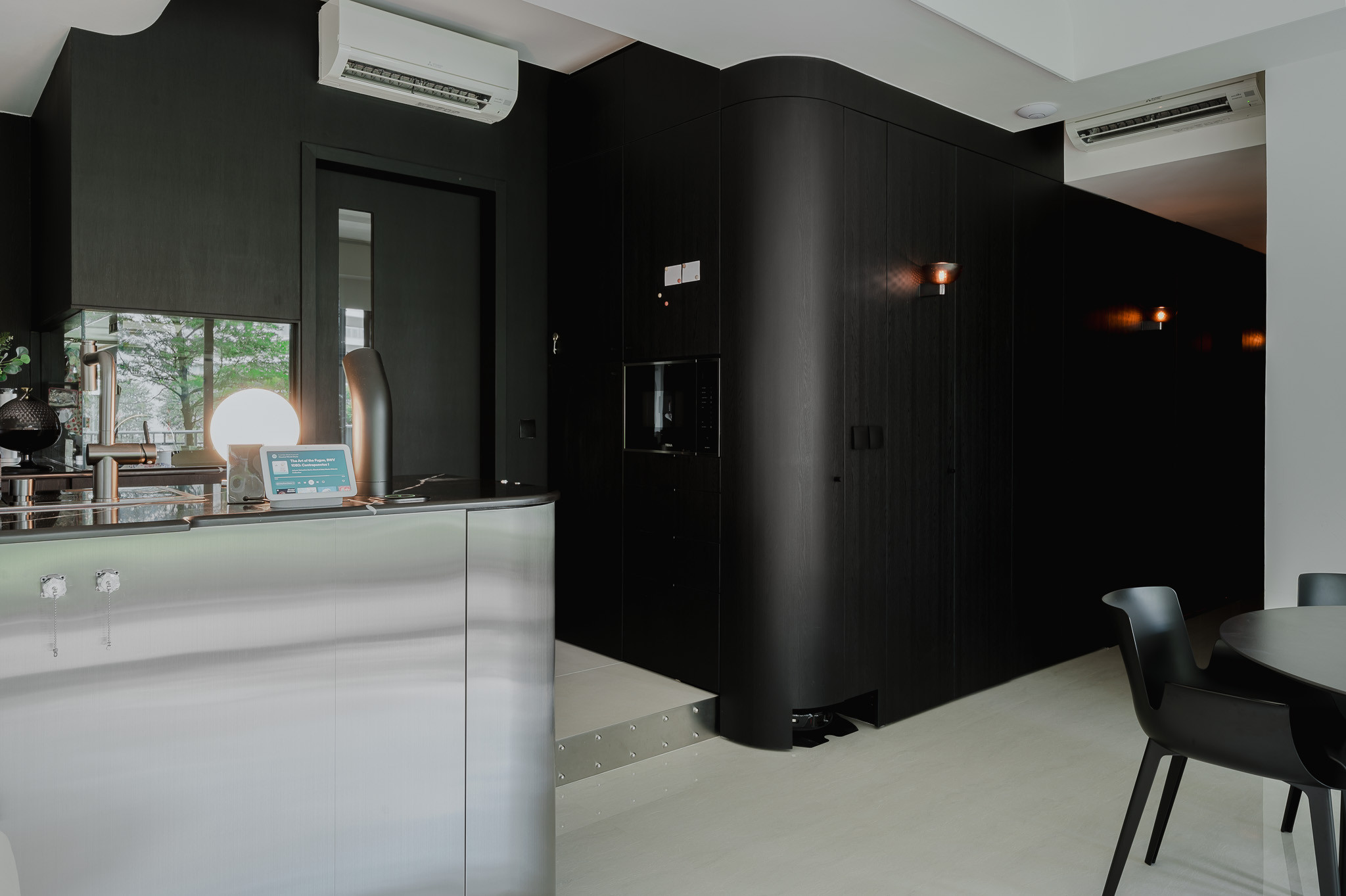 A dark, grounded palette sets the tone: black-stained timber panels, brushed stainless steel cladding, and deep, retro-inspired fittings articulate a language that is timeless and industrial. Bolt-and-nut detailing and subtle curves reference submarine mechanics, while the spatial mood evokes the echoes and textures of European stone chambers.