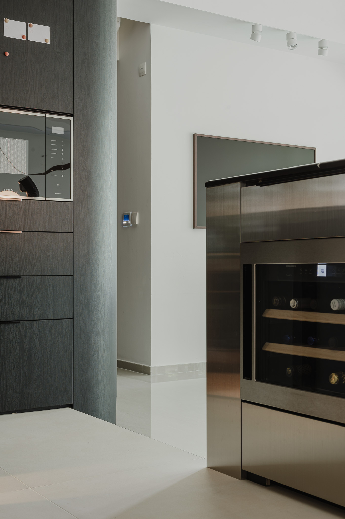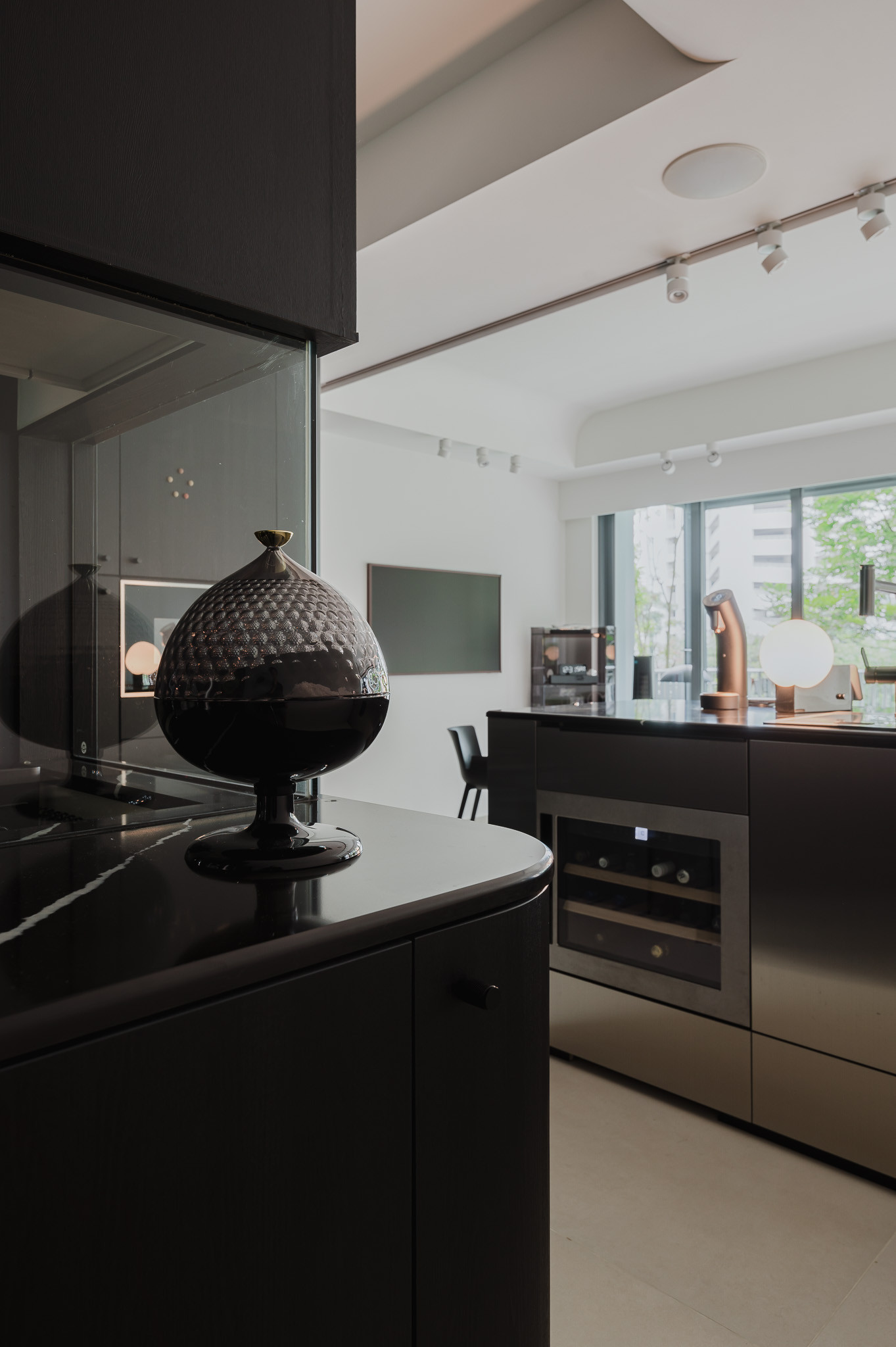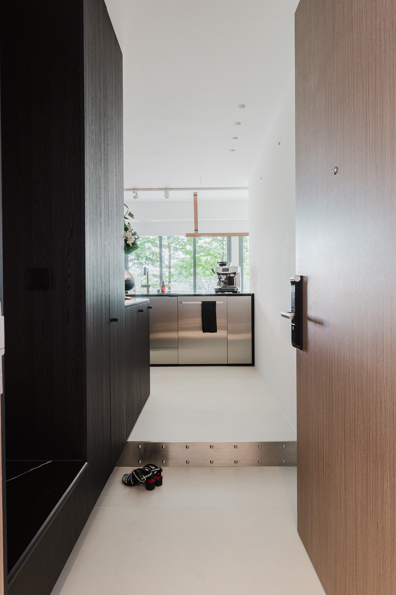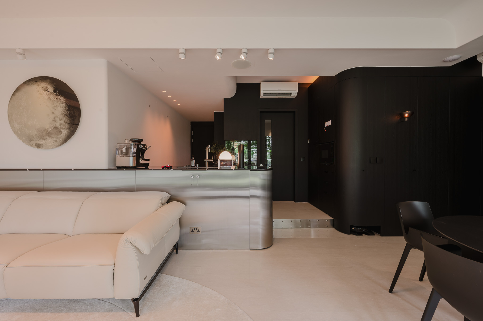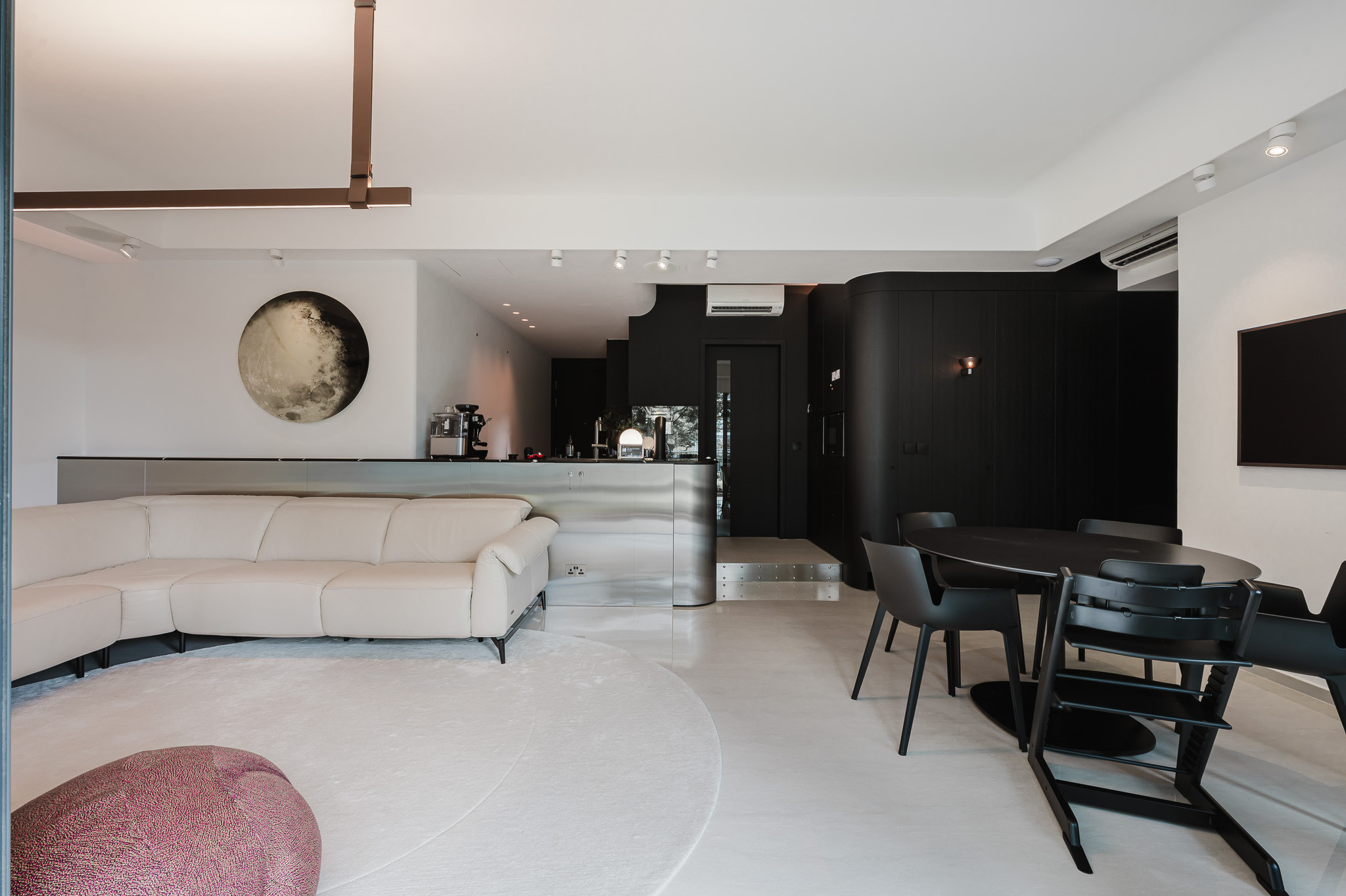 The clients enjoy hosting friends and colleagues frequently, which means the layout must feel generous and open despite the apartment’s footprint. The home flows through a unified space beginning at the communal core — a hybrid lounge, dining, and open kitchen — and leads into personal areas tucked behind subtly integrated passageways. Storage is maximized throughout, especially in transitional zones, to maintain a clutter-free environment.