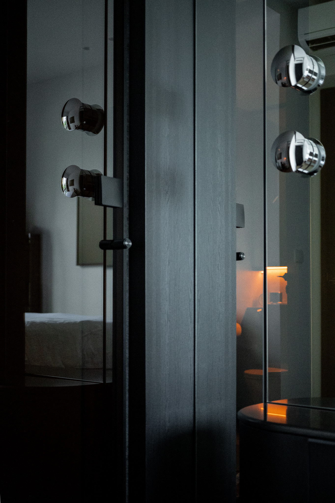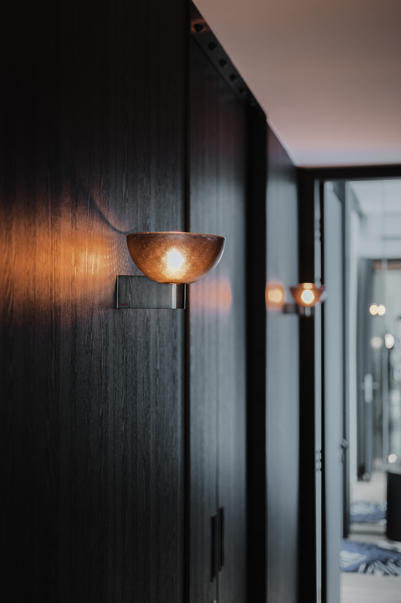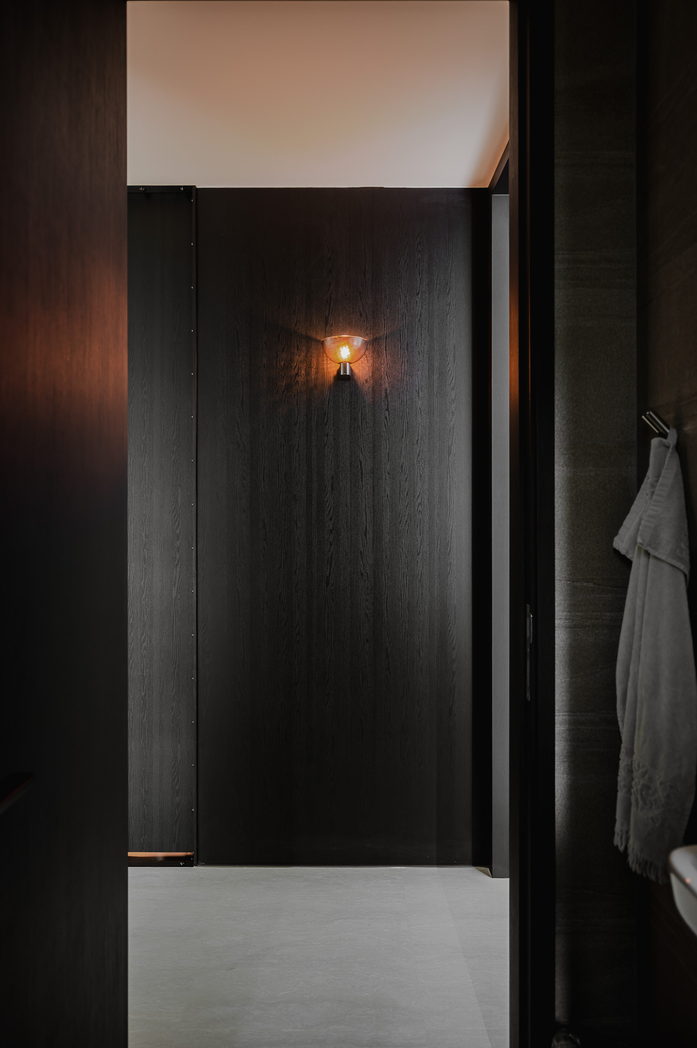 Lighting is approached as sculptural punctuation. In the passageway, hemispherical sconces in burnished brass emit a soft, ambient glow — casting golden haloes against the grain of dark timber cladding. This effect builds a moody rhythm as one walks deeper into the private zones. Accent lighting in joinery, mirror cabinets, and under vanities ensures that ambient and task lighting are well-balanced, atmospheric, and maintenance-friendly.