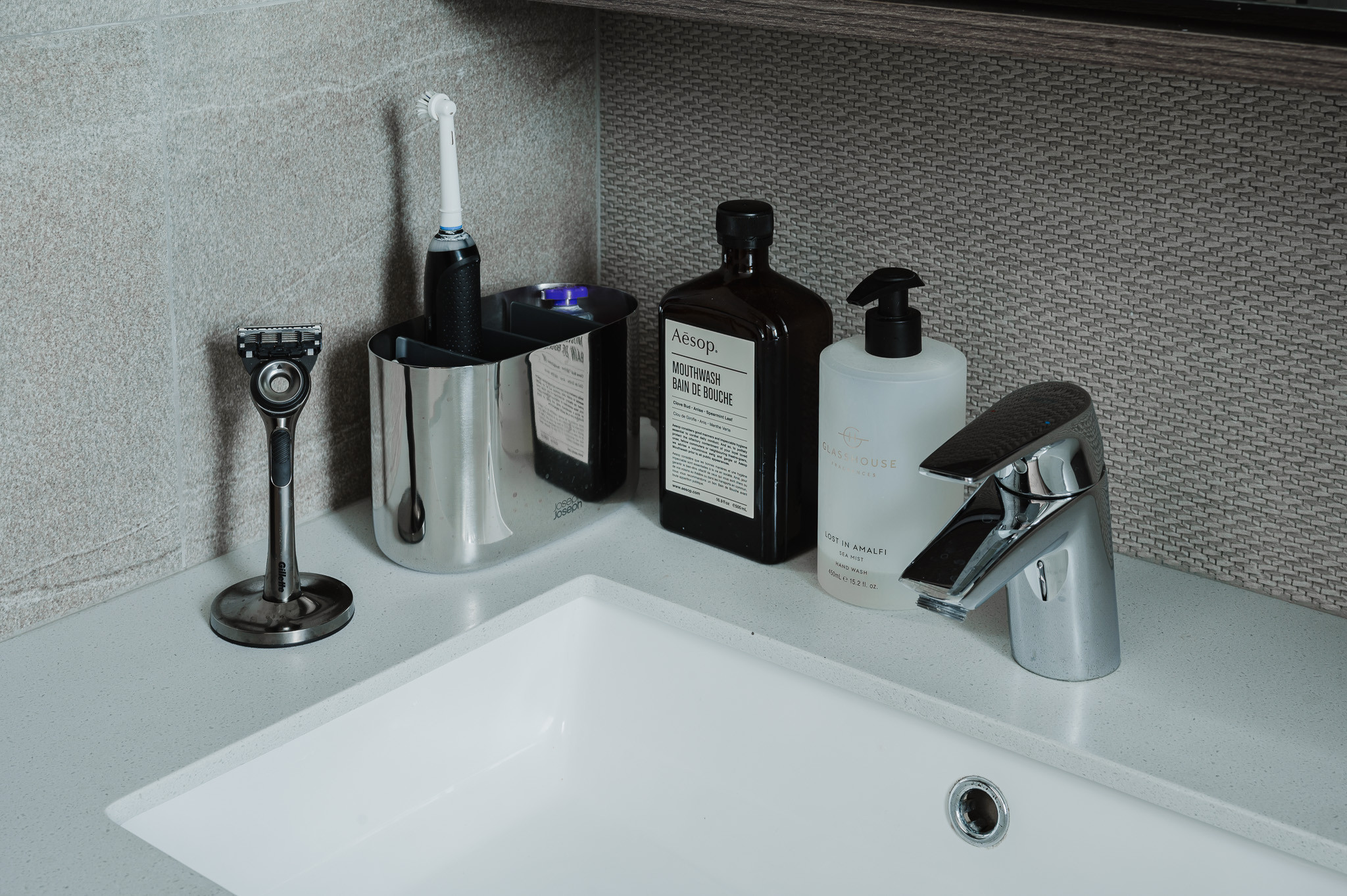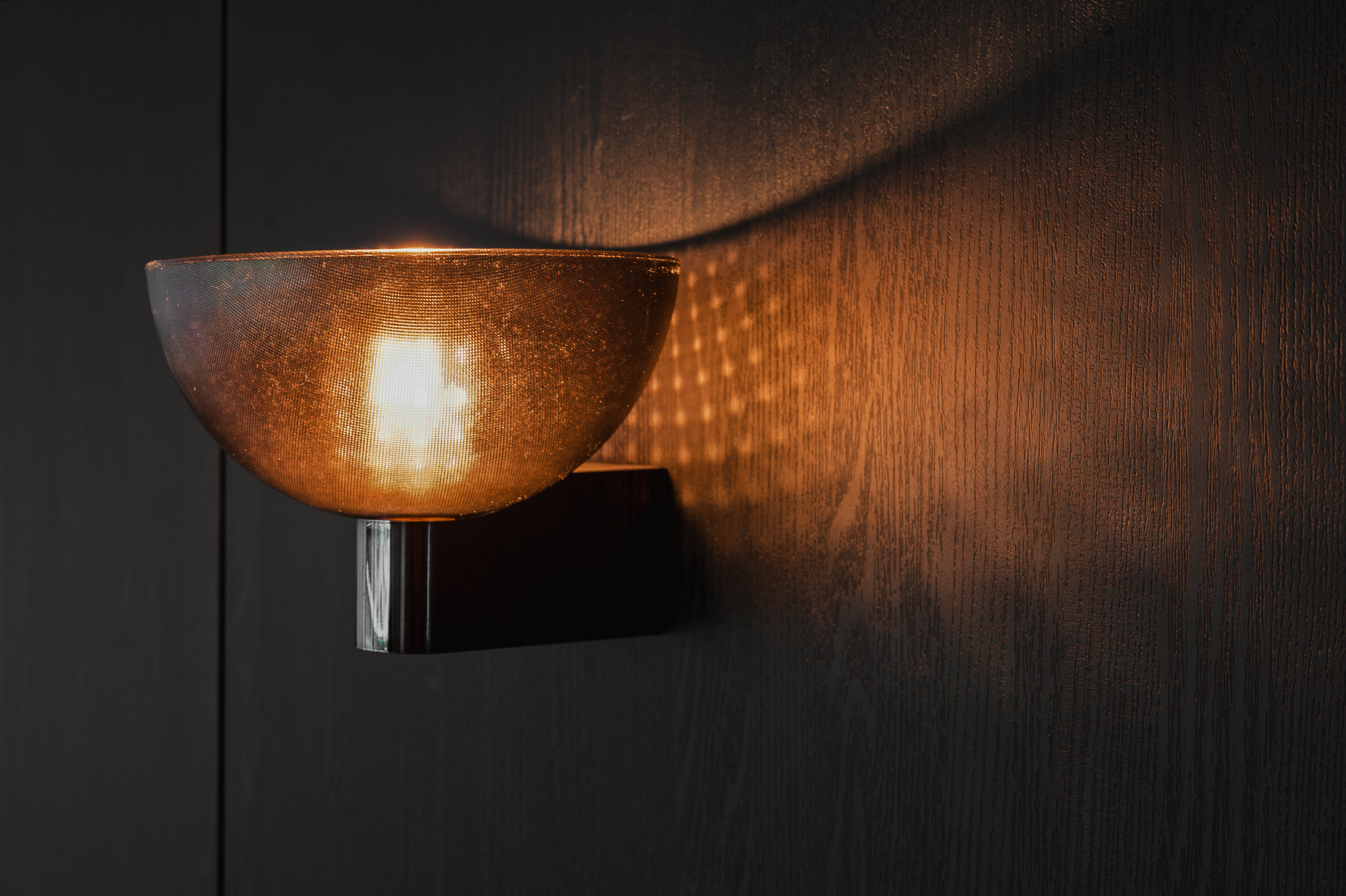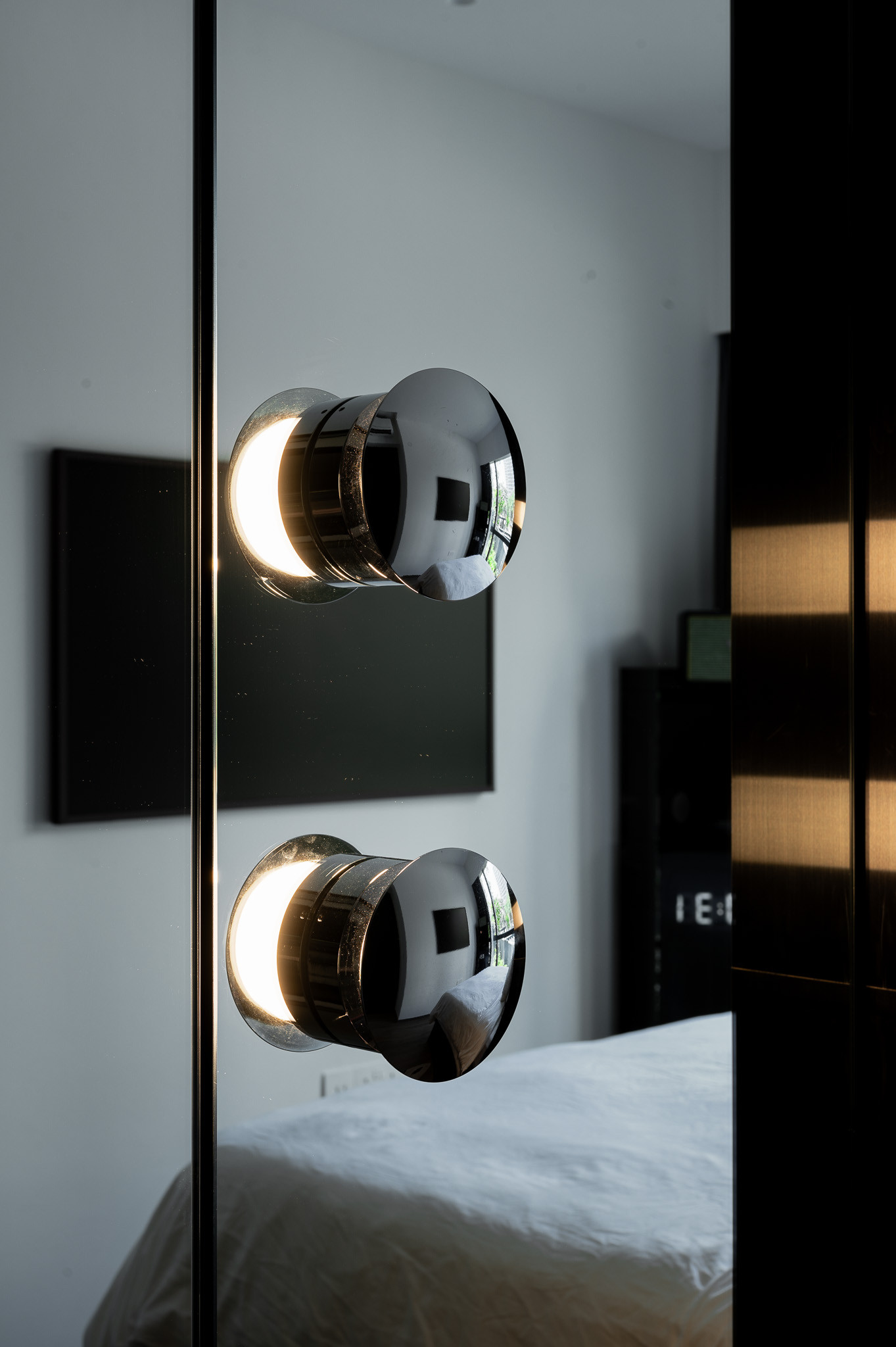 Lighting is approached as sculptural punctuation. In the passageway, hemispherical sconces in burnished brass emit a soft, ambient glow — casting golden haloes against the grain of dark timber cladding. This effect builds a moody rhythm as one walks deeper into the private zones. Accent lighting in joinery, mirror cabinets, and under vanities ensures that ambient and task lighting are well-balanced, atmospheric, and maintenance-friendly.