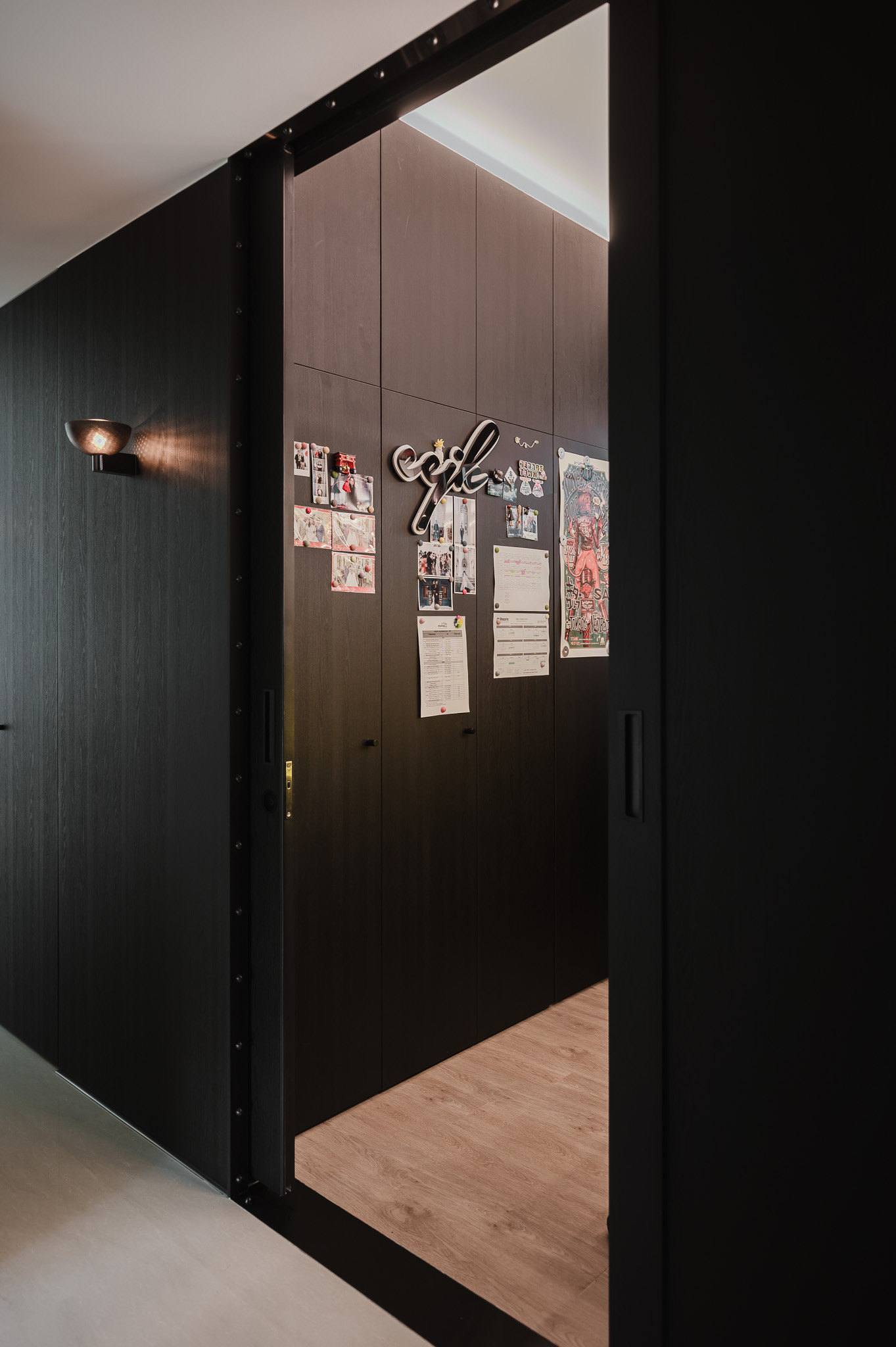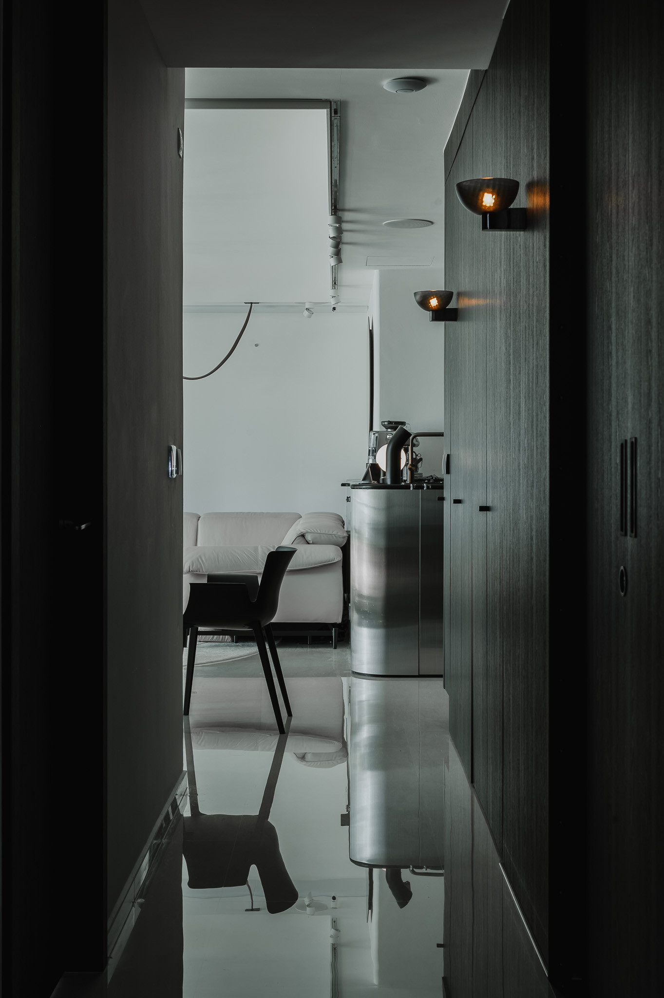 The transitional passageway becomes a cinematic experience with dark-stained timber paneling that absorbs and reflects the warm glow of wall-mounted sconces. These curved lights — reminiscent of industrial signal lamps — provide just enough illumination to guide the path while preserving the moody ambiance. Full-height cabinetry on one side integrates generous storage, ensuring clutter remains out of sight. The flooring here is continuous with the main living areas to ensure spatial flow and ease of maintenance.
