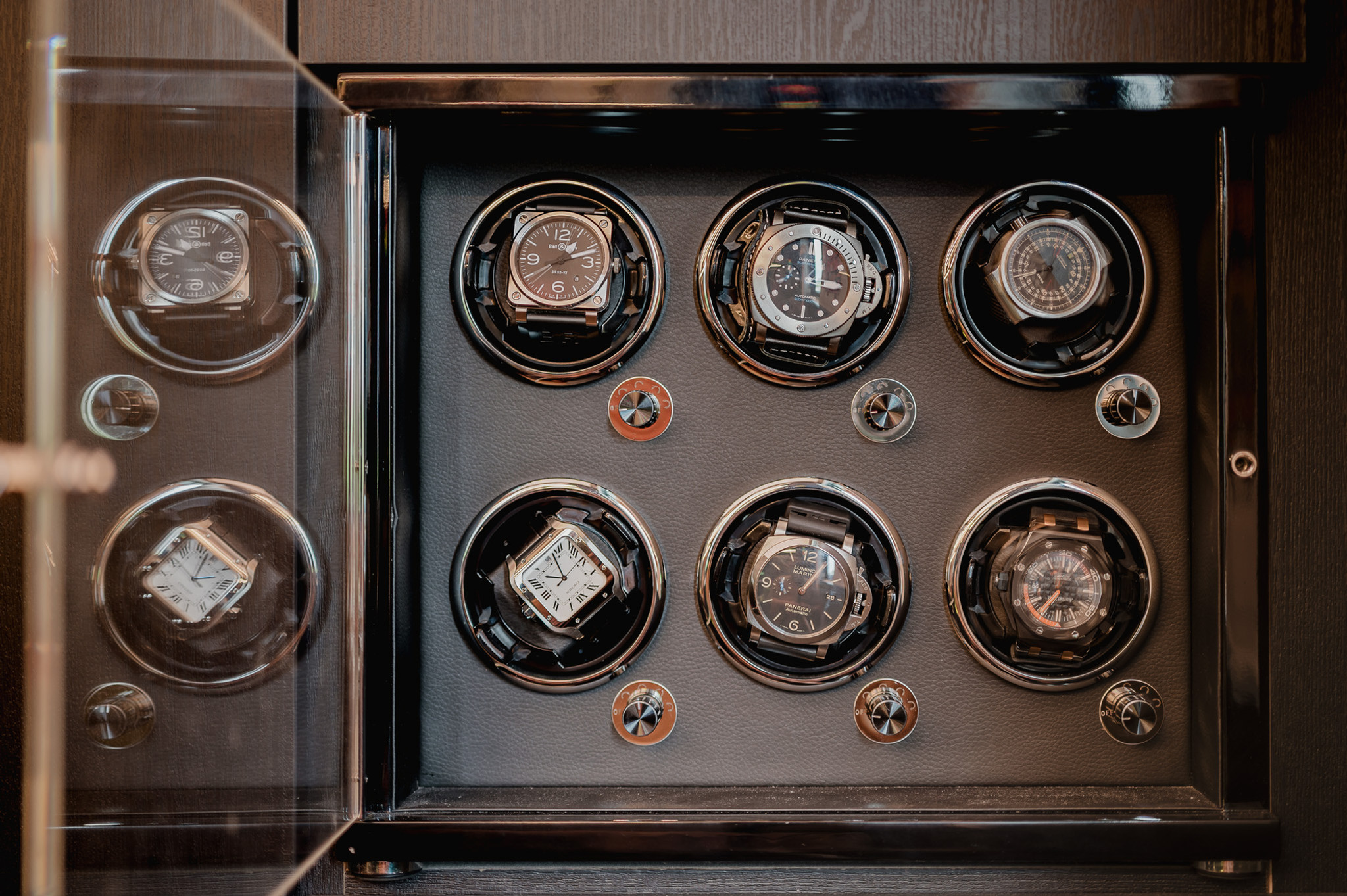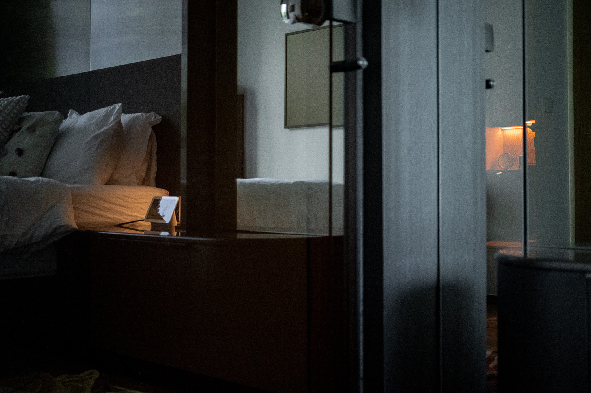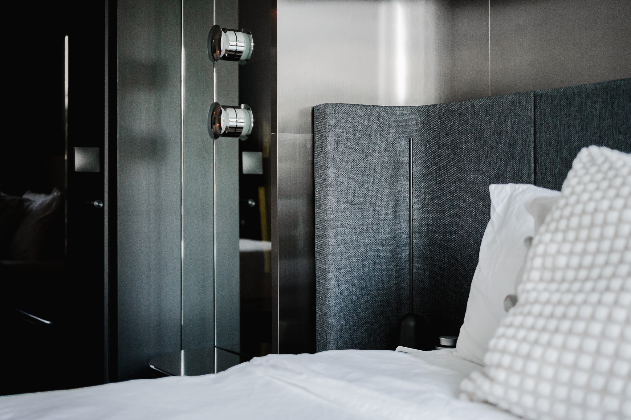 The bed is flanked by built-in bedside consoles housing integrated switches, USB chargers, and soft-glow task lighting. Flooring is engineered timber in a warm neutral tone to counterbalance the dark finishes and provide tactile comfort underfoot. Joinery details echo submarine cabinetry with deep walnut inserts and concealed handles.