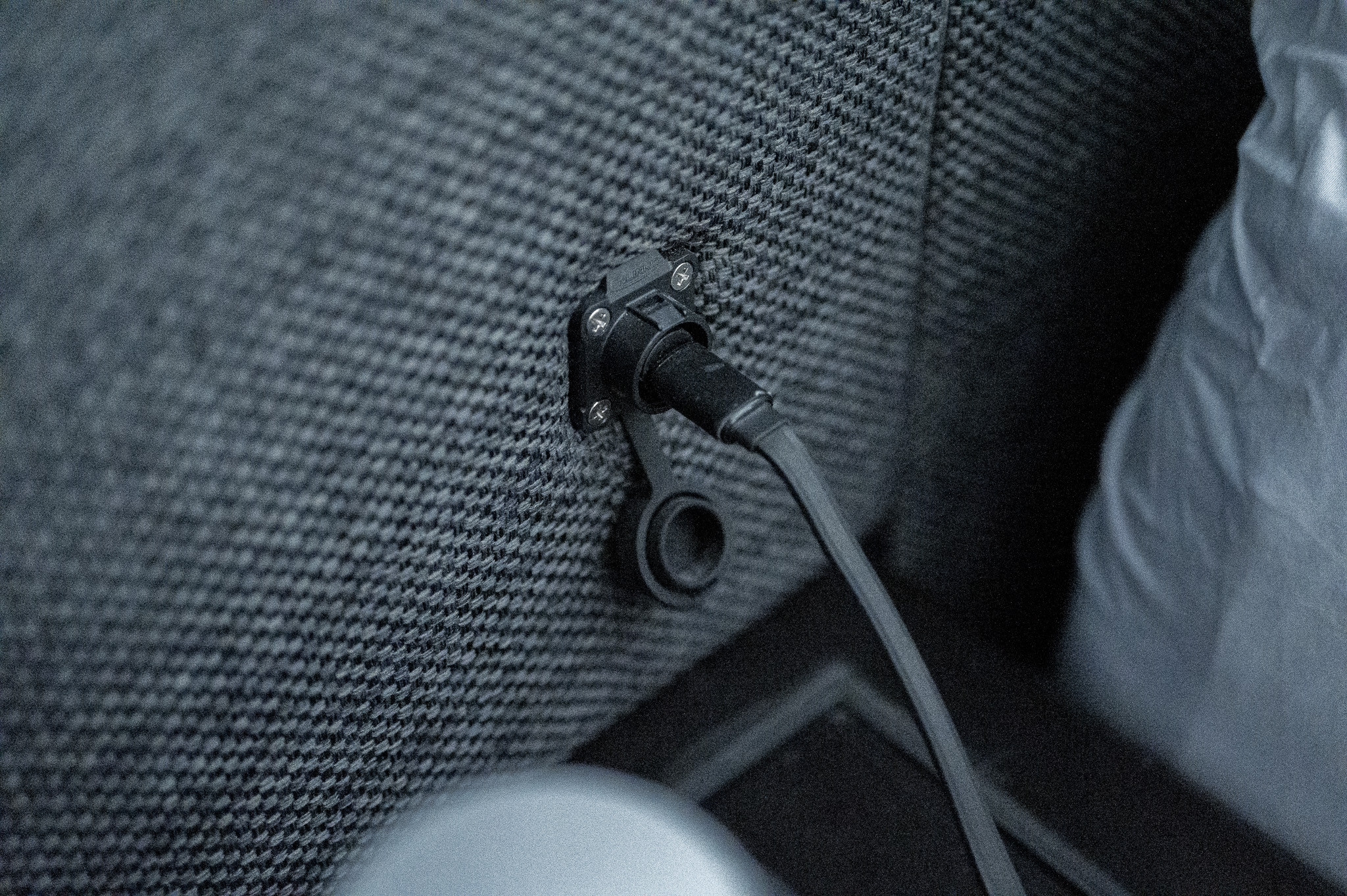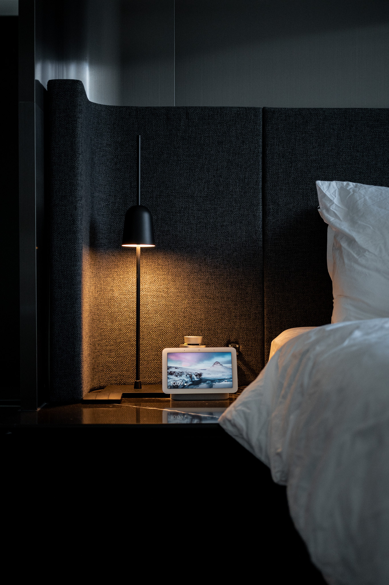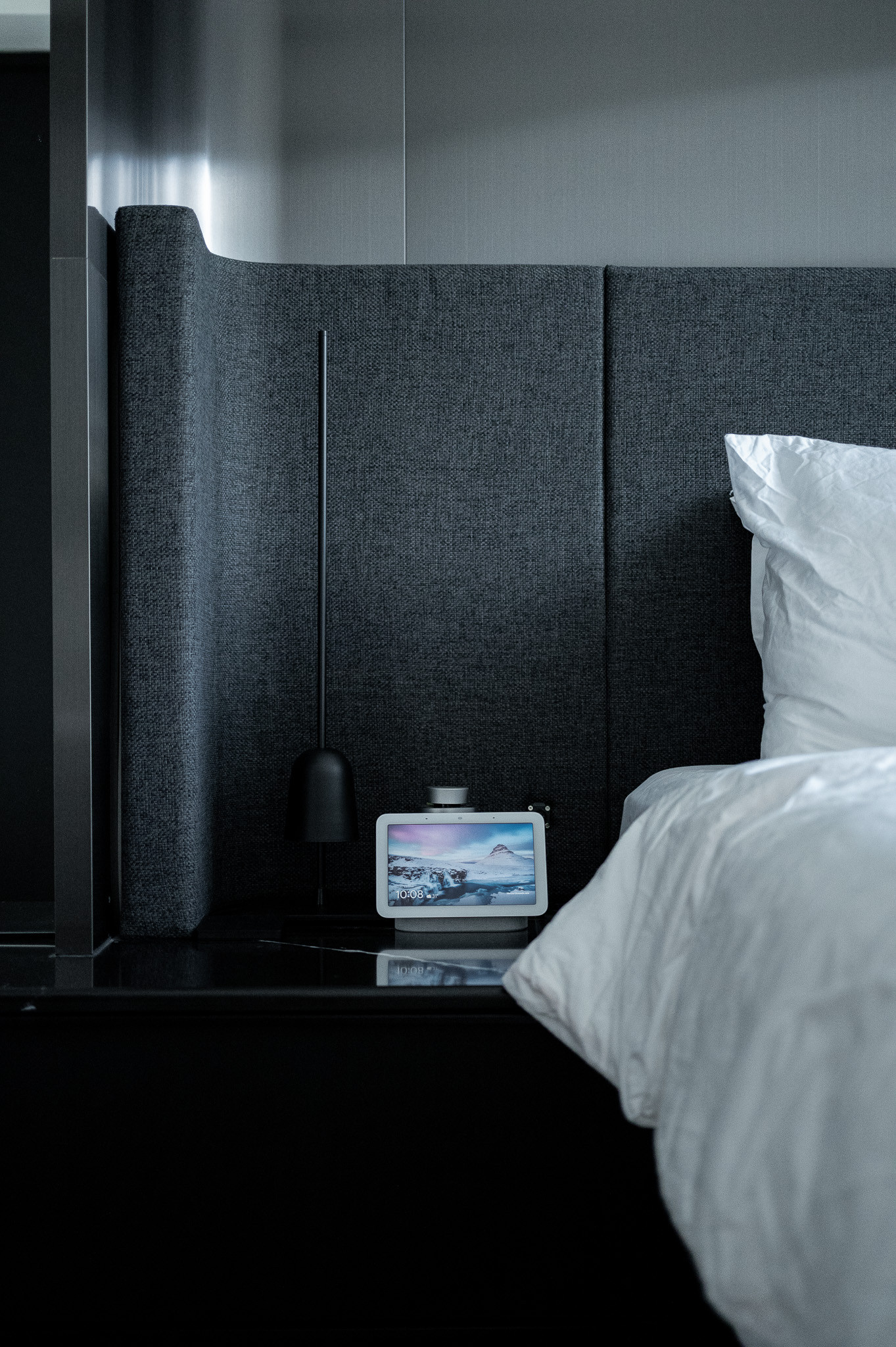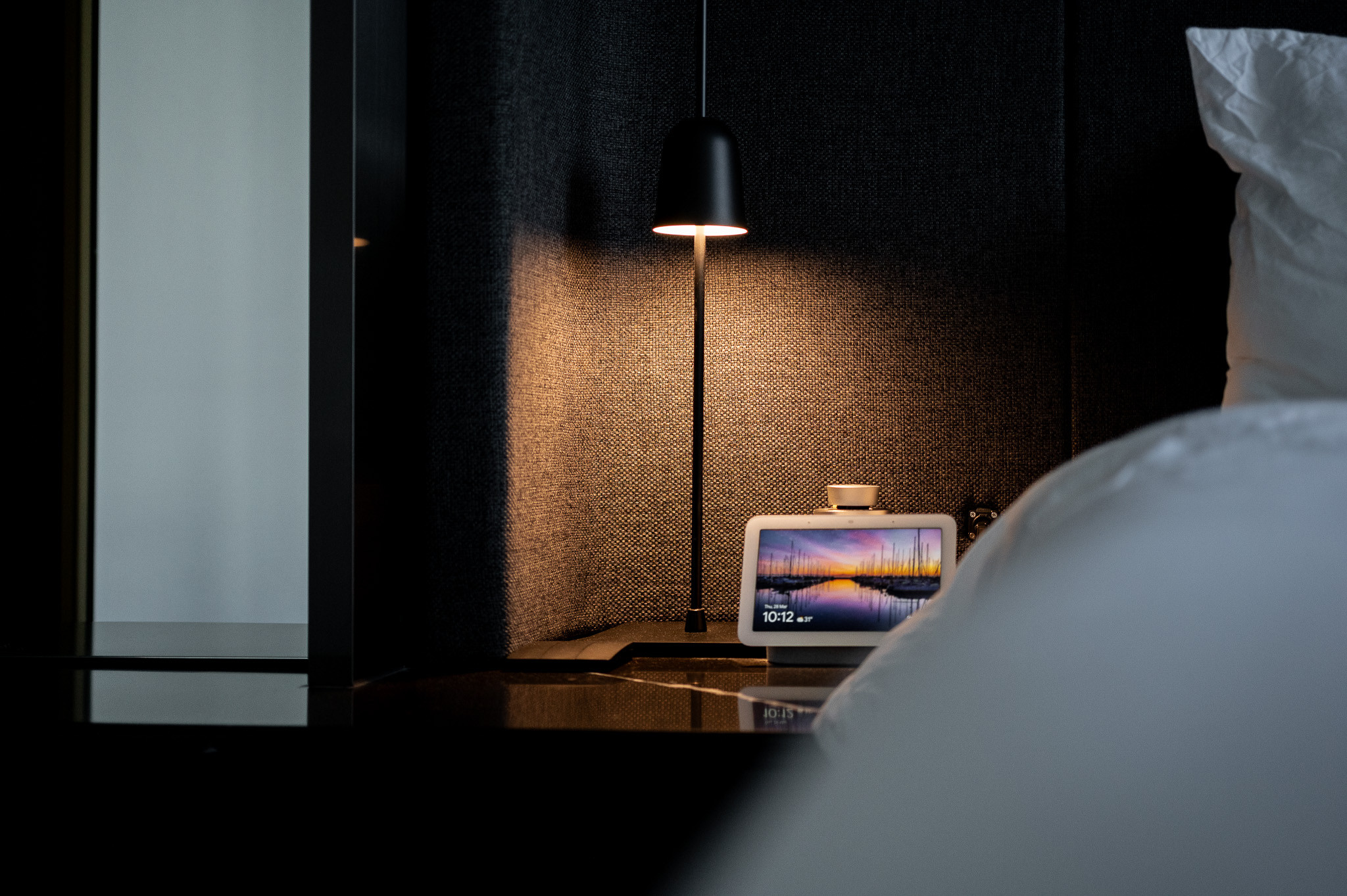 The bed is flanked by built-in bedside consoles housing integrated switches, USB chargers, and soft-glow task lighting. Flooring is engineered timber in a warm neutral tone to counterbalance the dark finishes and provide tactile comfort underfoot. Joinery details echo submarine cabinetry with deep walnut inserts and concealed handles.