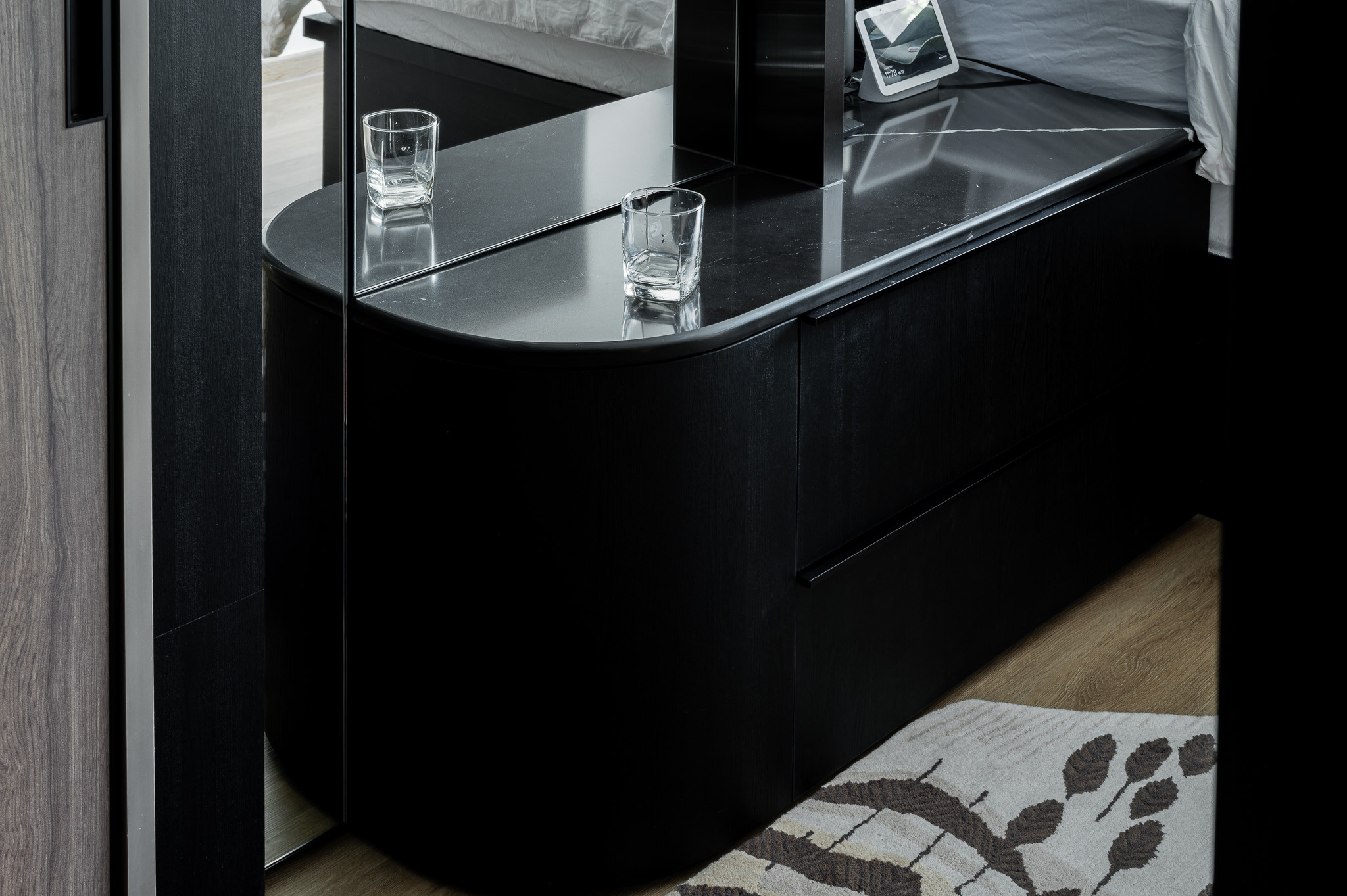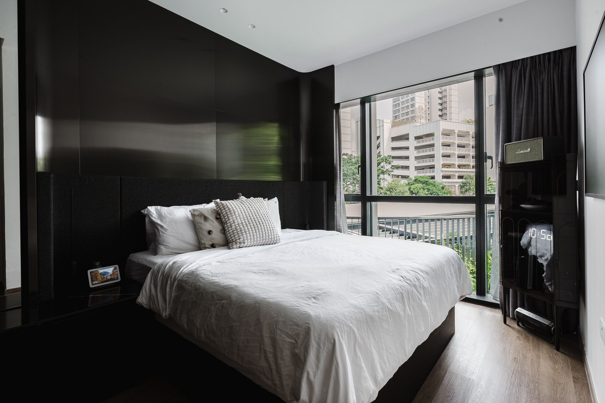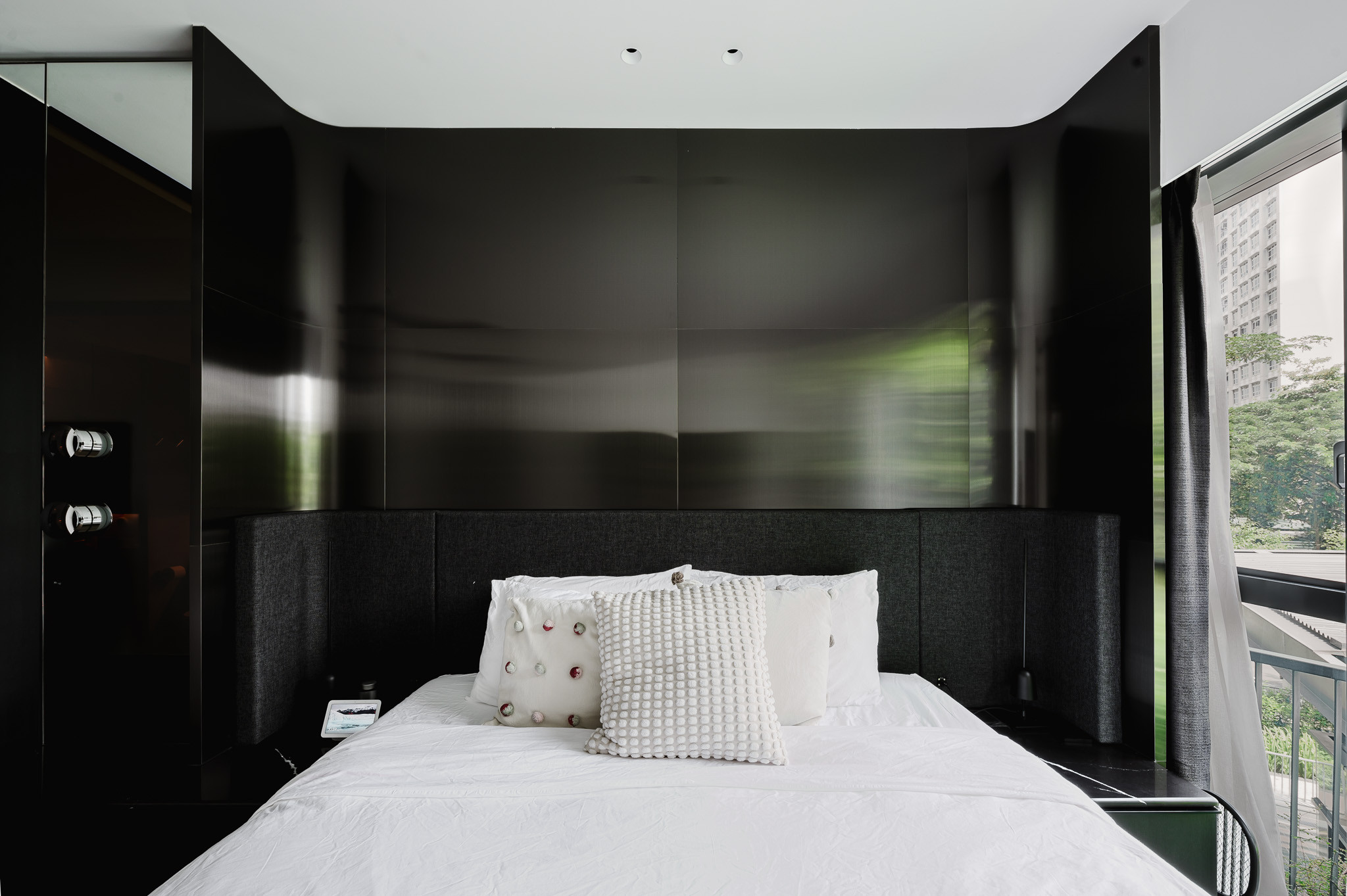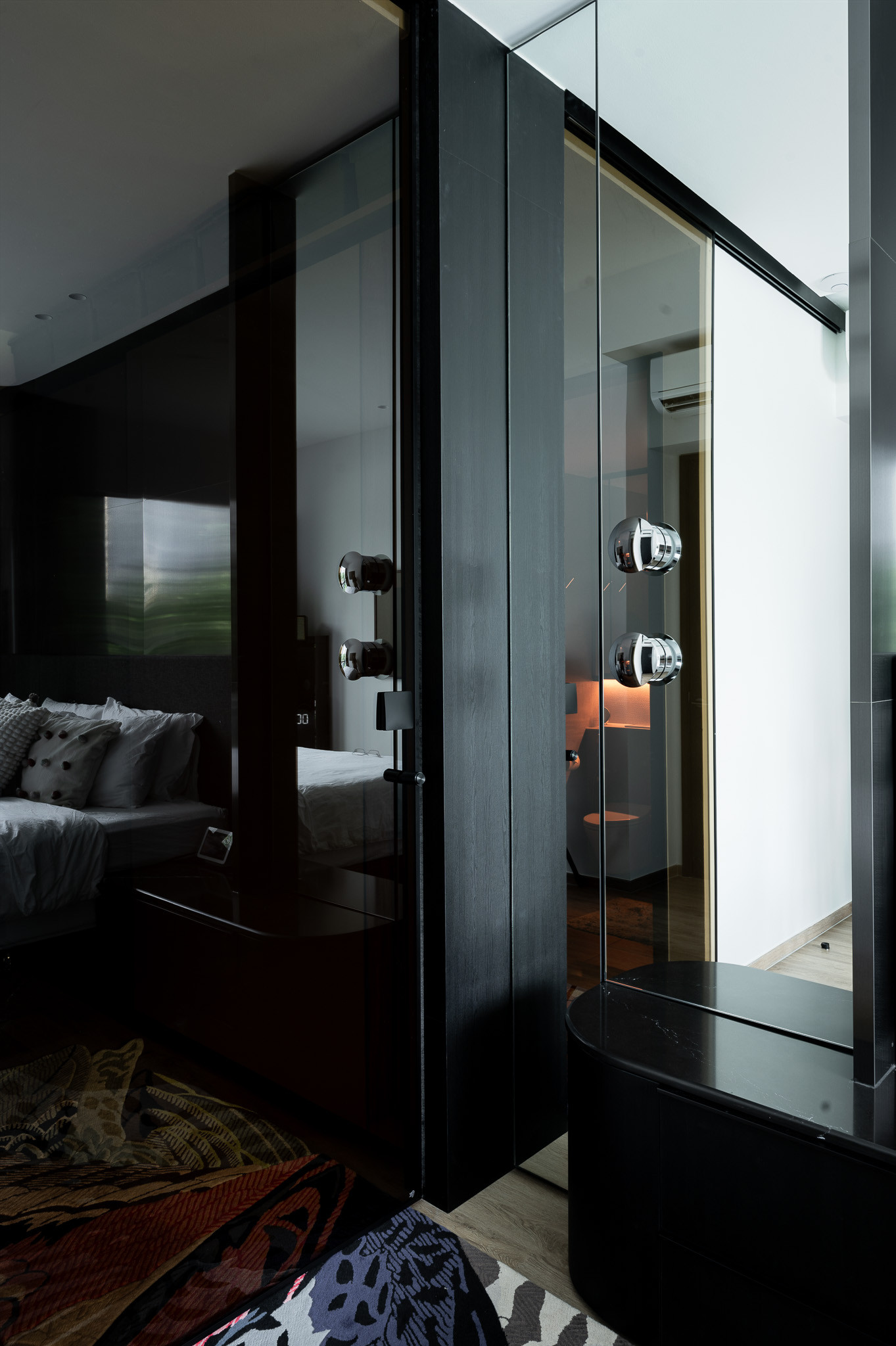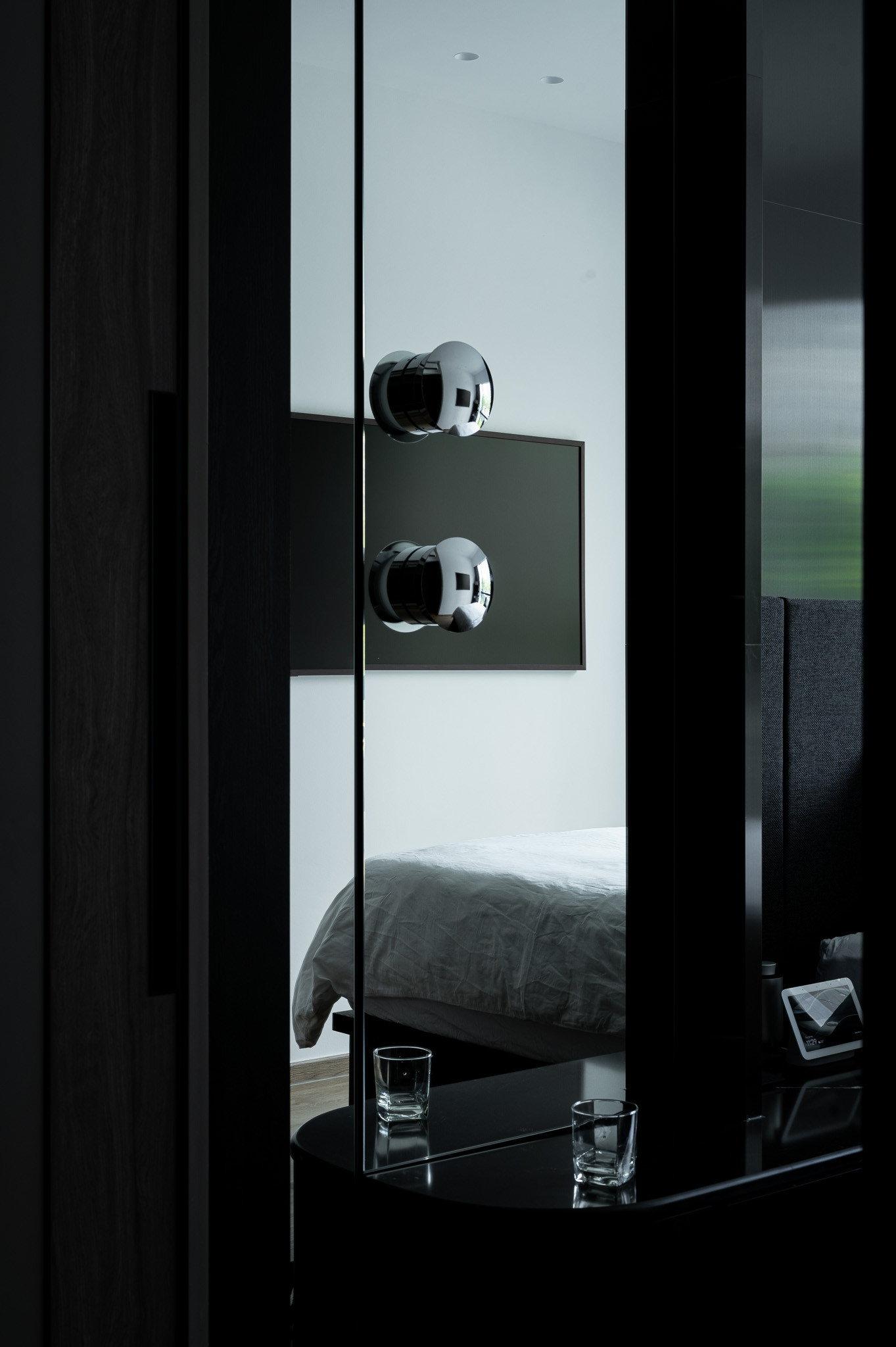 The master suite continues the narrative of Submerged Grandeur with polished black wall cladding behind the bed that shimmers subtly with natural light. A dramatic backdrop of high-gloss panels adds depth while reflecting soft window light and ambient glows. Full-height glazing floods the room with daylight, moderated by blackout curtains for restful sleep.
