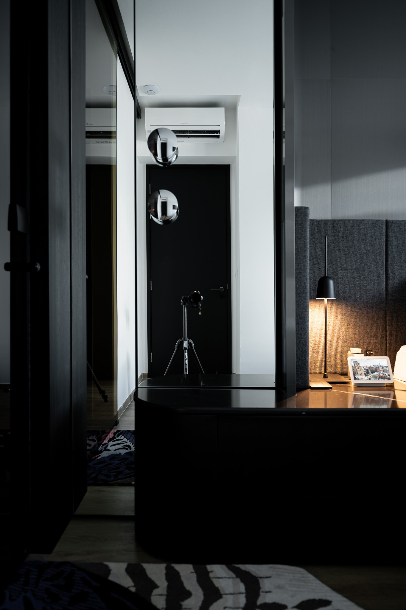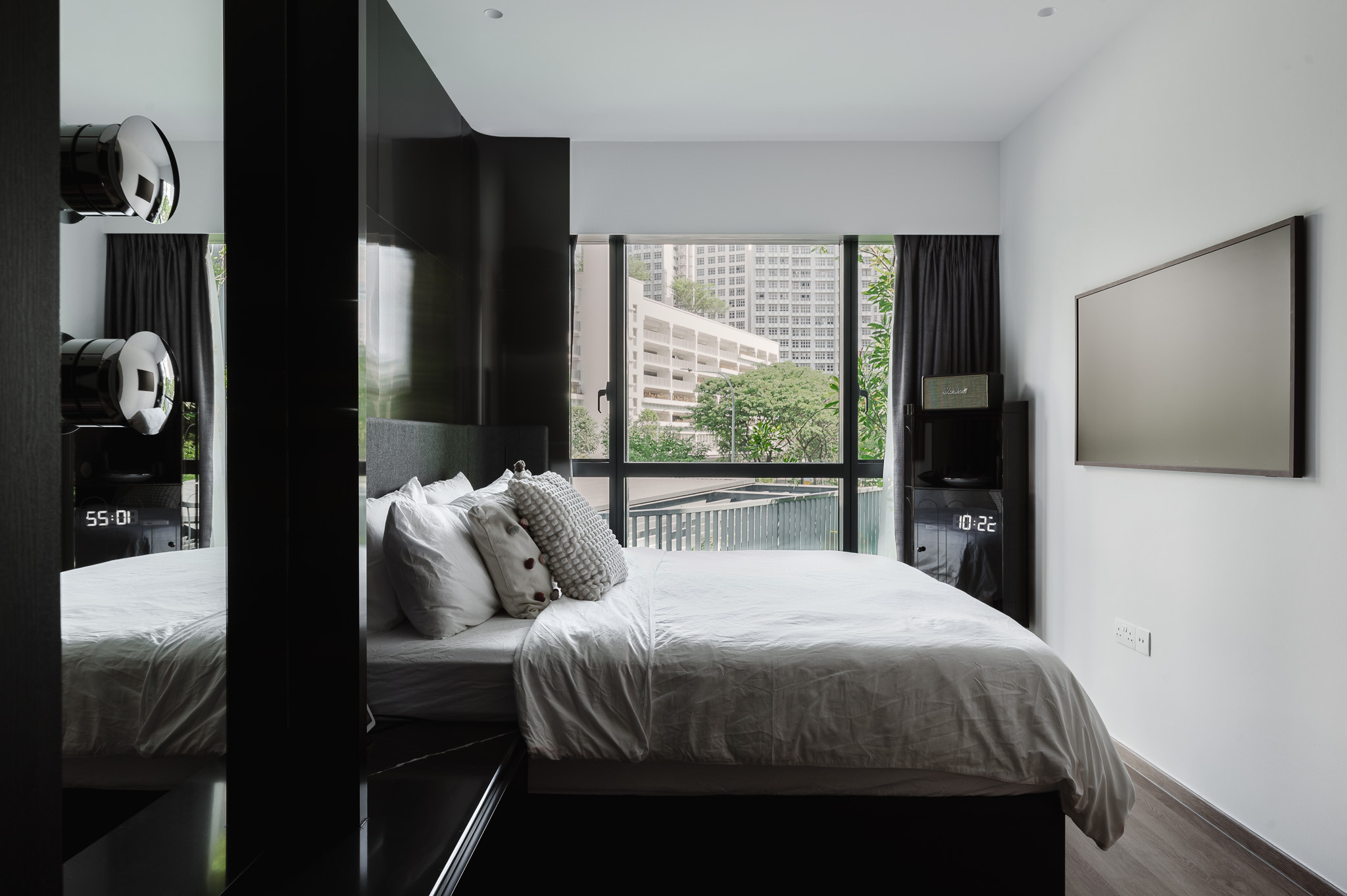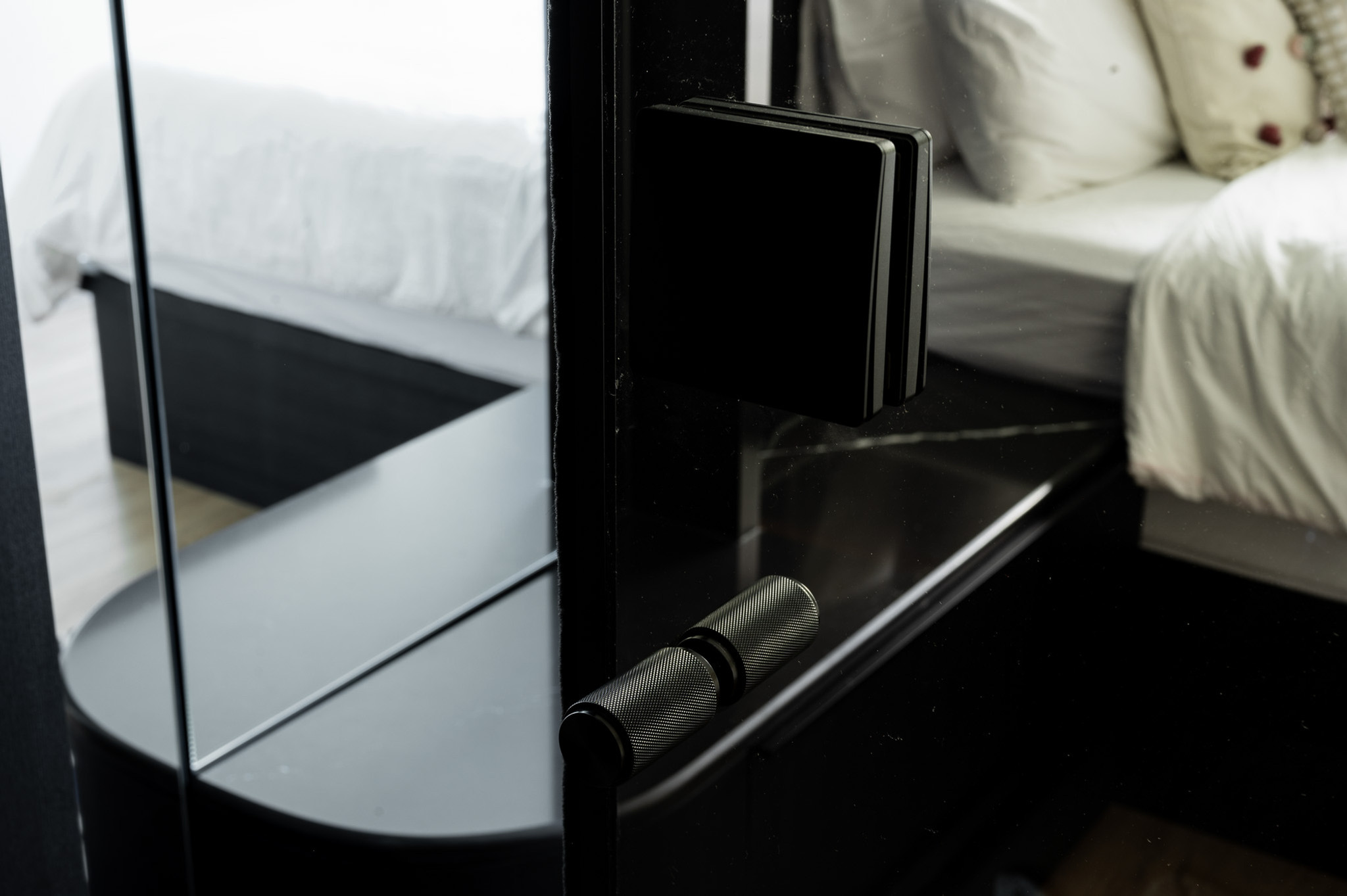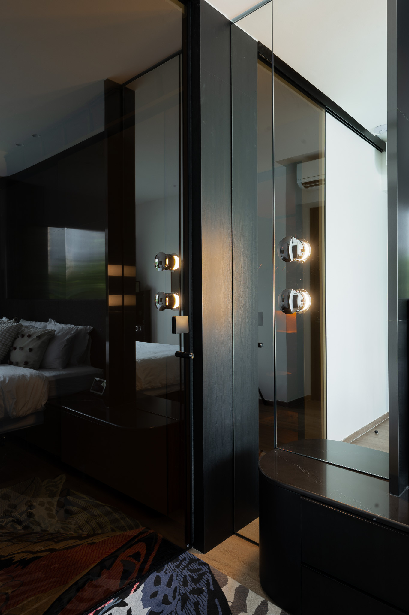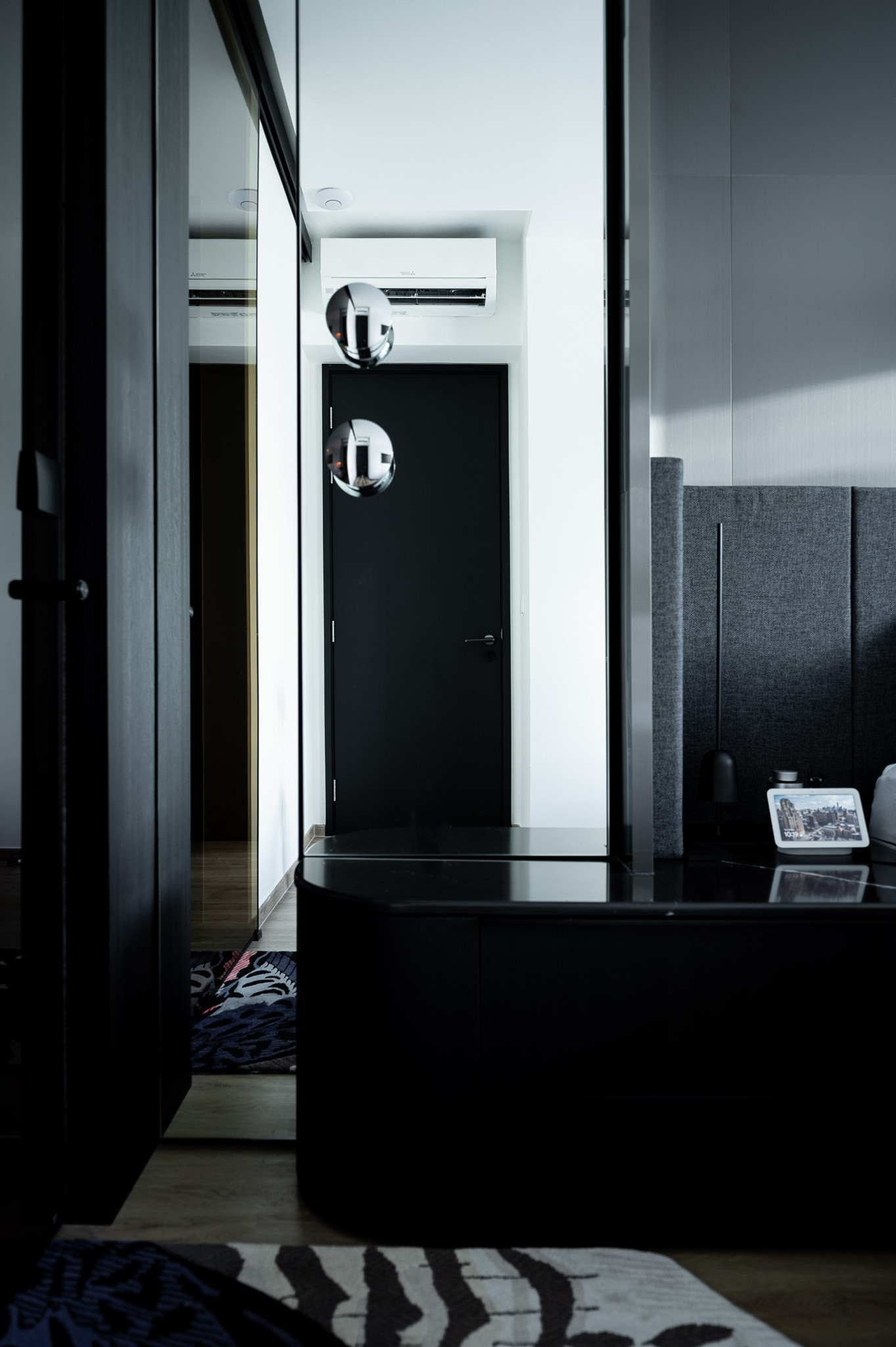 The master suite continues the narrative of Submerged Grandeur with polished black wall cladding behind the bed that shimmers subtly with natural light. A dramatic backdrop of high-gloss panels adds depth while reflecting soft window light and ambient glows. Full-height glazing floods the room with daylight, moderated by blackout curtains for restful sleep.