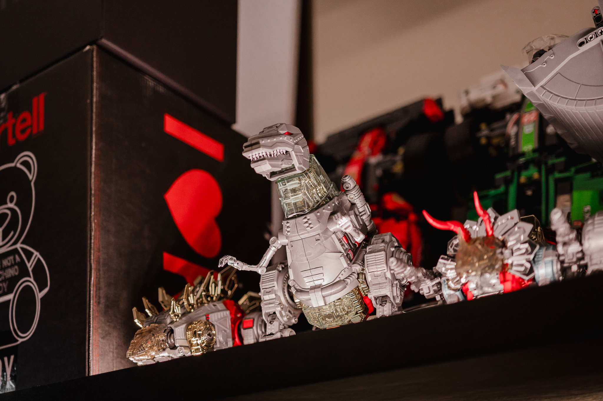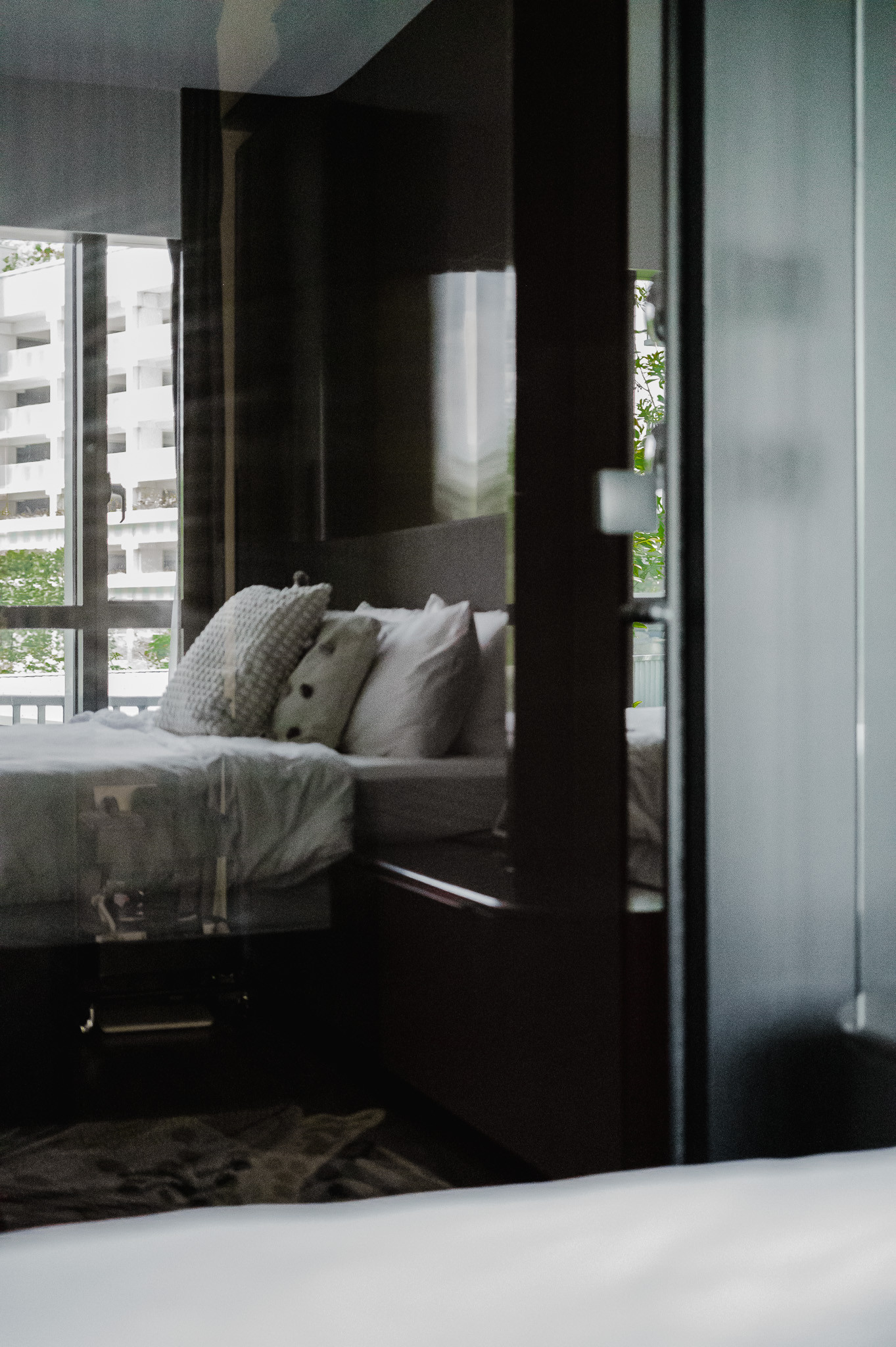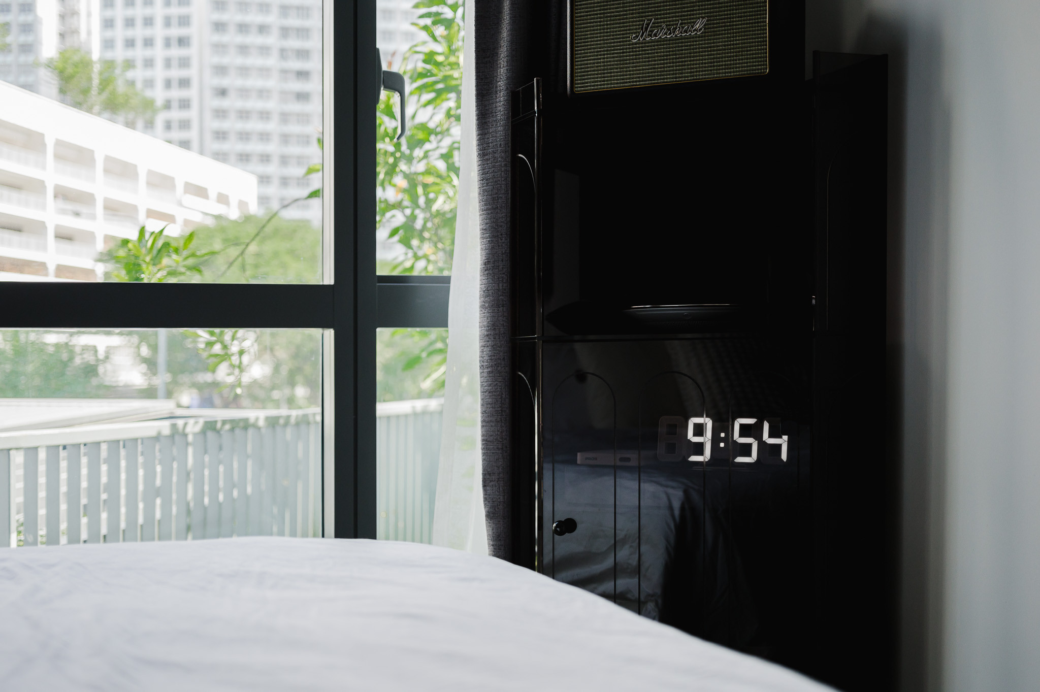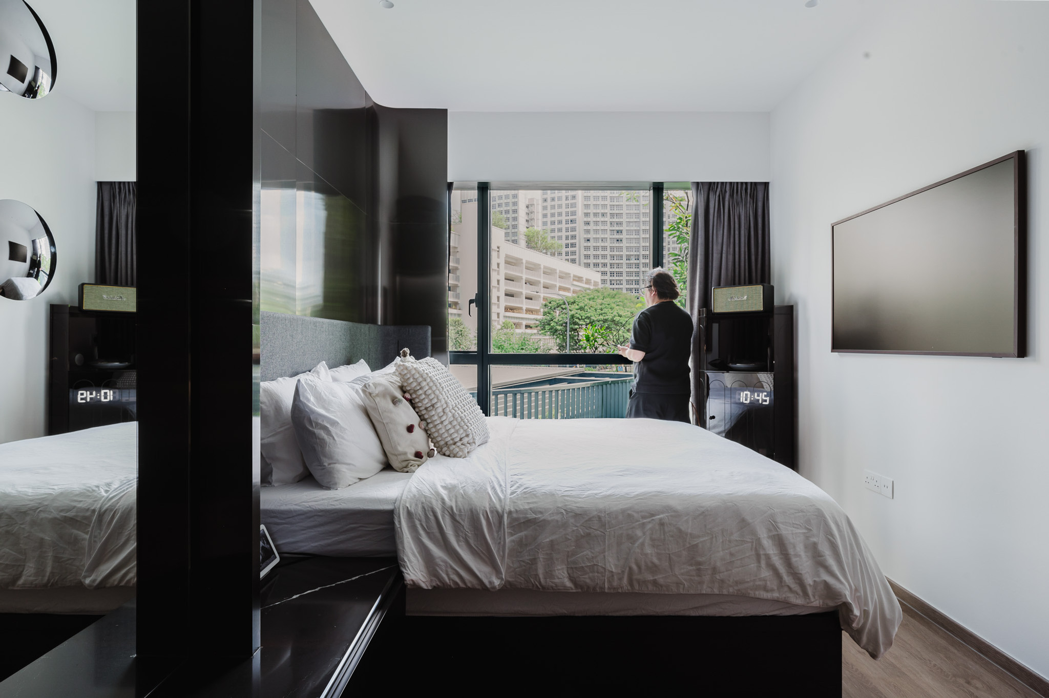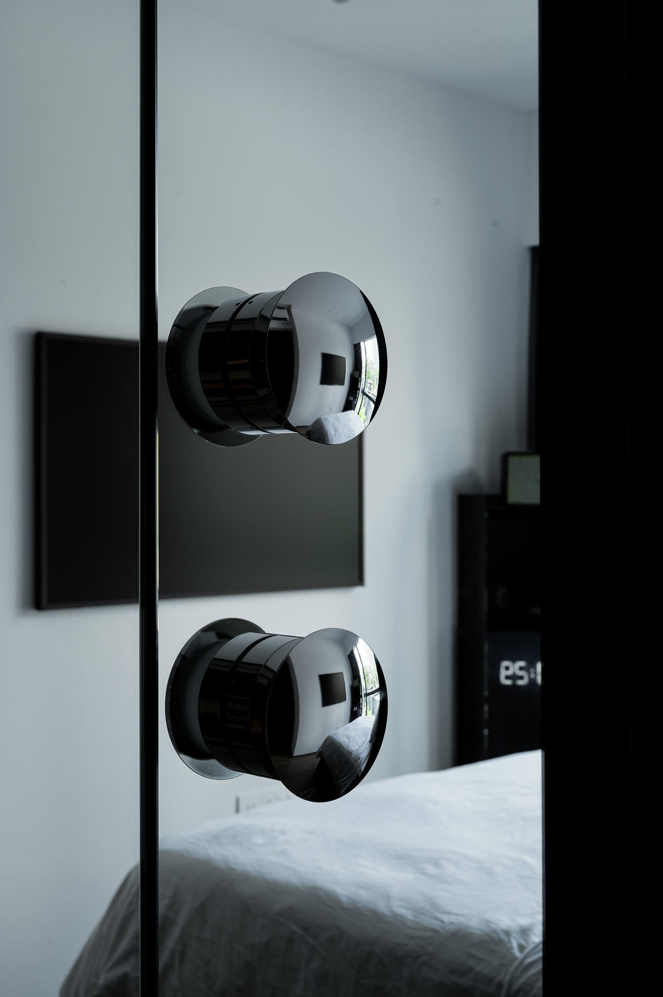 The master suite continues the narrative of Submerged Grandeur with polished black wall cladding behind the bed that shimmers subtly with natural light. A dramatic backdrop of high-gloss panels adds depth while reflecting soft window light and ambient glows. Full-height glazing floods the room with daylight, moderated by blackout curtains for restful sleep.