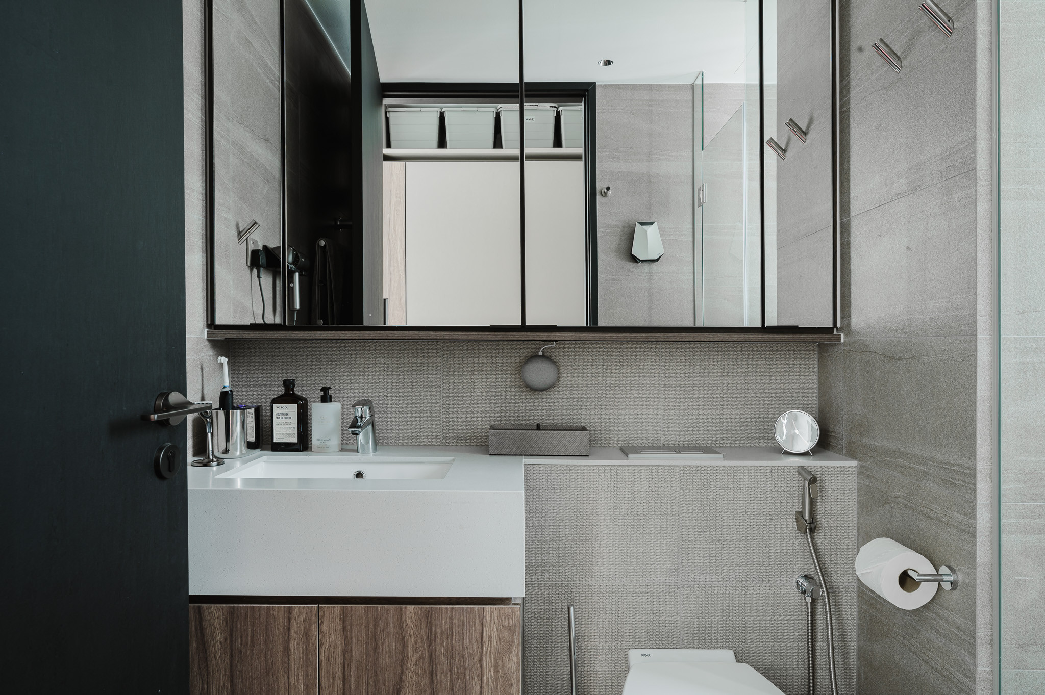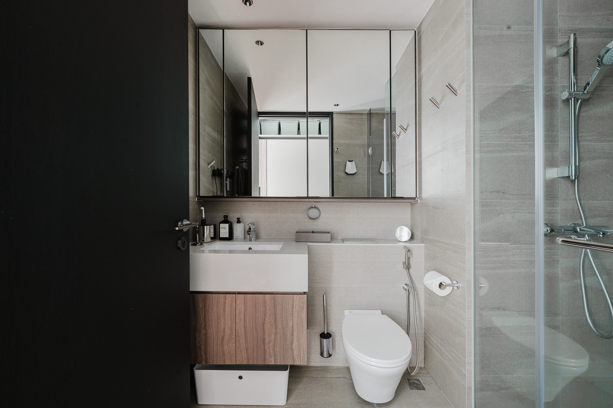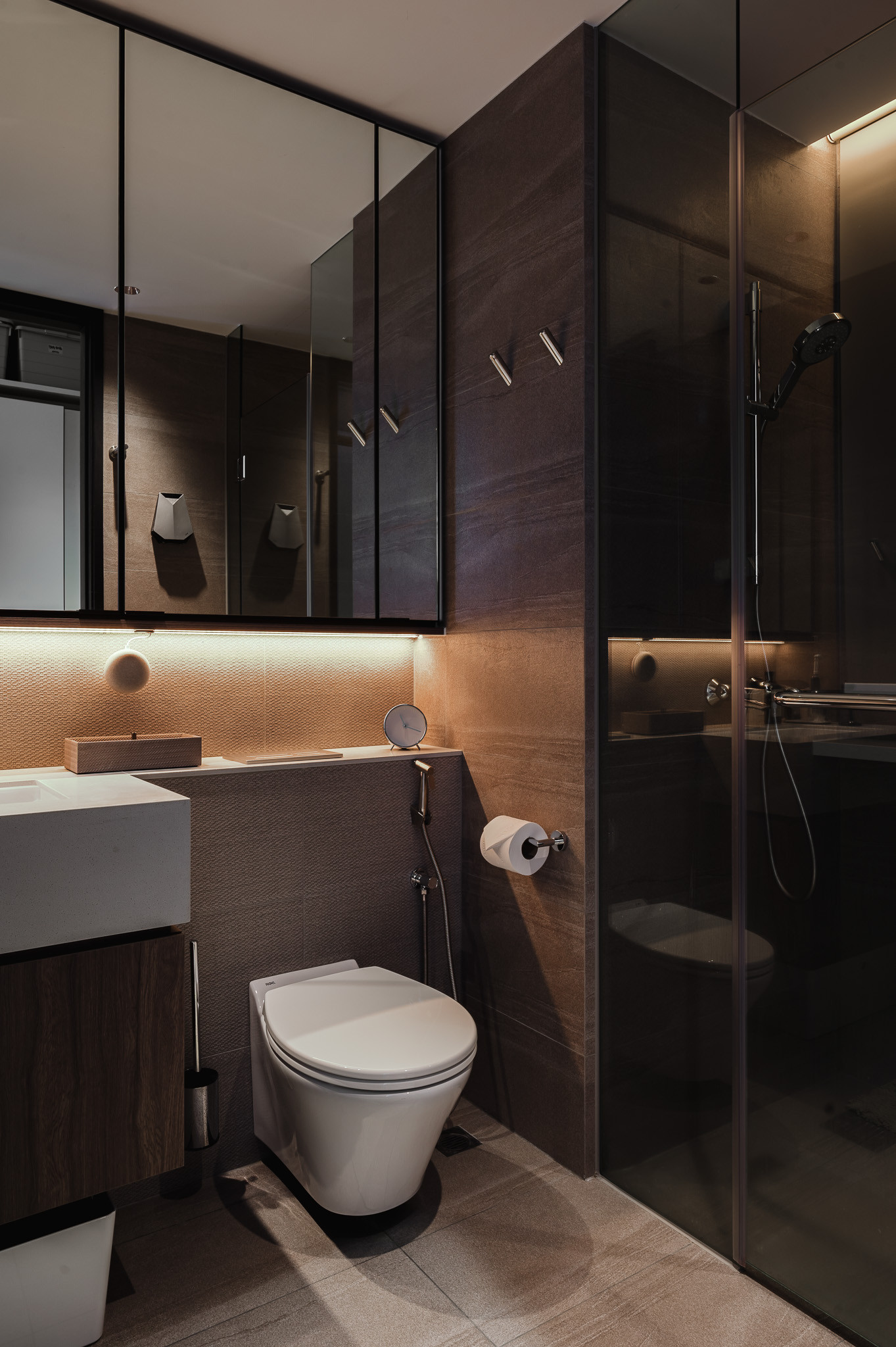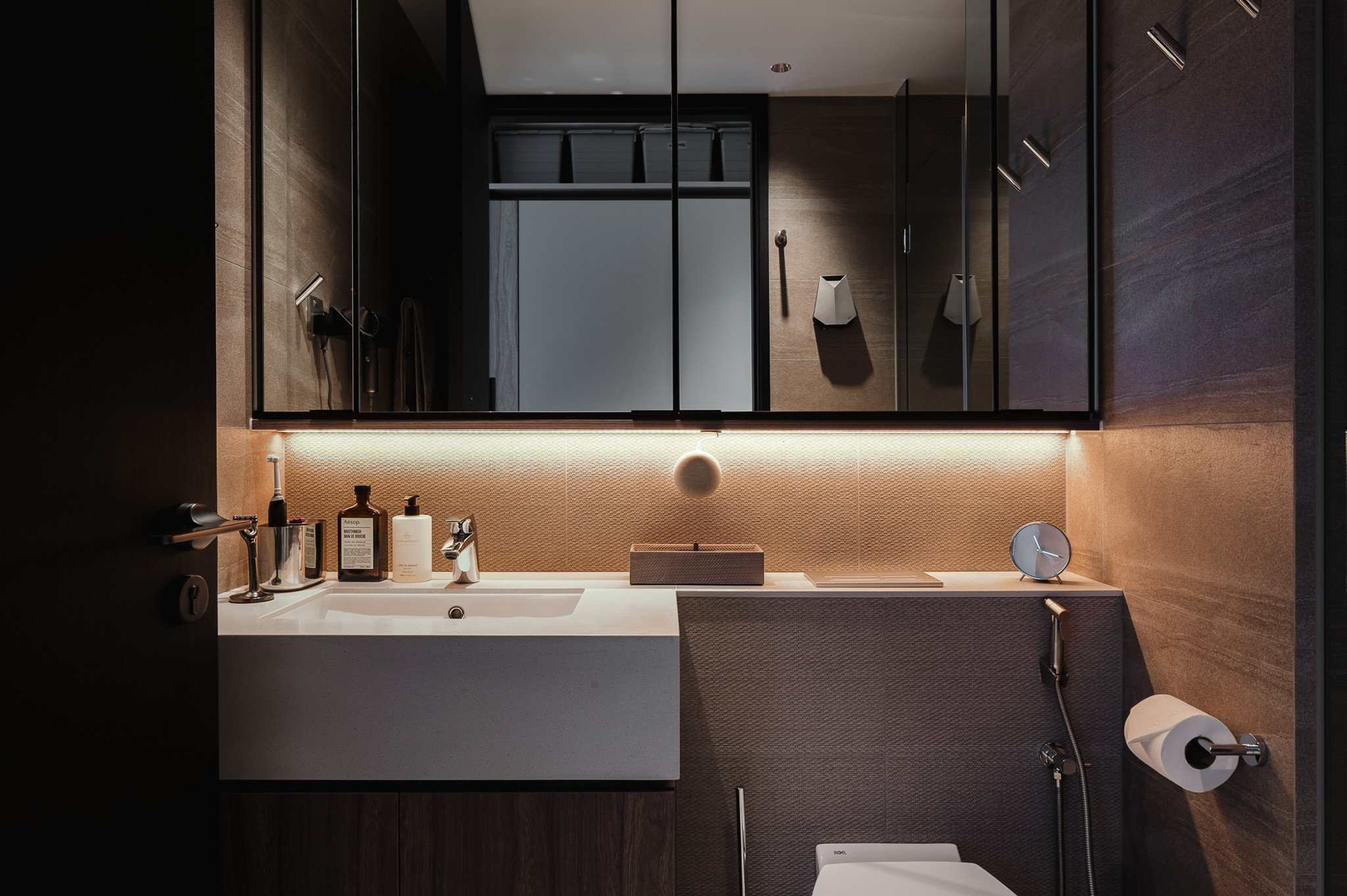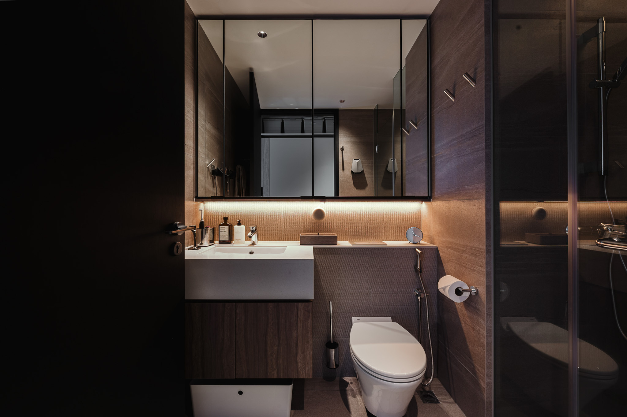 Sanitary fittings are matte black, paired with brushed stainless steel accents to maintain continuity with the rest of the home. Integrated cove lighting under the mirror and vanity adds a sense of weightlessness and spatial clarity. The walk-in shower is wrapped in a seamless slab layout, making it easy to maintain while feeling immersive and luxurious.