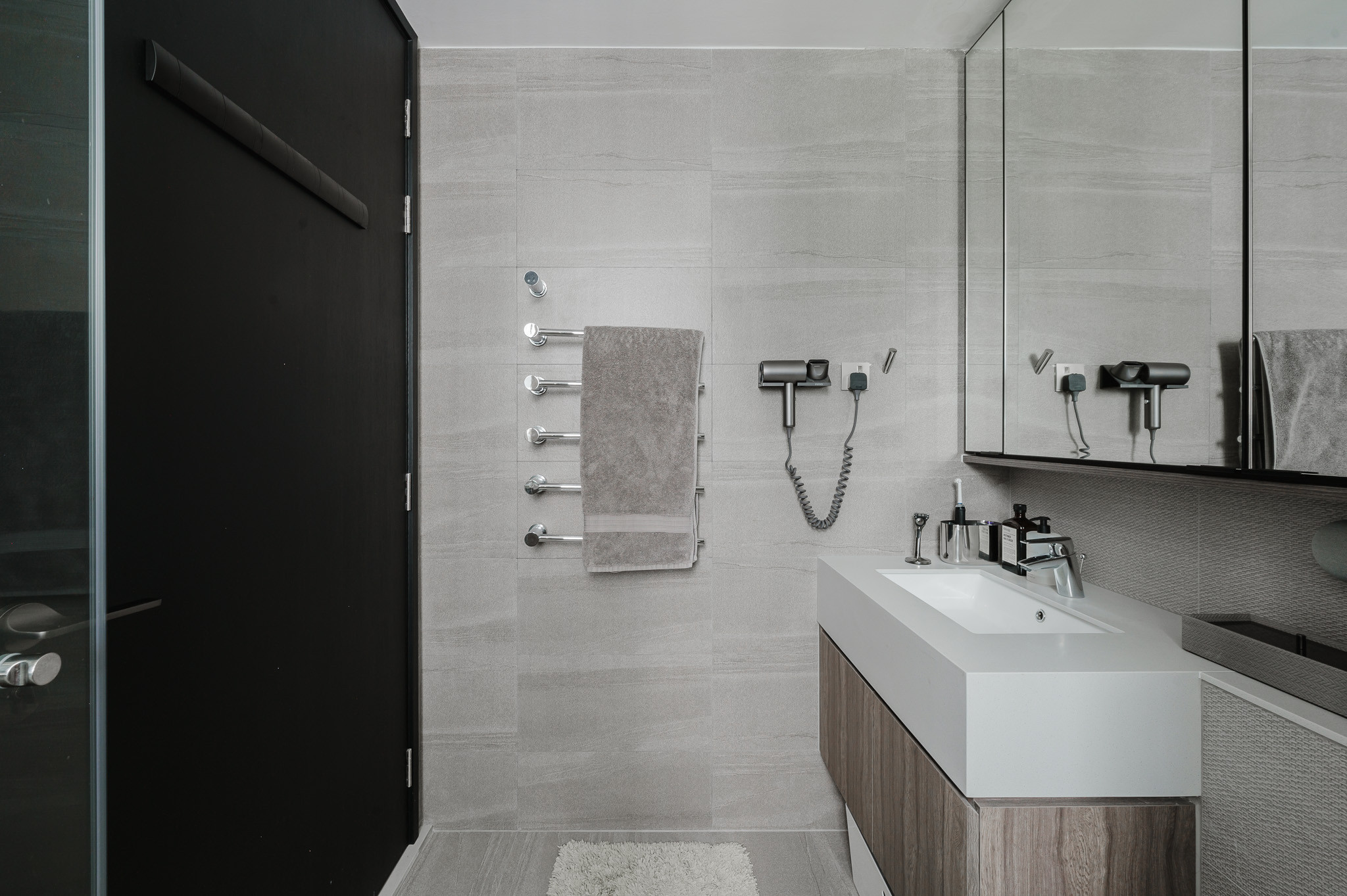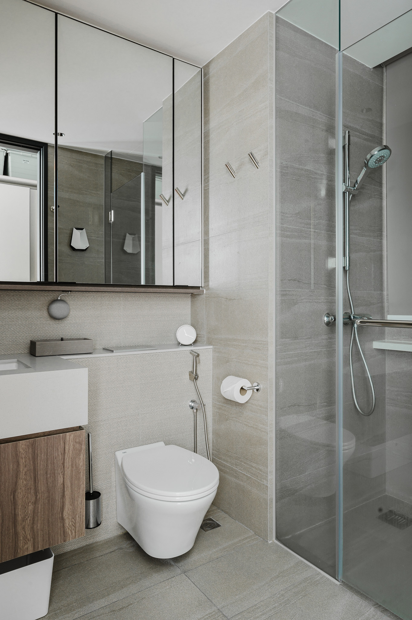 The bathroom is designed to feel like a private retreat — a contemporary grotto of calm. Walls are clad in mid-tone grey stone, textured with a soft matte finish for a natural touch. A fabric-texture stone feature wall introduces subtle tactility and visual softness, anchoring the shower area in calmness.
