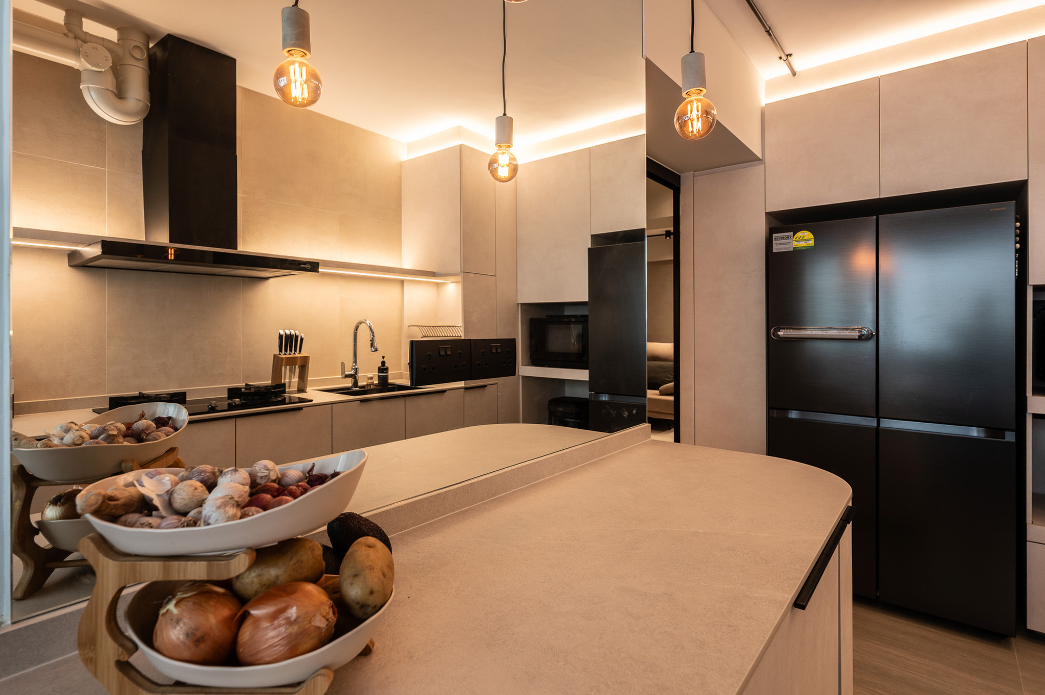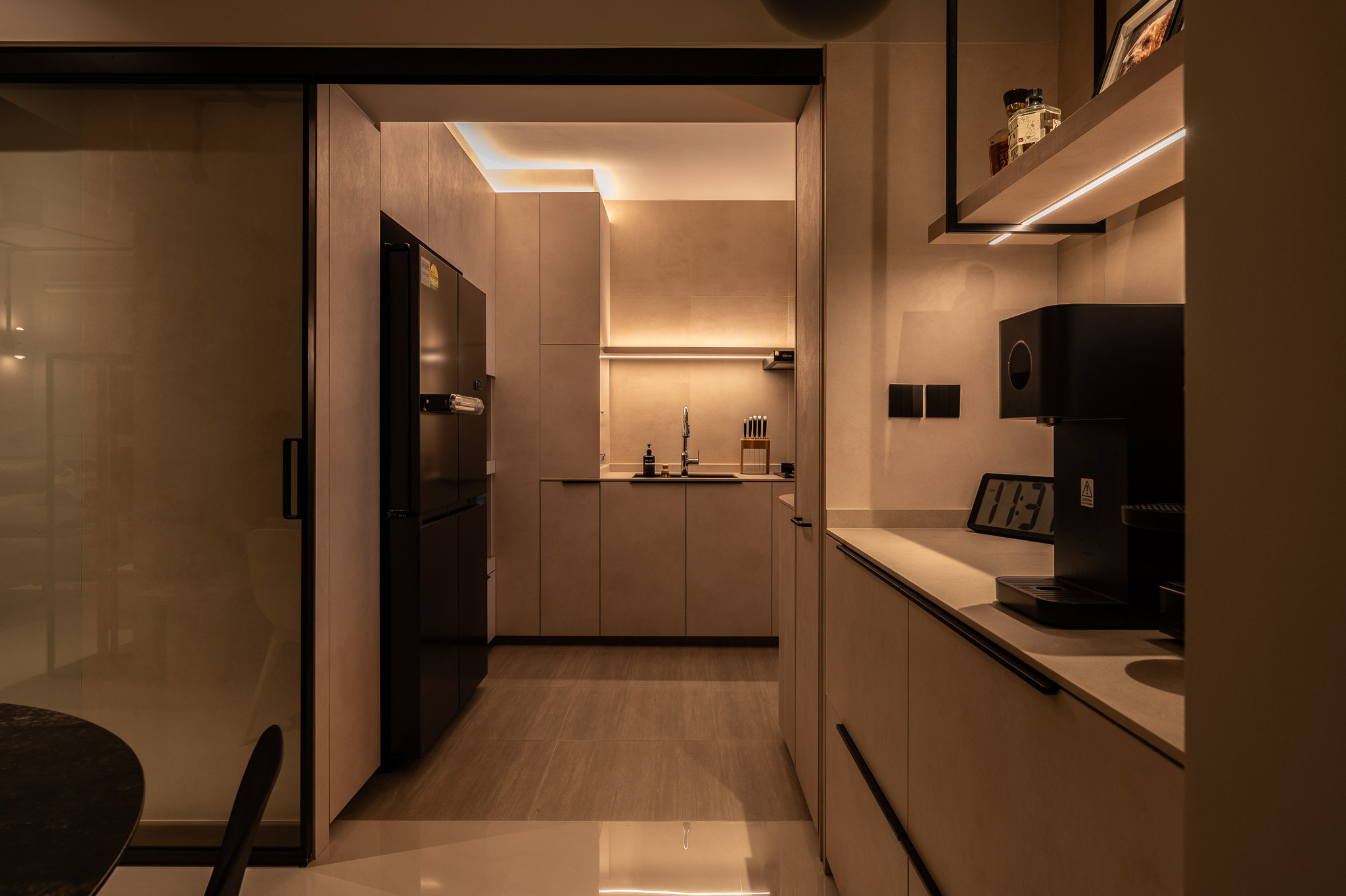 The heart of the home is its expressive materiality. Concrete finishes, matte black frames, and warm-toned wood form the foundation, creating a grounded backdrop for everyday life. Modern elements—sleek cabinetry, refined lighting profiles, and smooth architectural forms—introduce clarity and sophistication, ensuring the space feels fresh rather than rugged.