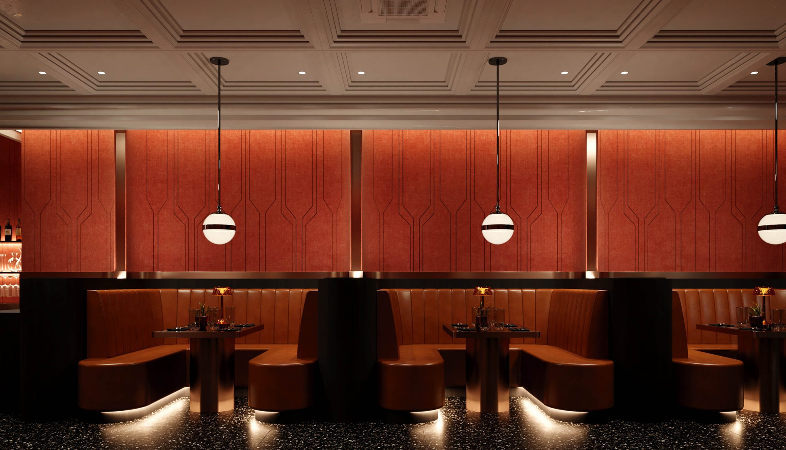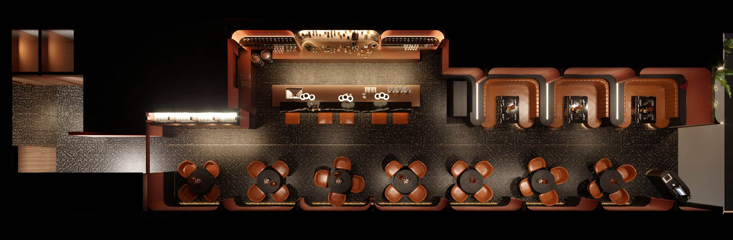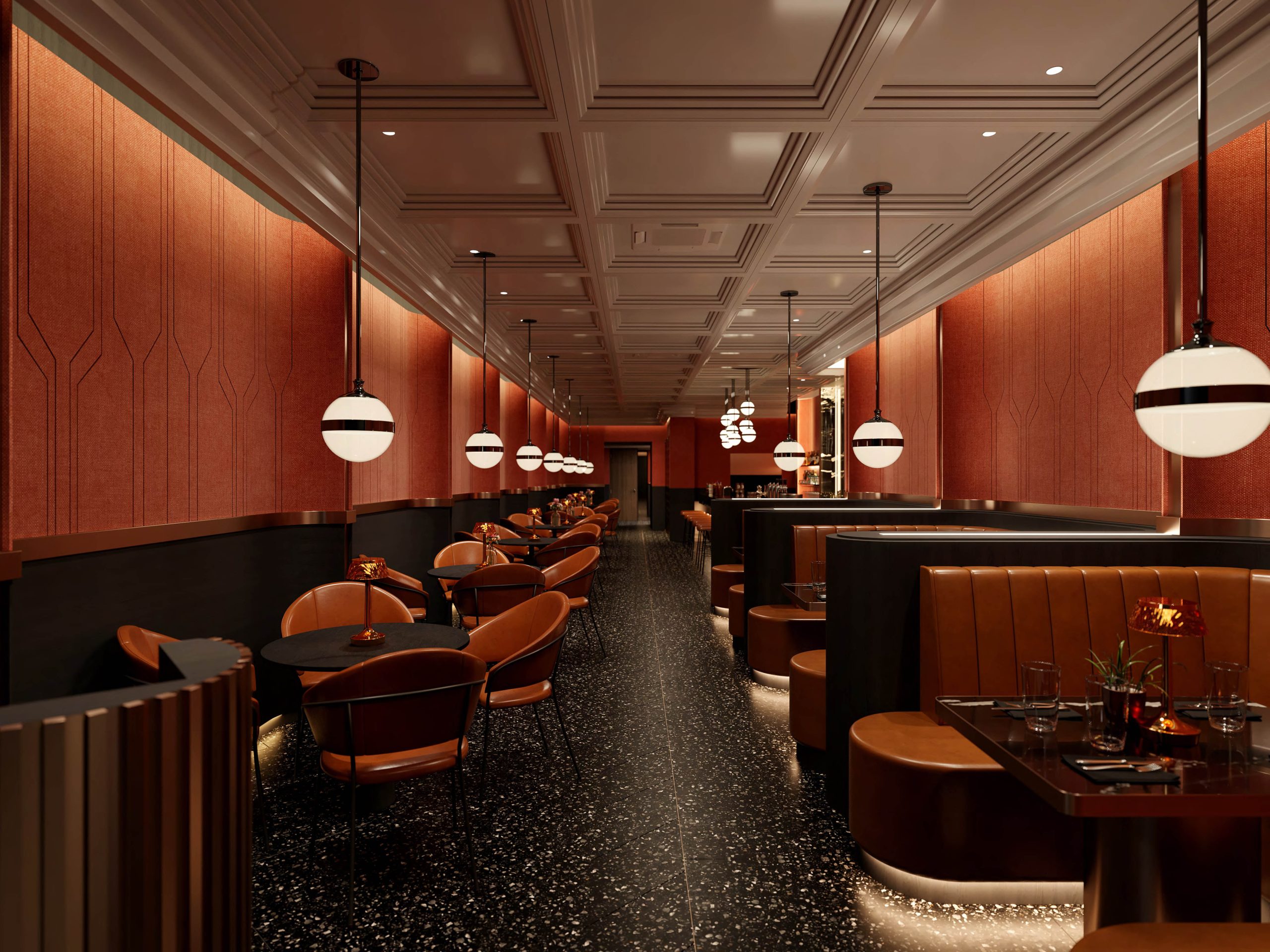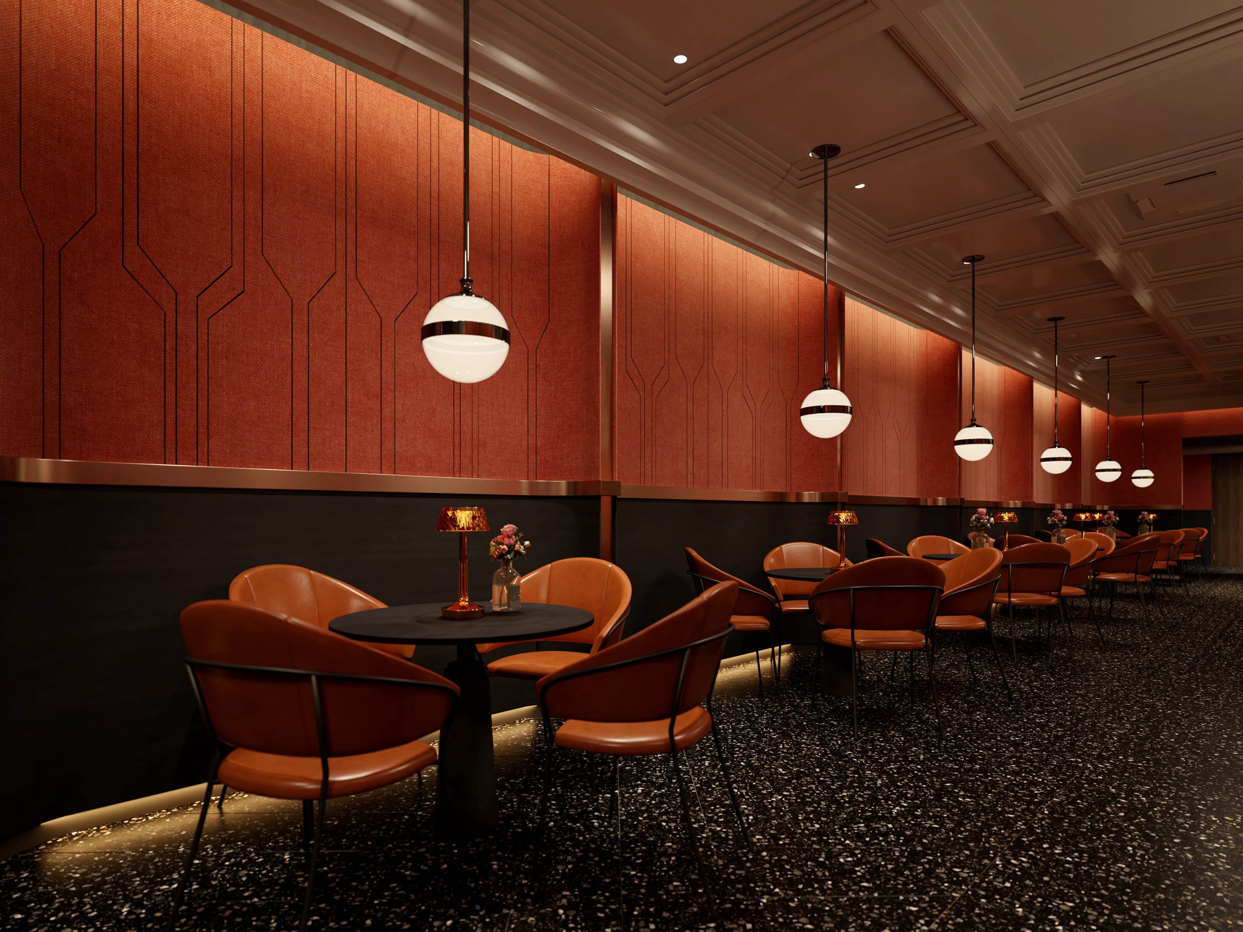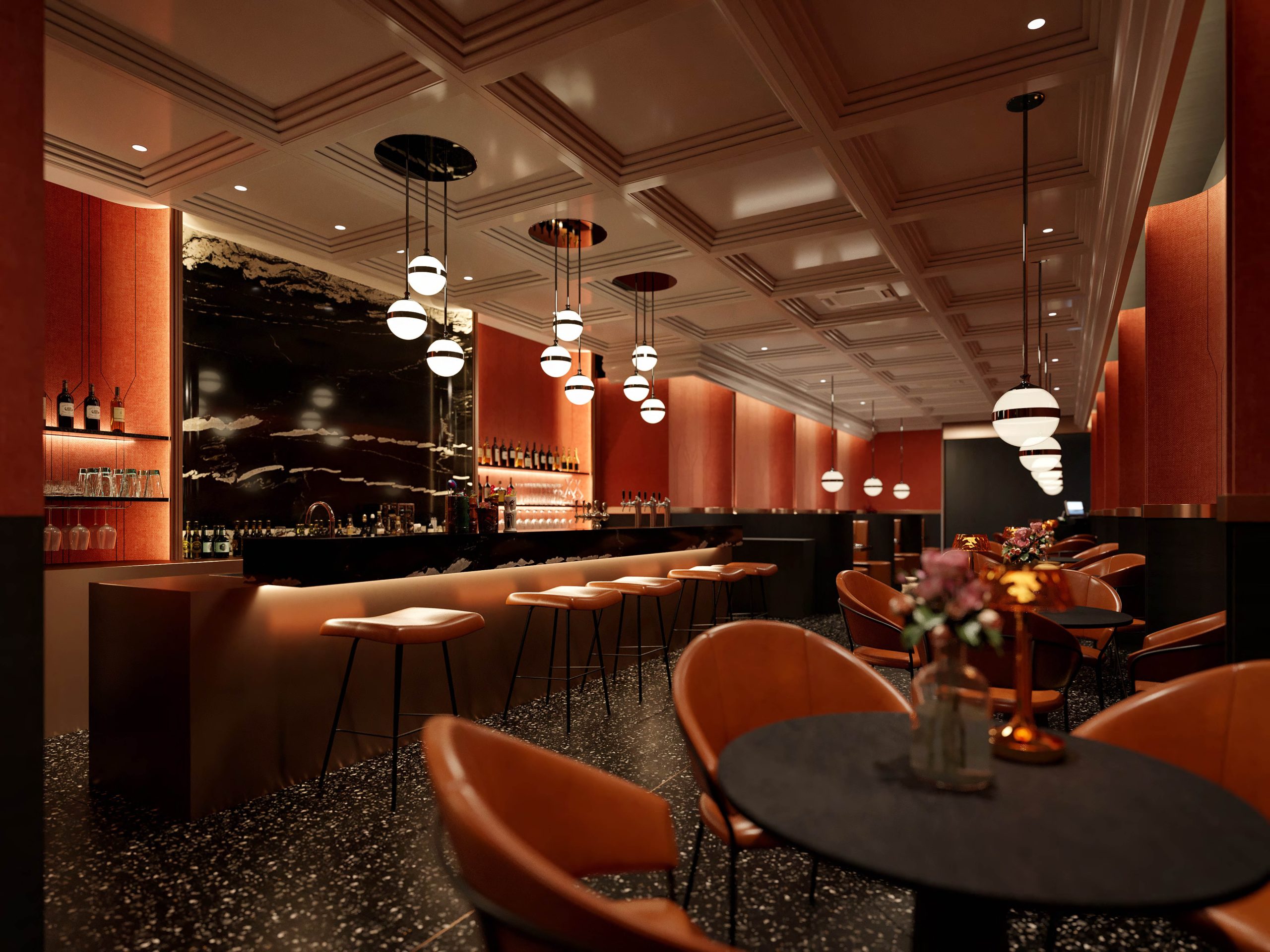 Erstudio is crafting a bistro that perfectly balances luxury with a humble charm, using a deep, sophisticated color palette of deep orange, rose gold, and black. The deep orange adds warmth and energy, creating an inviting and lively atmosphere. Rose gold introduces a touch of elegance and refinement, subtly enhancing the luxurious feel of the space without overwhelming it. Black serves as a grounding element, providing depth and contrast, and bringing a modern, bold edge to the overall design.