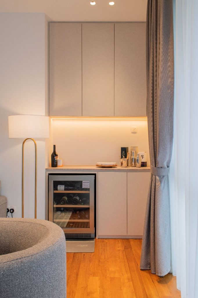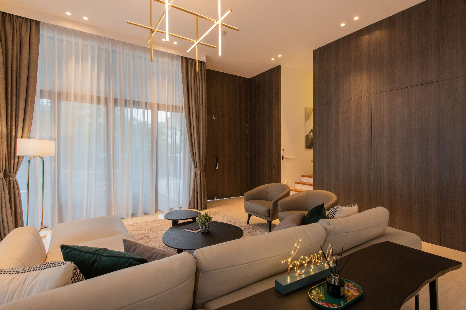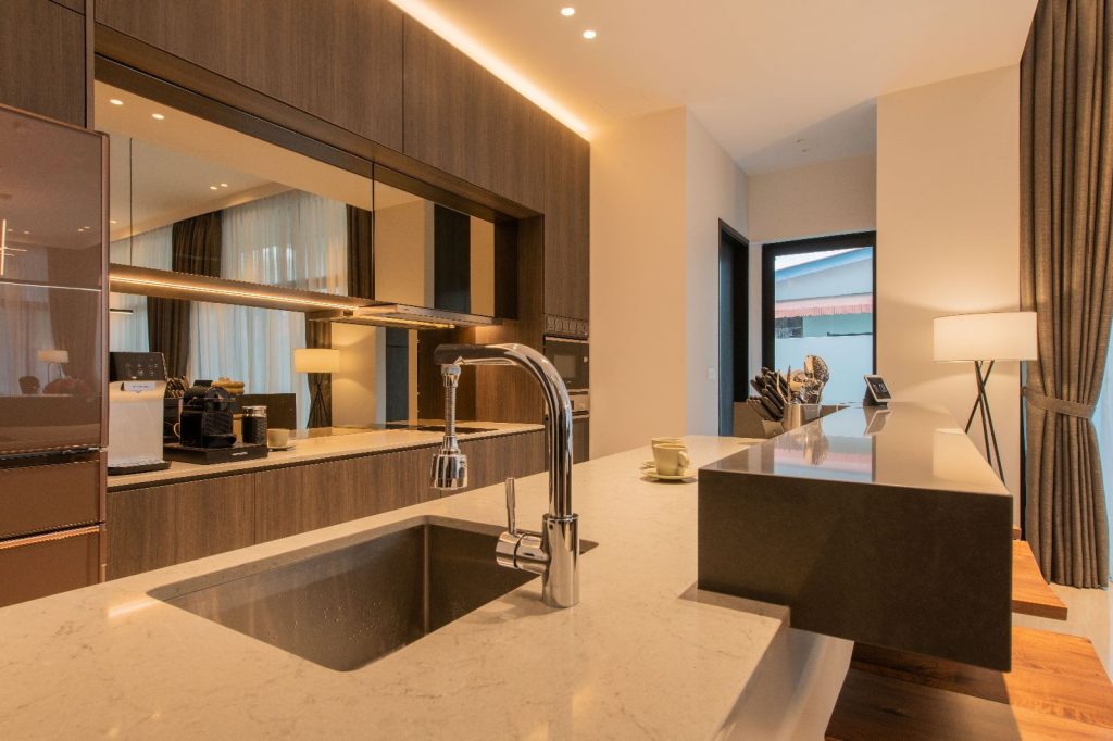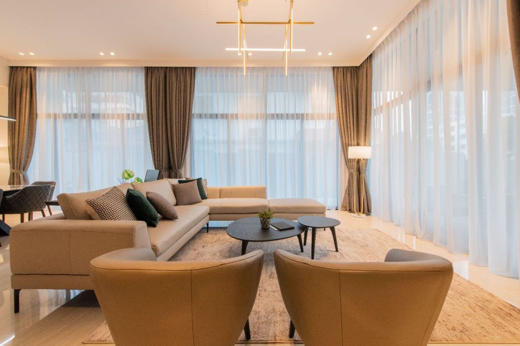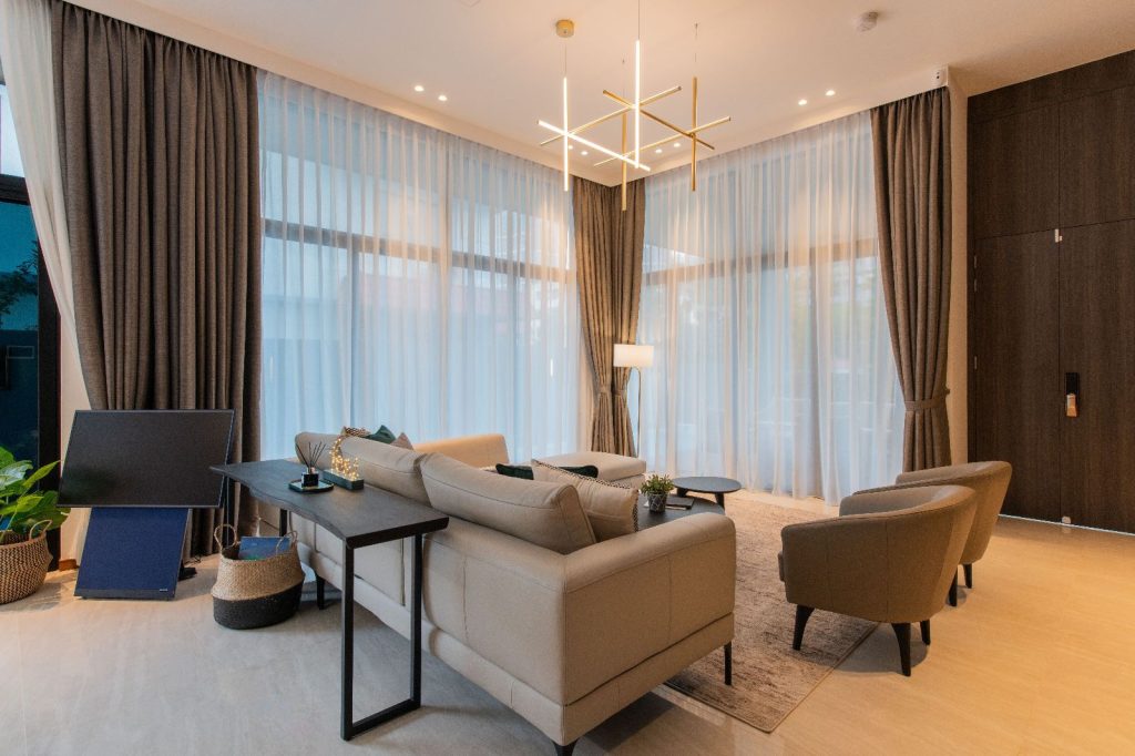 The architectural essence of the home is contemporary luxury. The aesthetic is clean and sophisticated, promising a style that transcends time. It’s an investment in a space they plan to call home for decades to come. Earthy tones have been chosen to harmonize with the house’s exterior, creating a consistent design language throughout the residence.